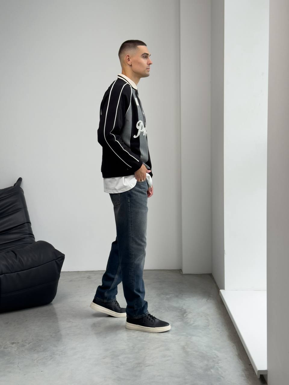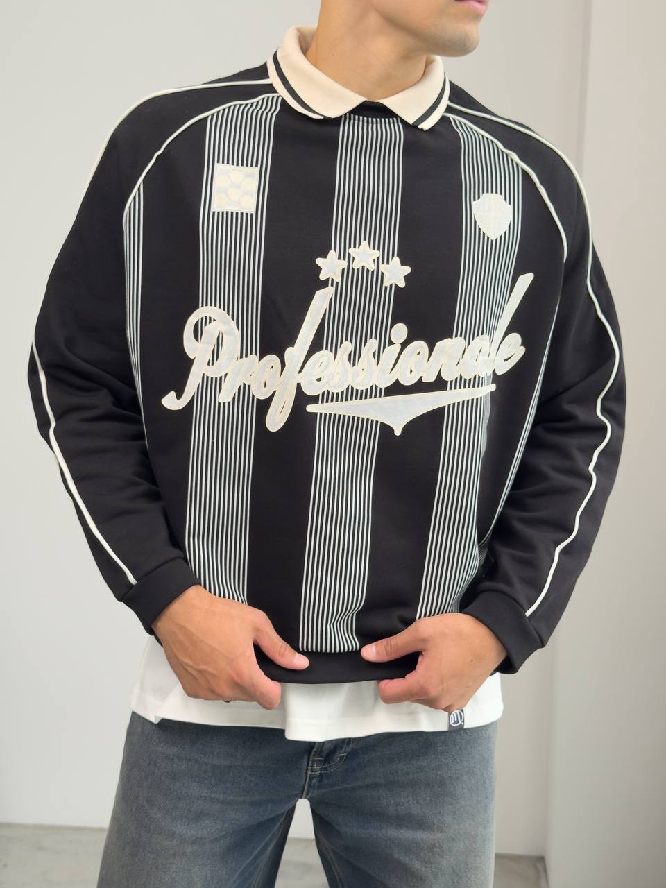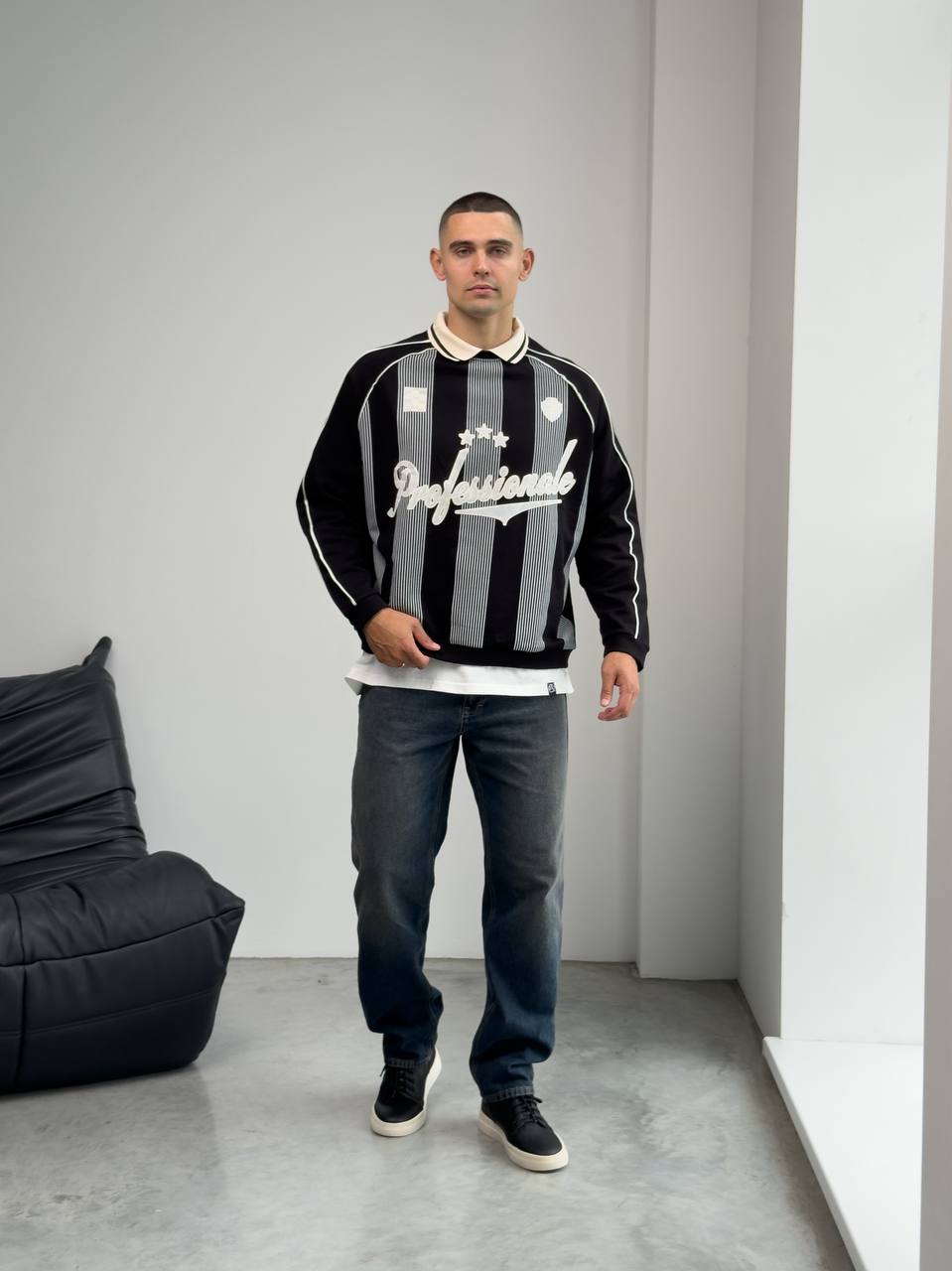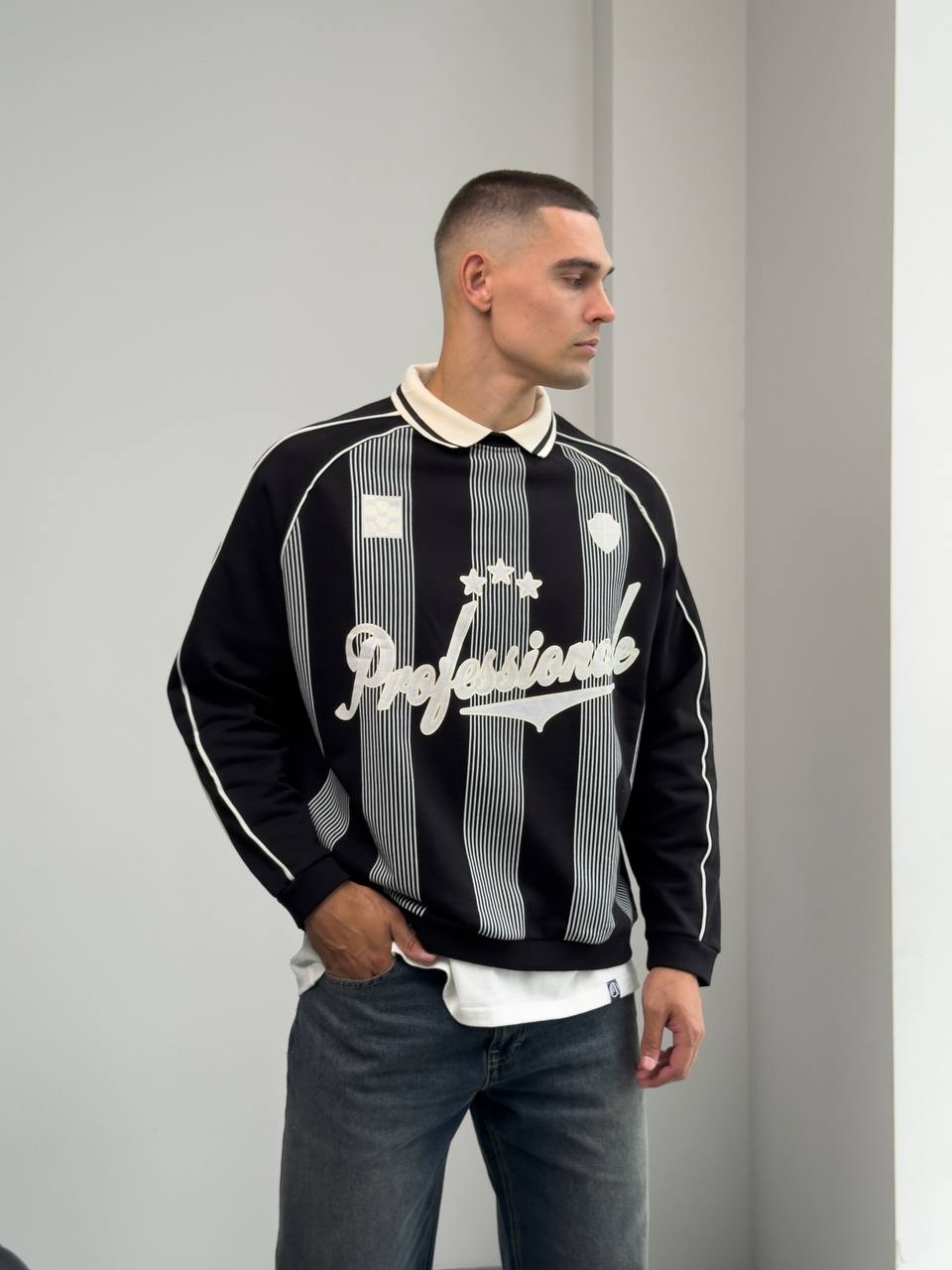 Чоловічий Чорний Світшот Реглан Поло Оверсайз з Принтом та Кантом