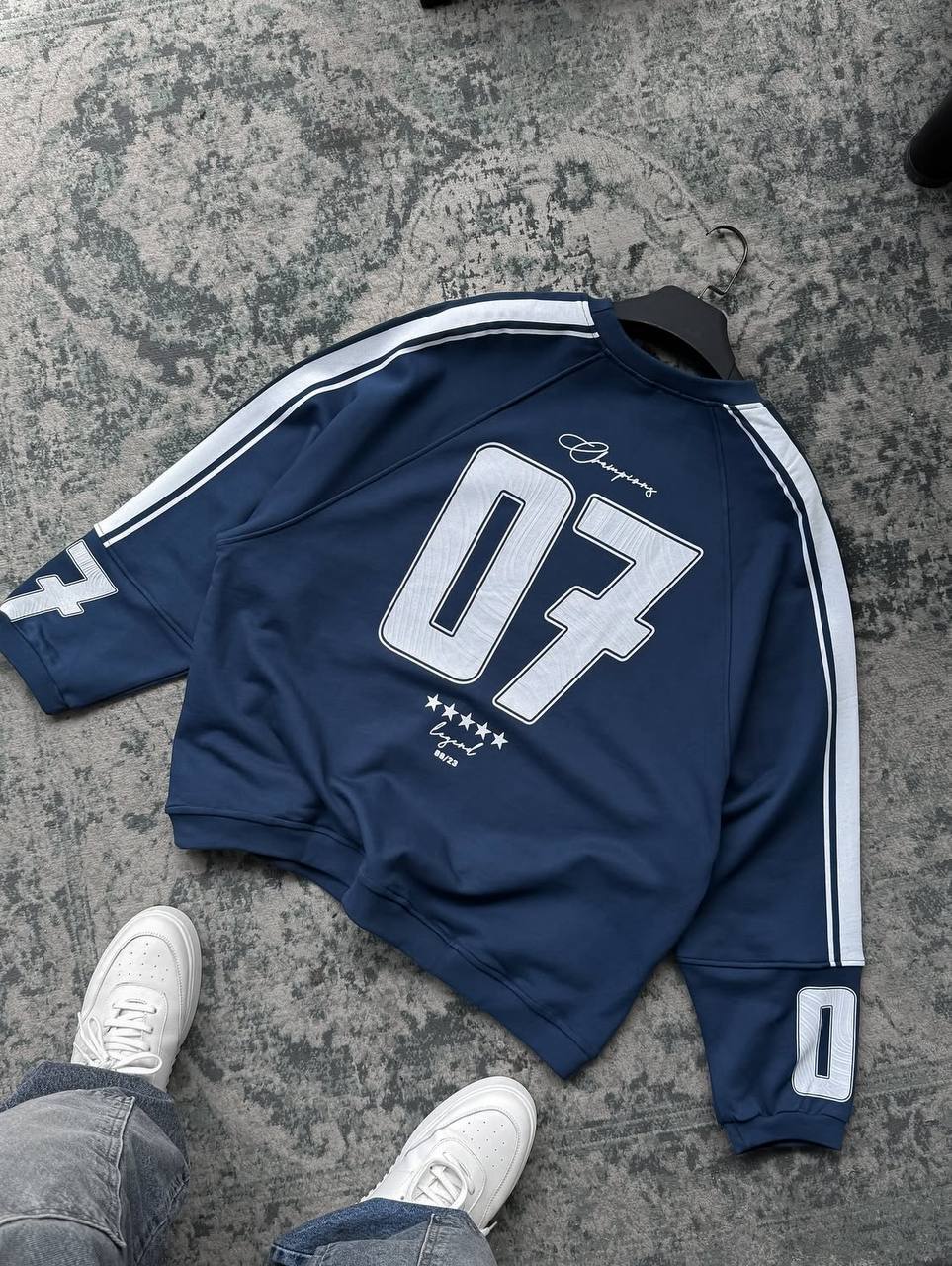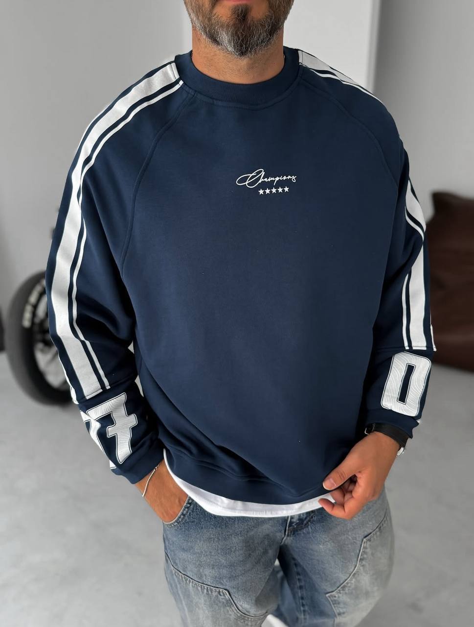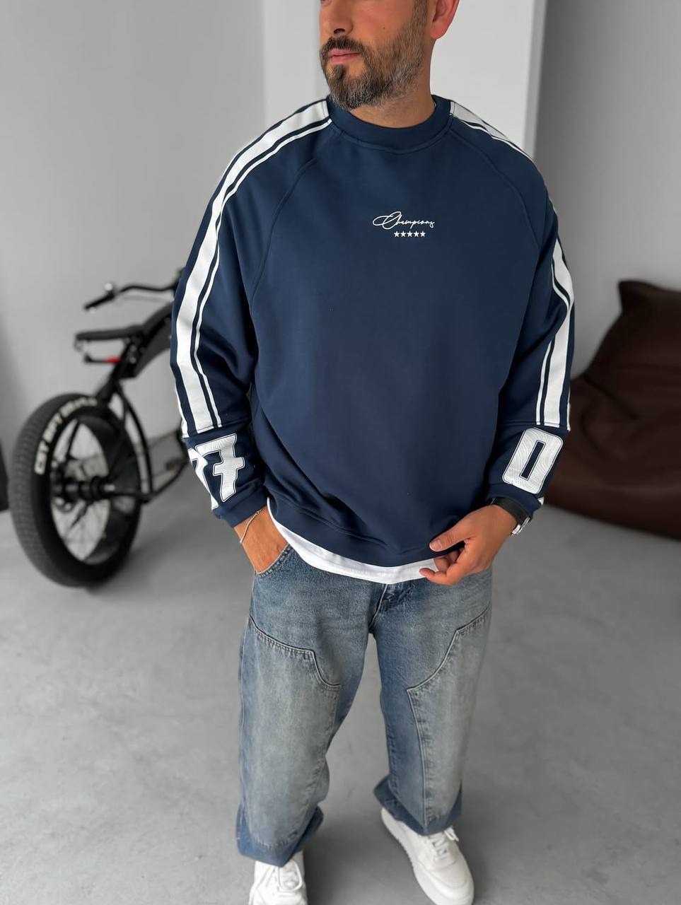Чоловічий Синій Світшот Реглан Оверсайз з Лампасами та Принтом Номером на Спині