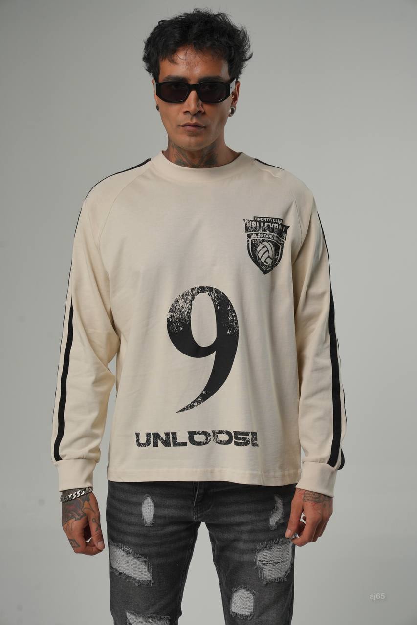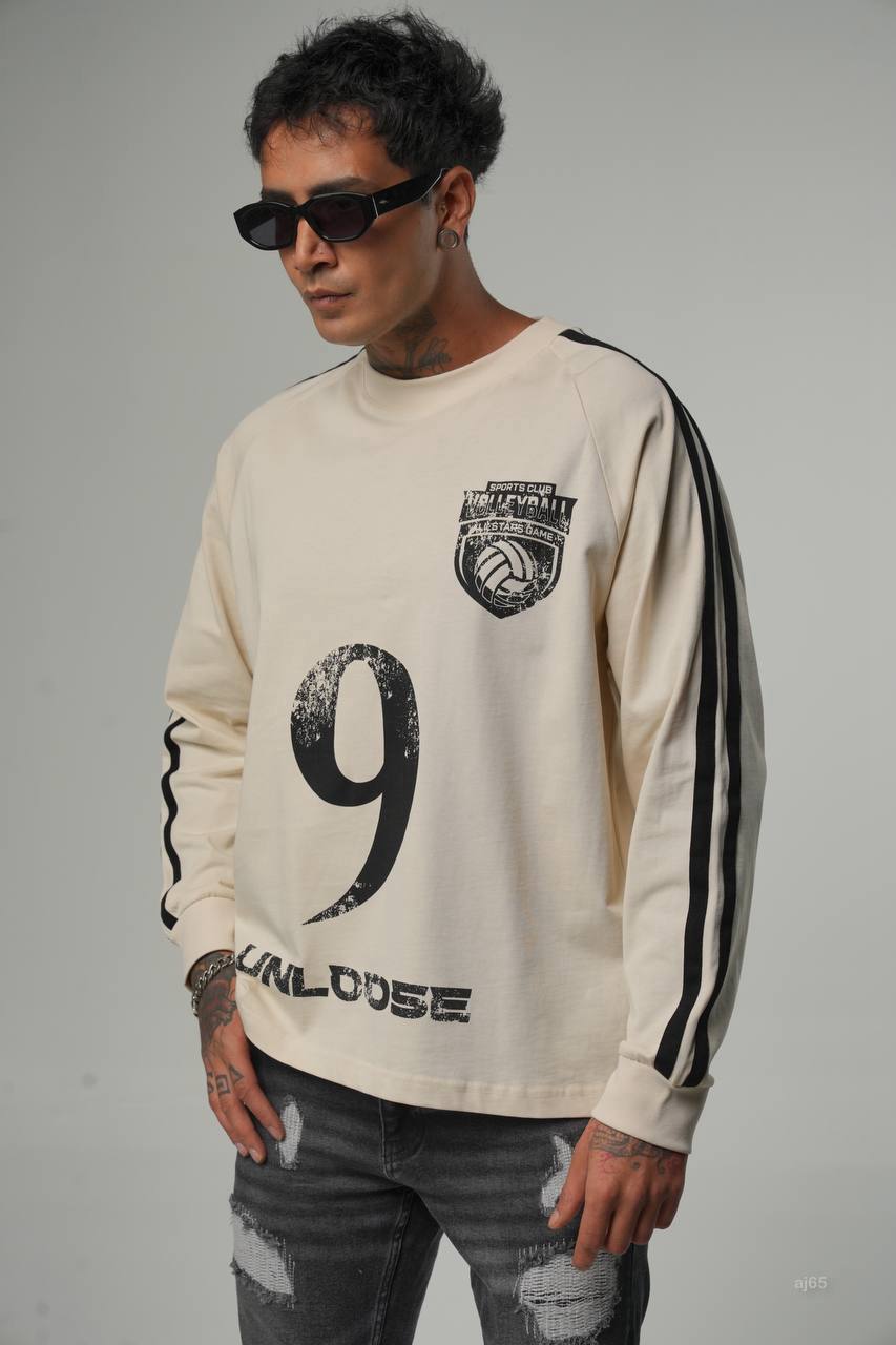 Чоловічий Вільний Бежевий Світшот з Принтом Номером та Смужками на Рукавах