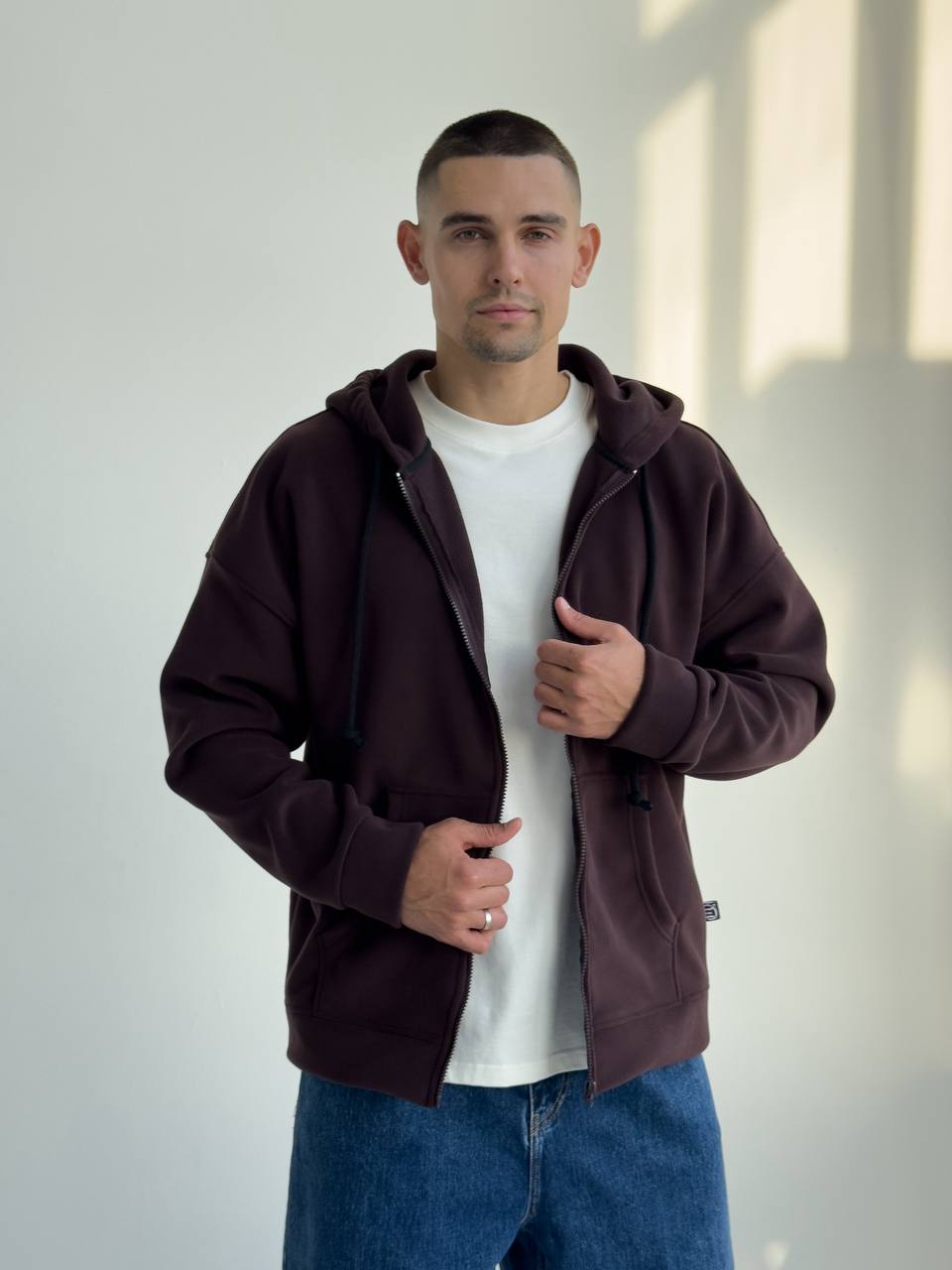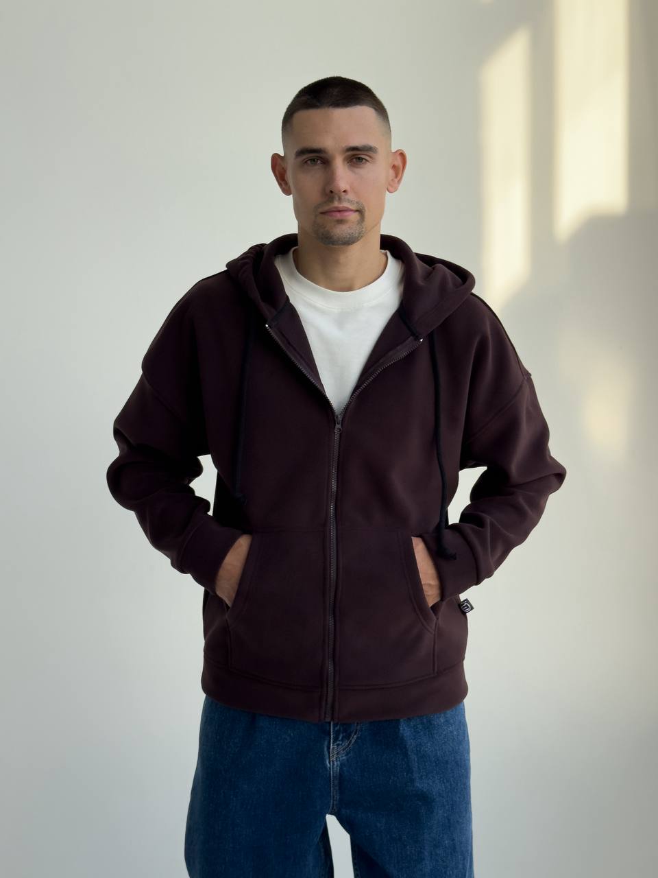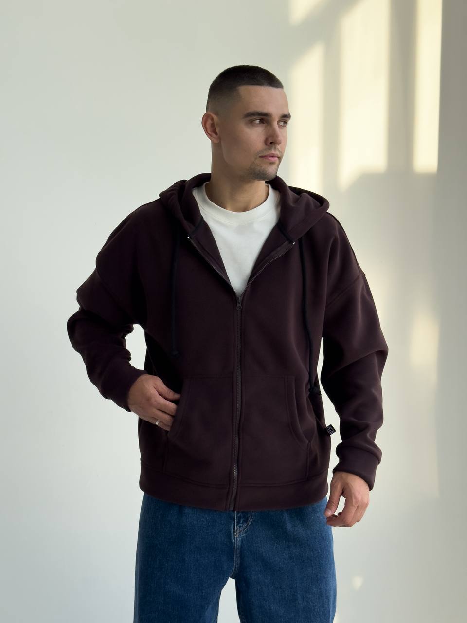 Чоловіча Тепла Коричнева Зіп Кофта – Флісове Худі на Блискавці з Капюшоном