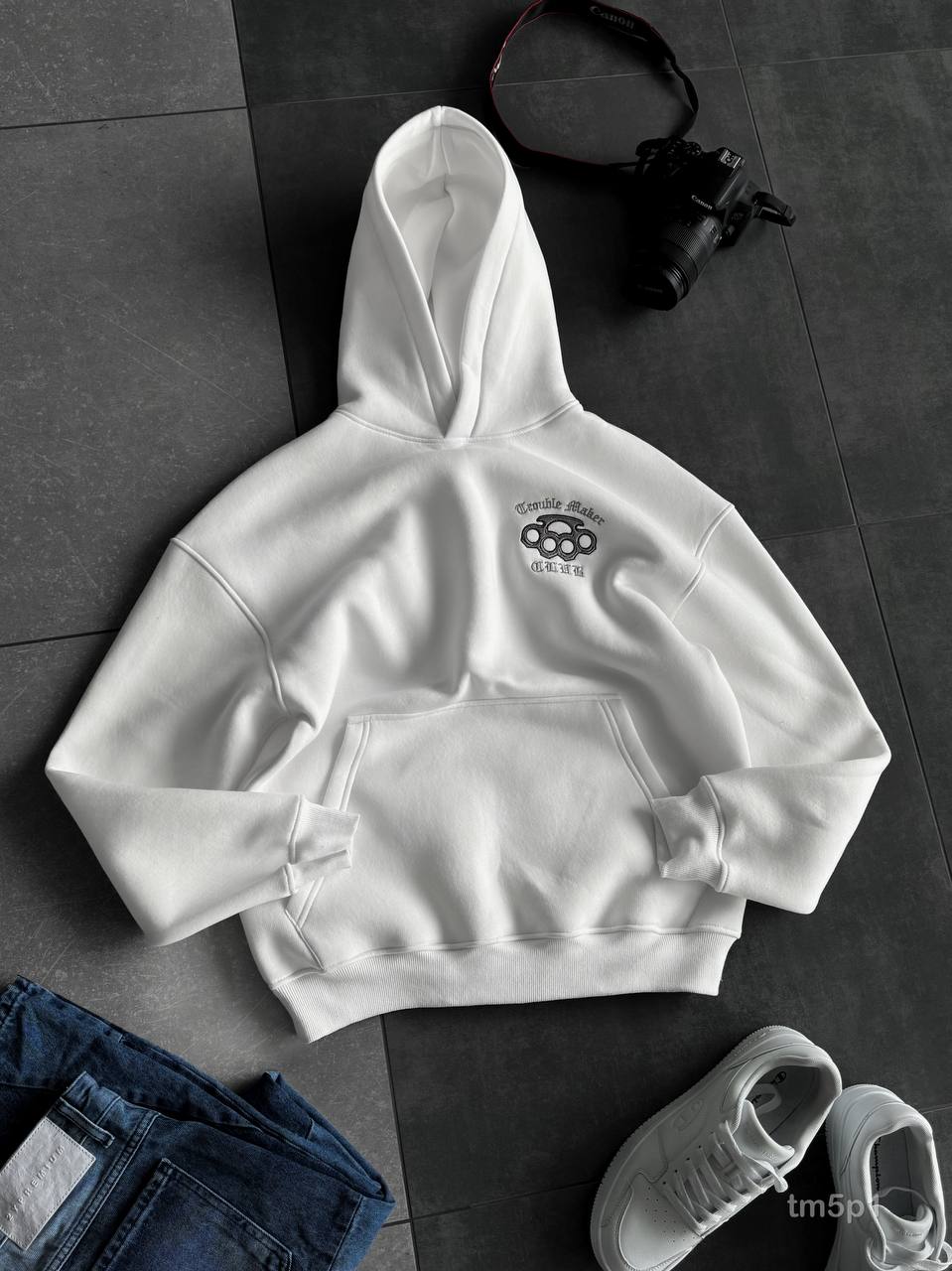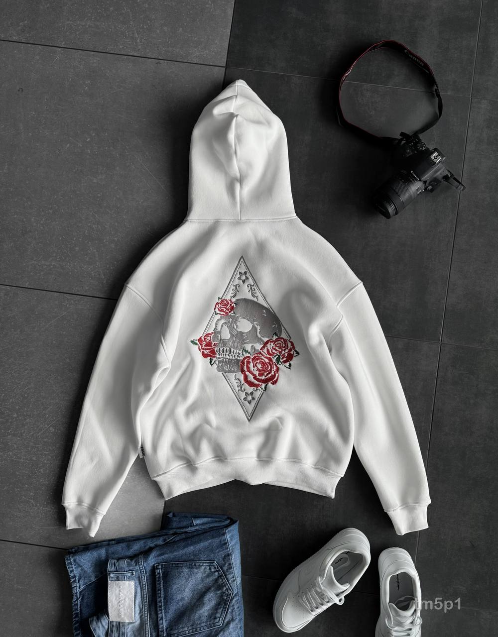 Чоловіче Біле Худі Утеплене на Флісі – Оверсайз з Вишивкою Череп у Трояндах