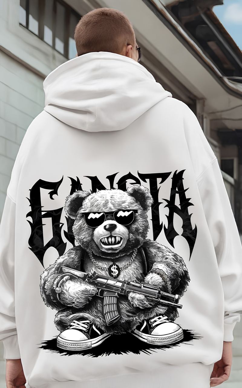 Чоловіче Біле Худі Вільного Крою – Тринитка з Принтом Ведмідь Гангстер