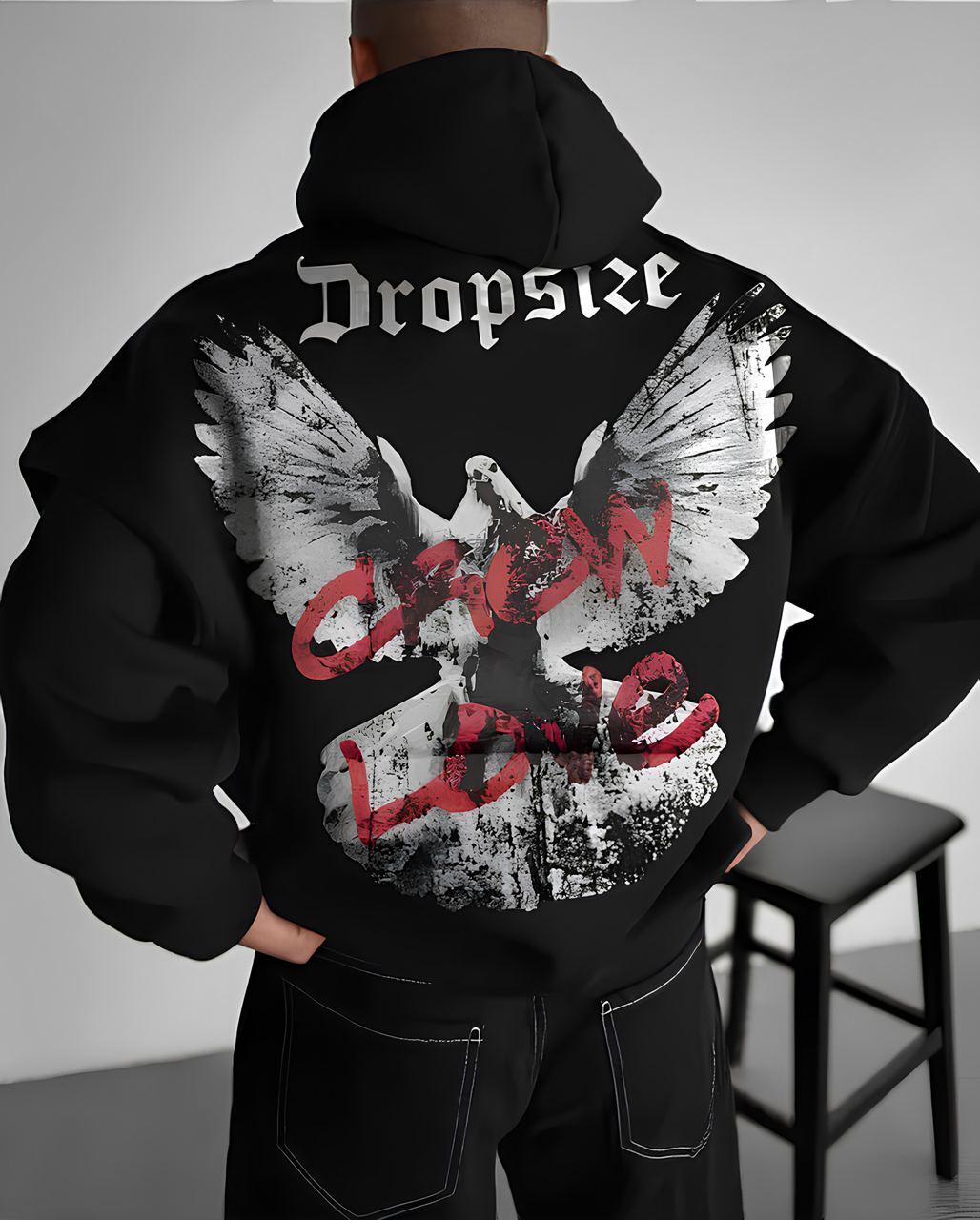 Чоловіче Чорне Худі Вільного Крою – Тринитка з Принтом Голуб