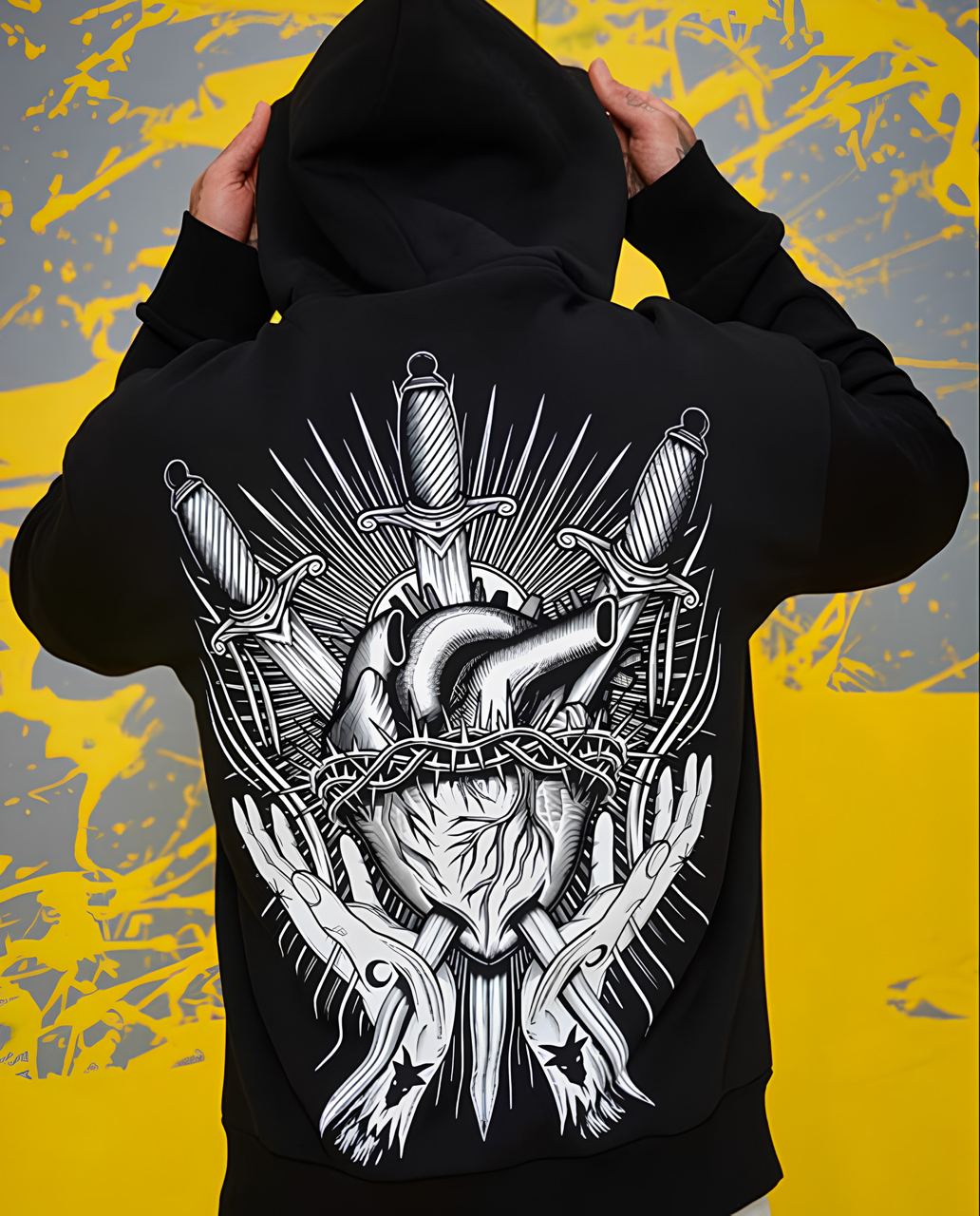 Чоловіче Чорне Худі Вільного Крою – Тринитка з Принтом Серце із Мечами