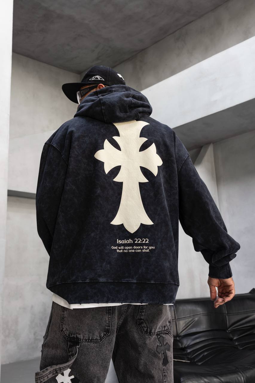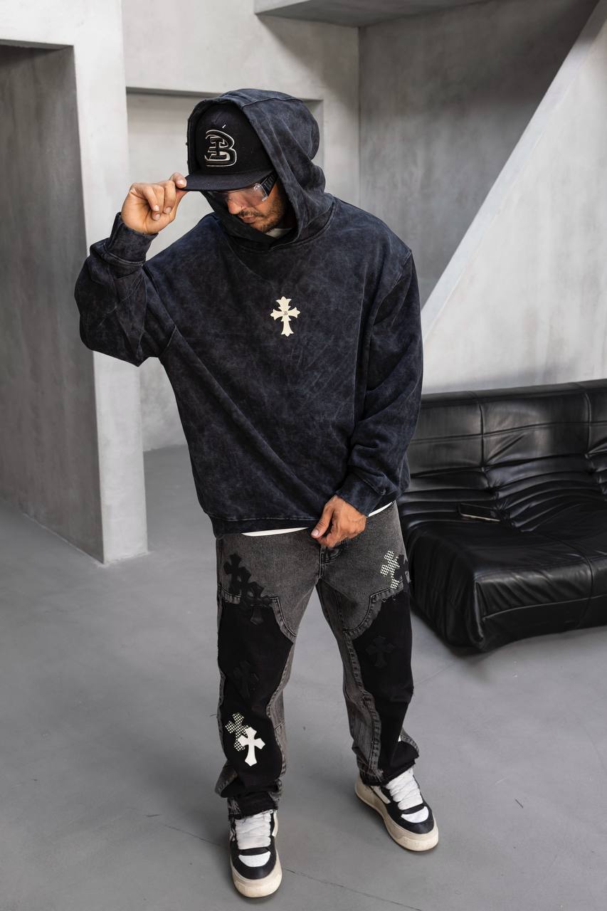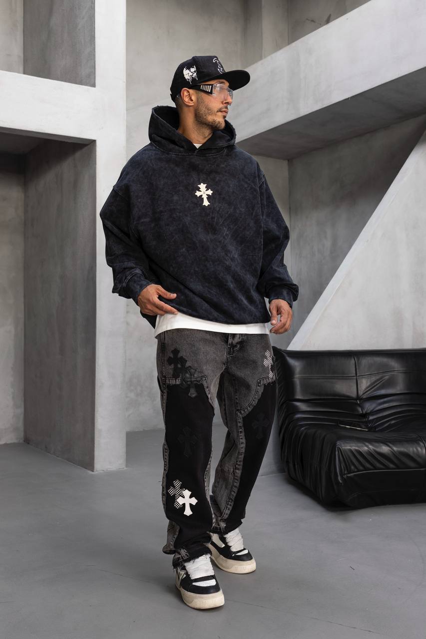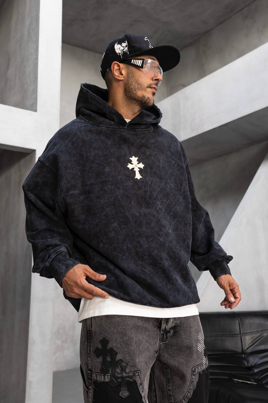 Чоловіче Чорне Варене Худі Оверсаз з Принтом Хрестом на Спині