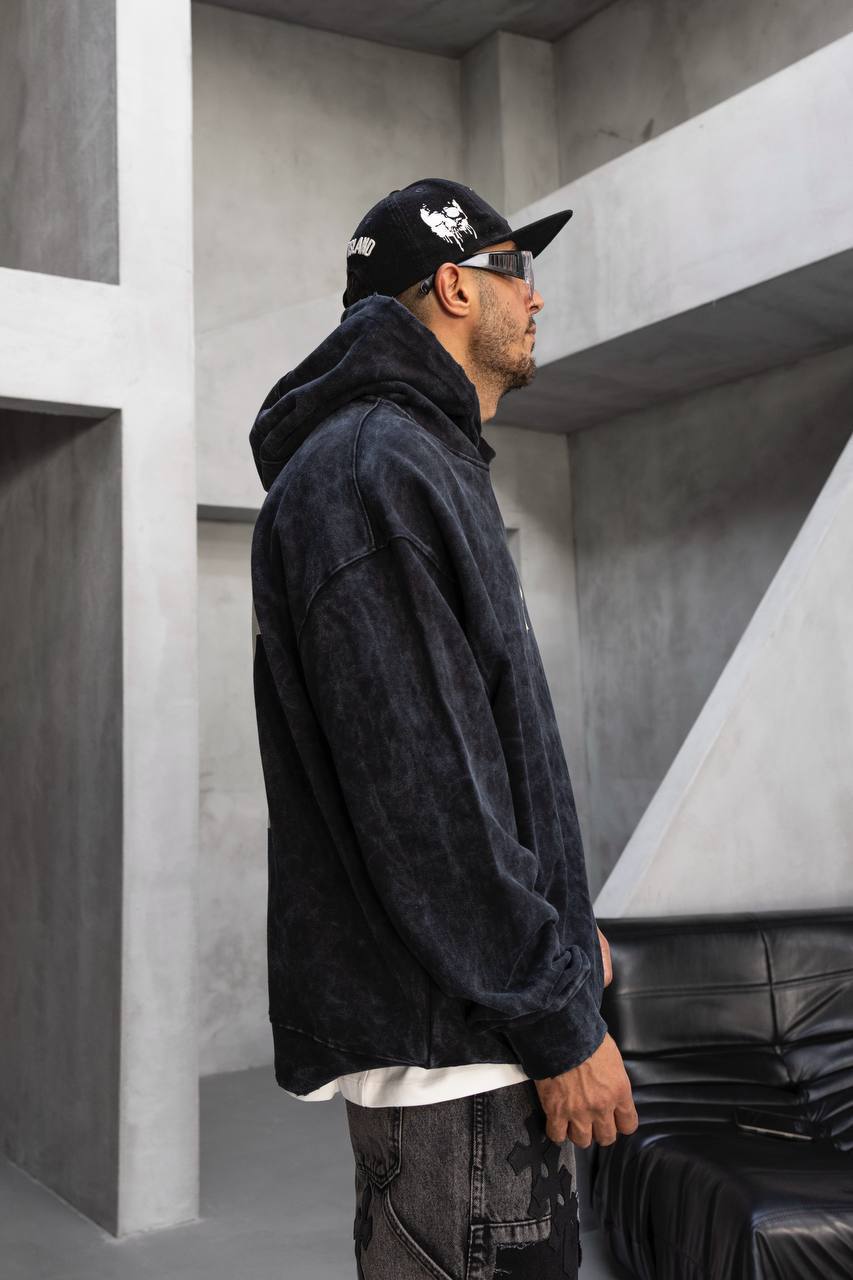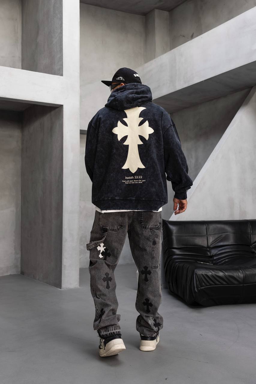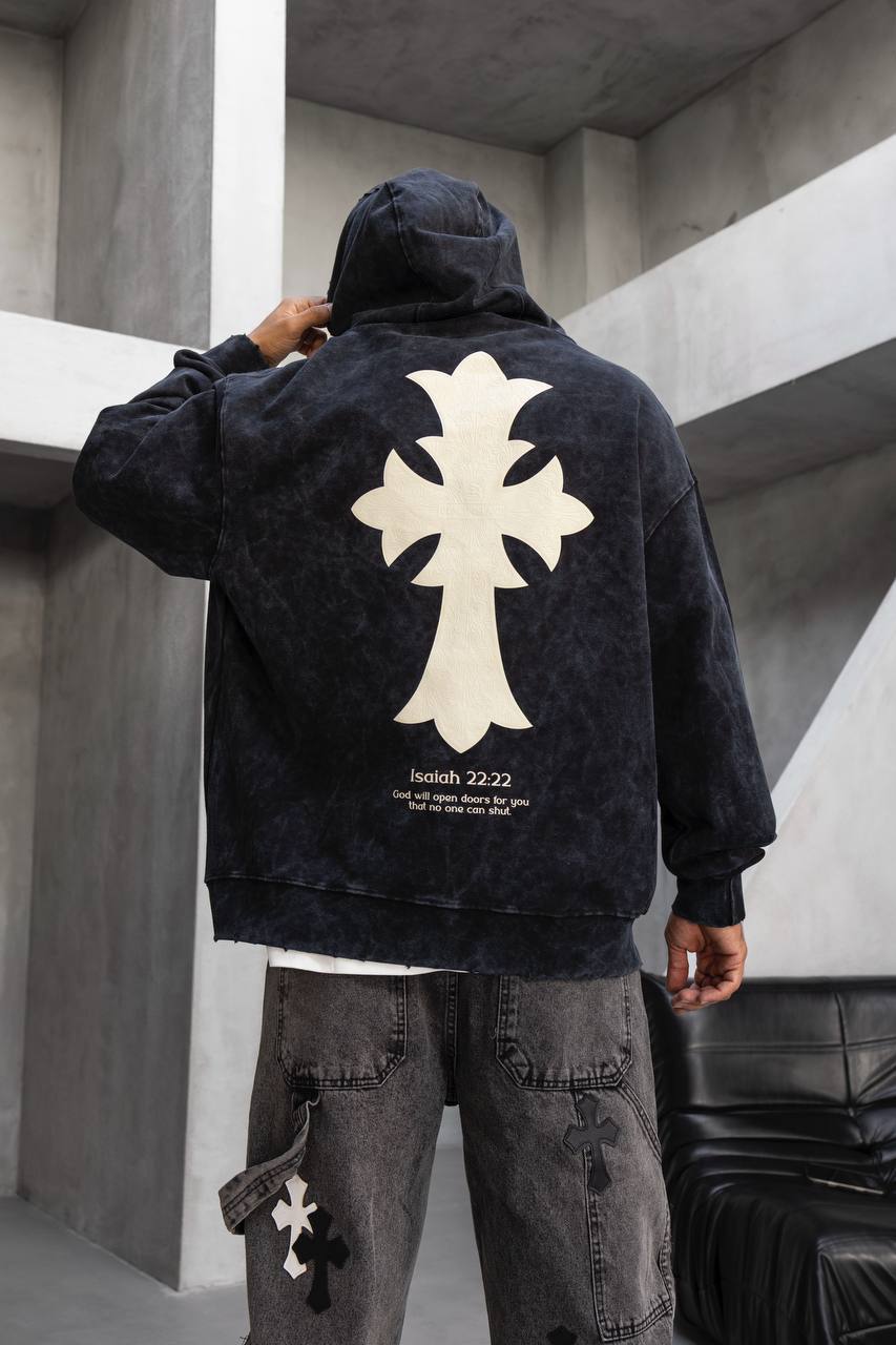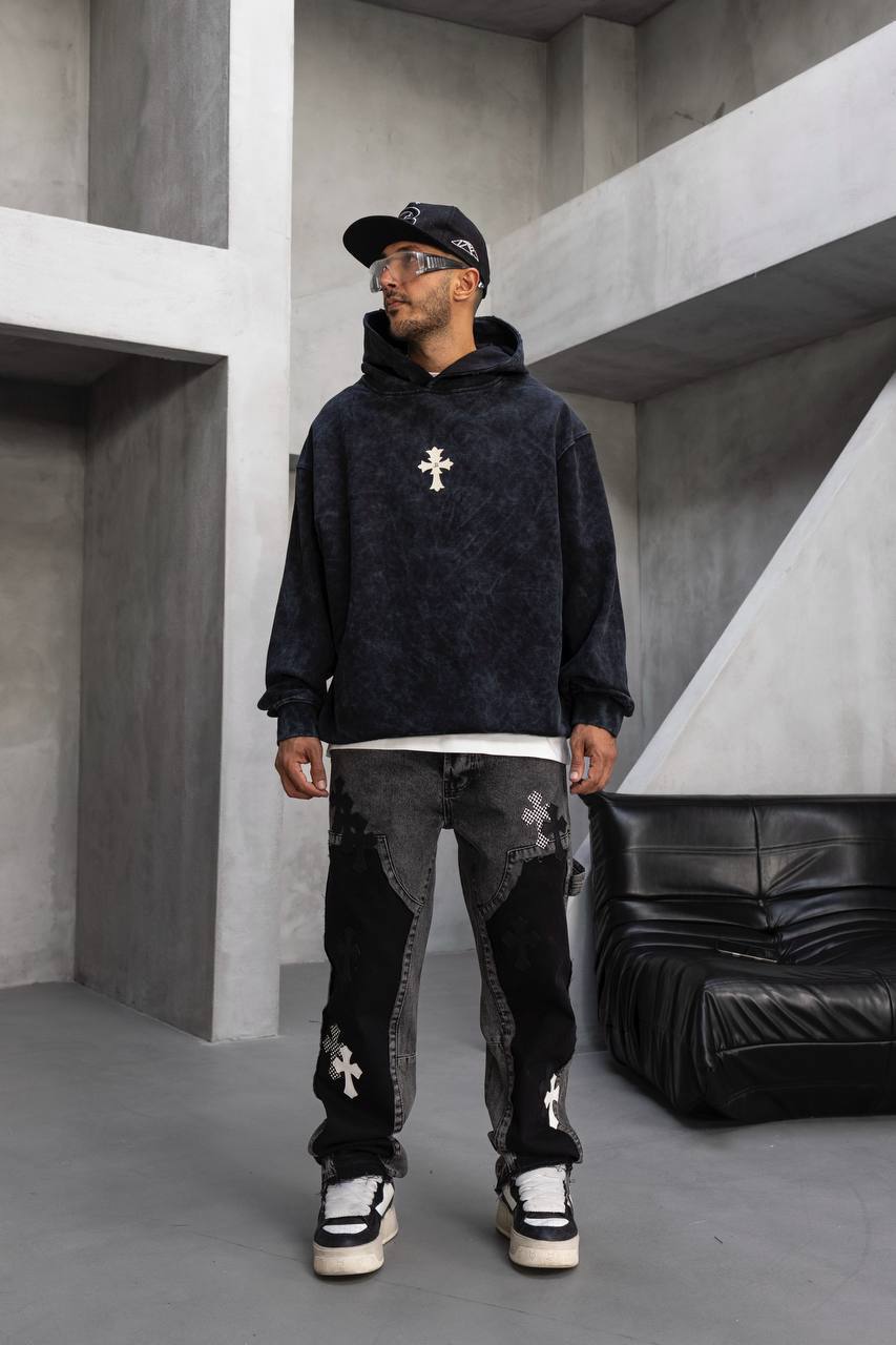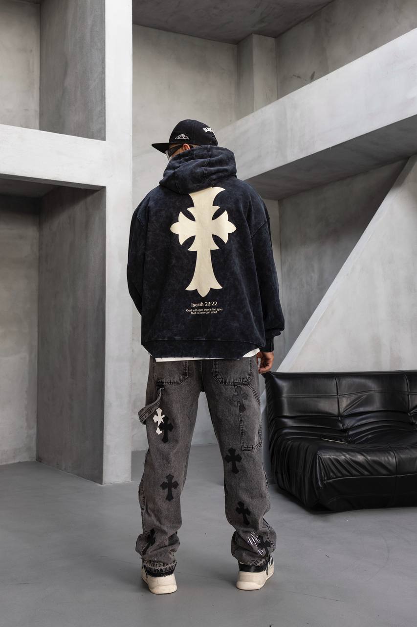 Чоловіче Чорне Варене Худі Оверсаз з Принтом Хрестом на Спині