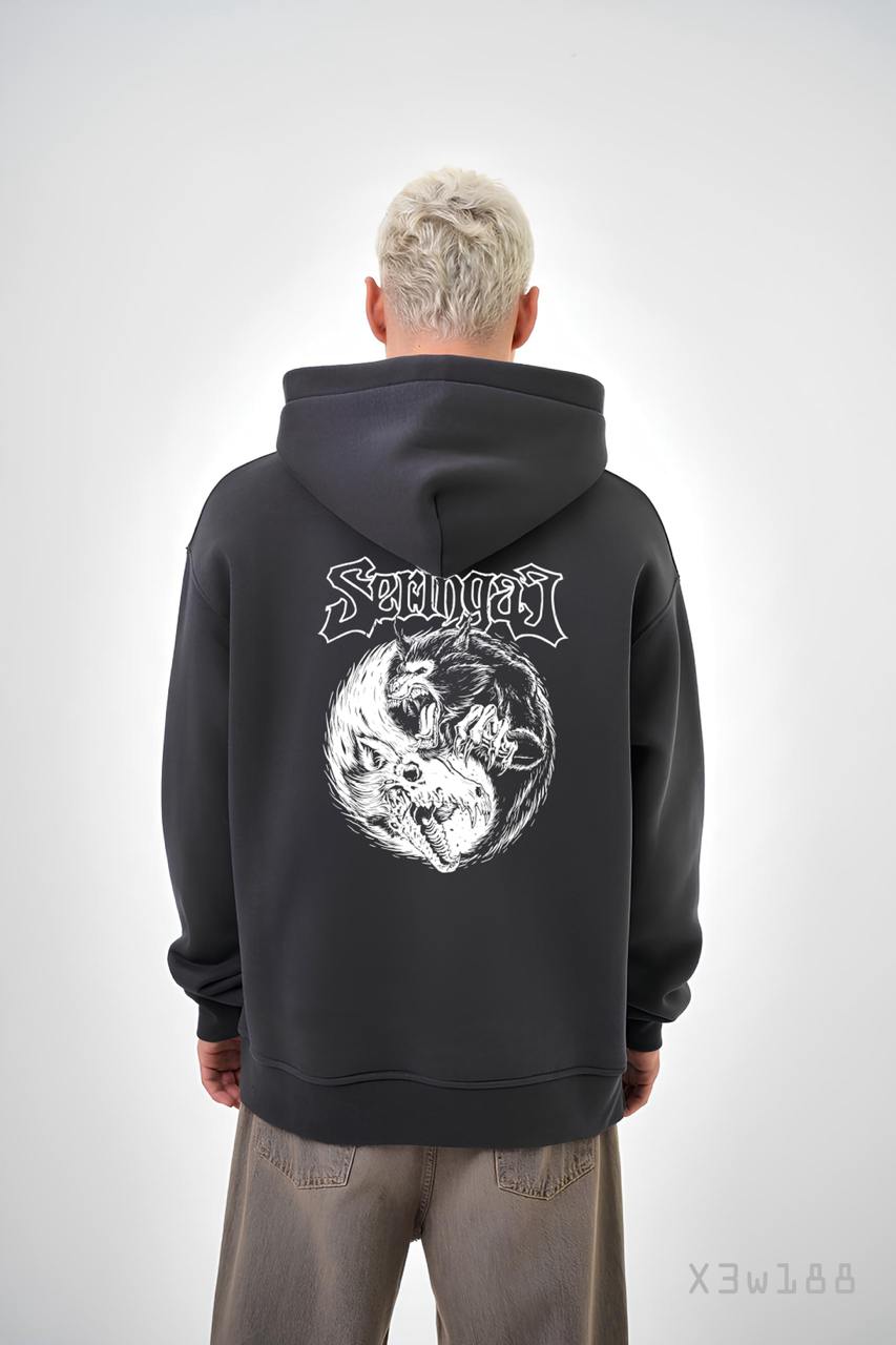 Чоловіче Графітове Худі Вільного Крою Трихнитка на Флісі з Принтом Вовкулака