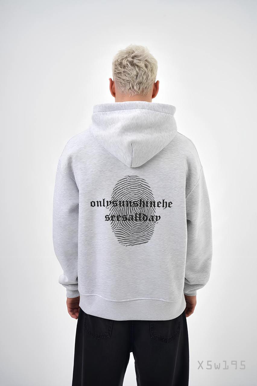 Чоловіче Худі Сіре Меланж Вільного Крою Трихнитка на Флісі з Принтом Відбиток Пальця