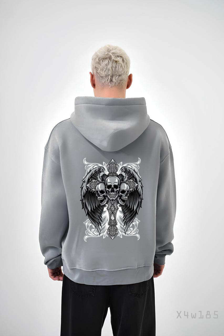 Чоловіче Сіре Худі Вільного Крою Трихнитка на Флісі з Черепами
