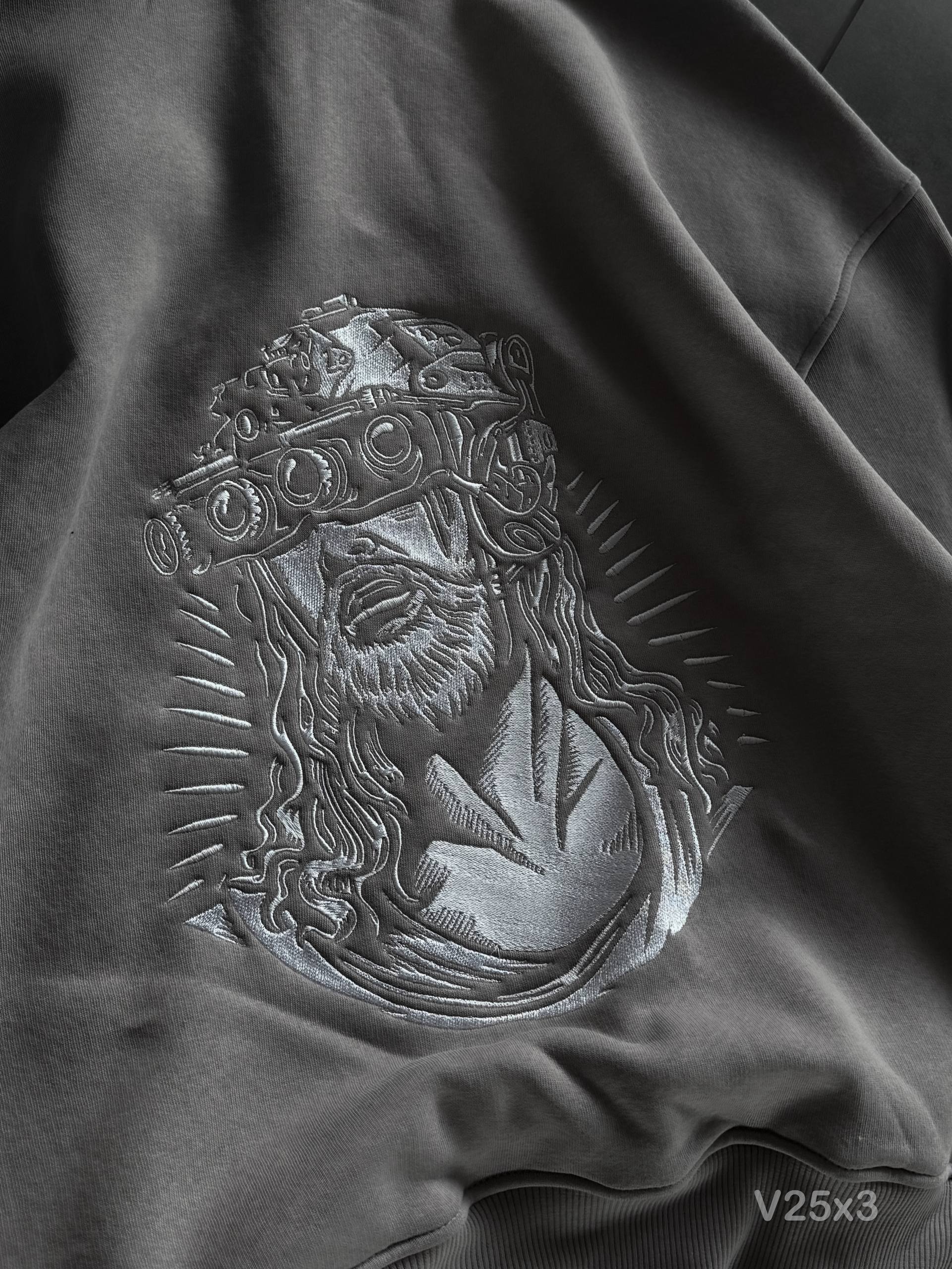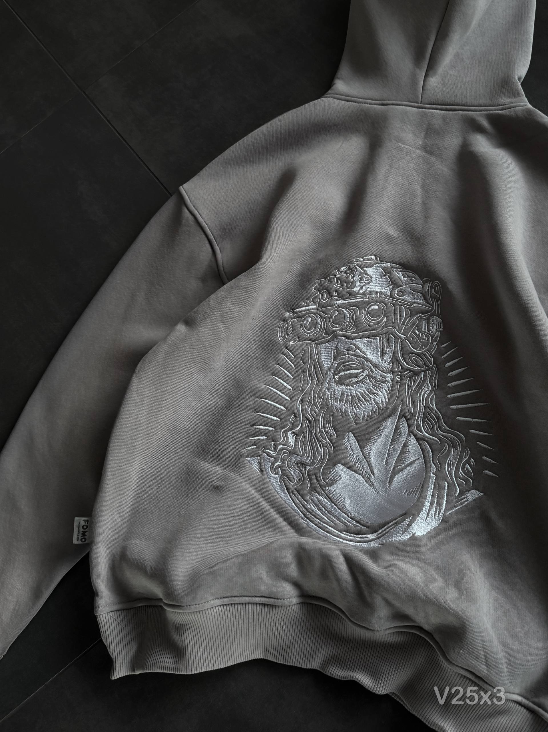 Чоловіче Сіре Худі з Вишивкою на Спині Оверсайз (На Флісі)