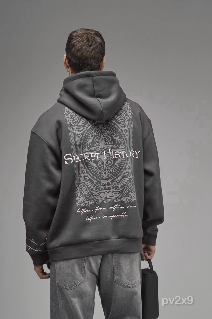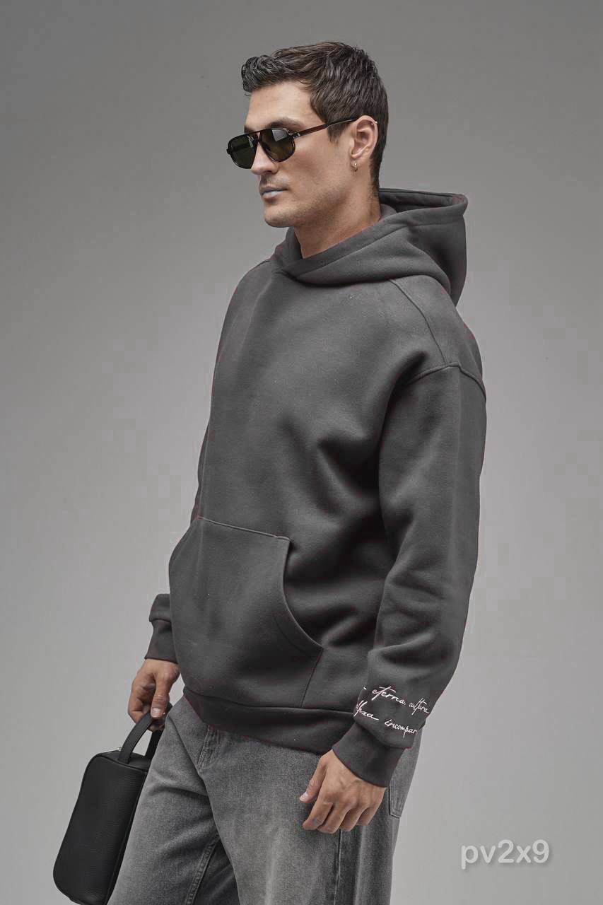 Чоловіче Темно-Сіре Худі Оверсайз з Принтом та Вишивкою на Спині