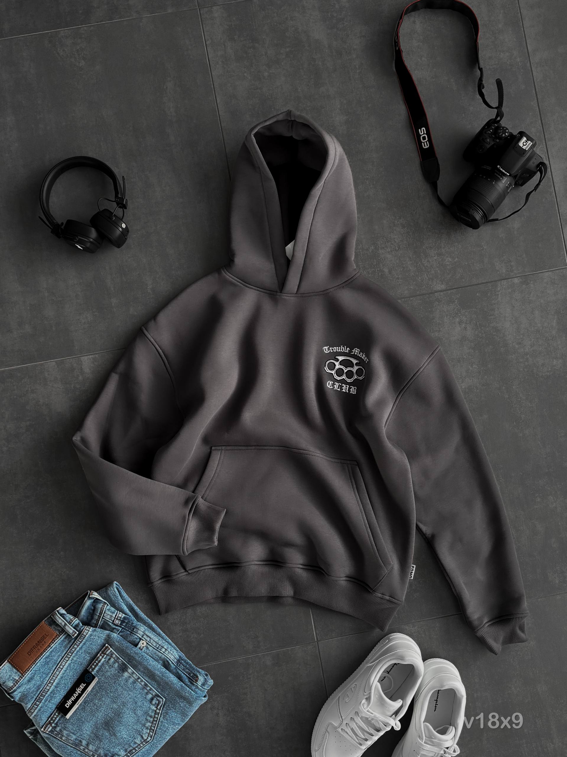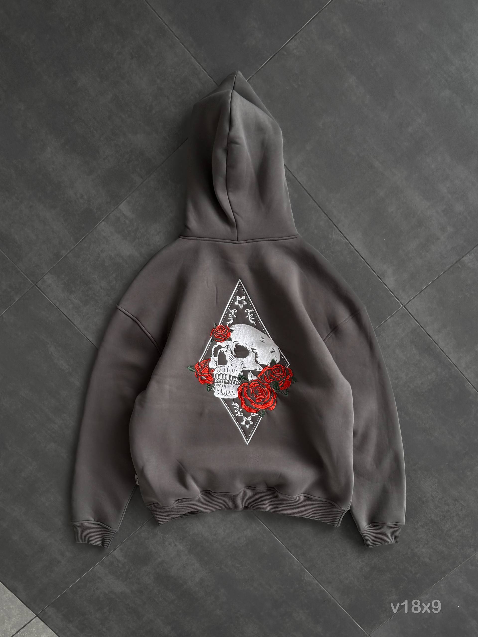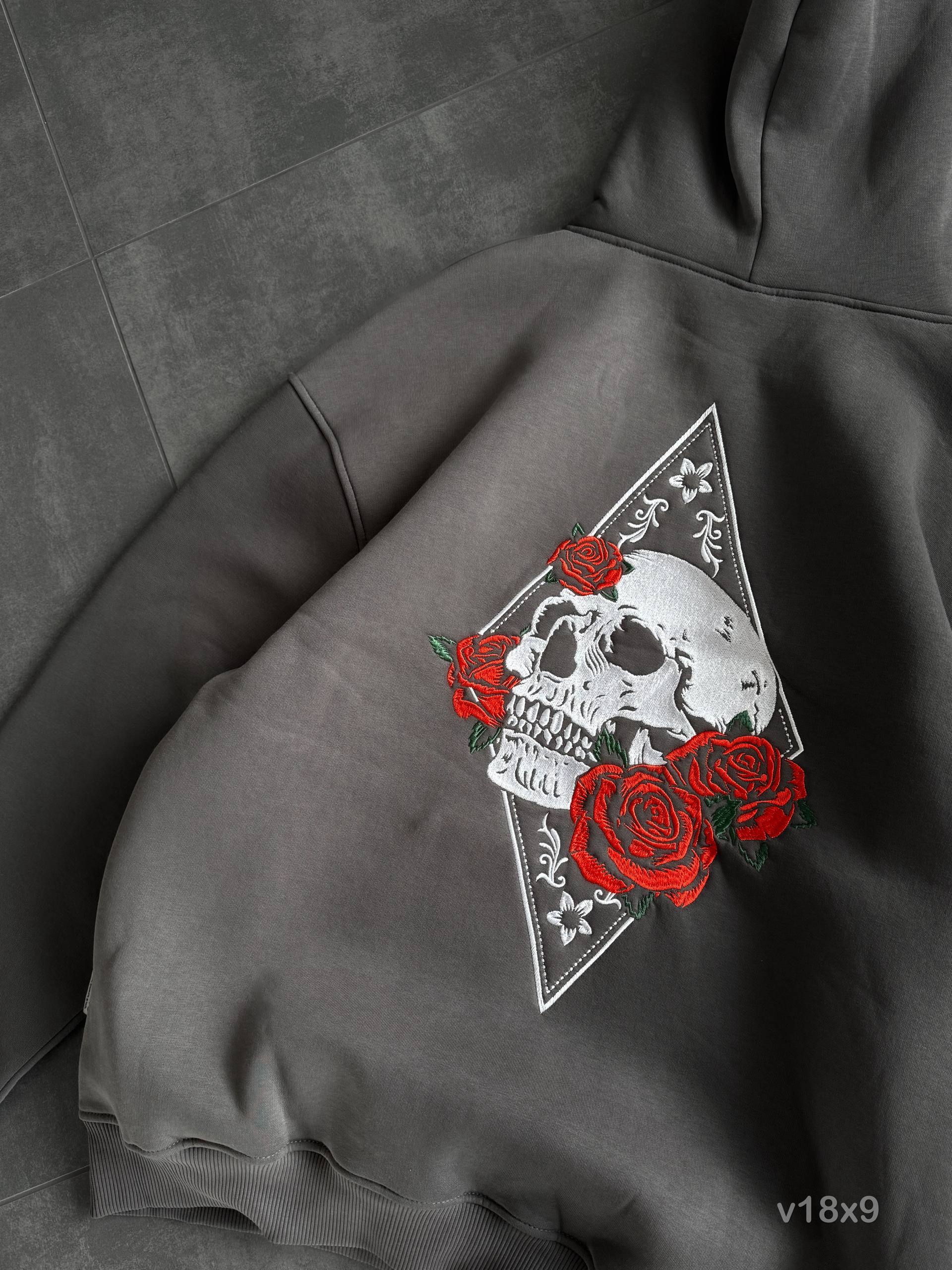 Чоловіче Темно-Сіре Худі Утеплене на Флісі – Оверсайз з Вишивкою Череп у Трояндах
