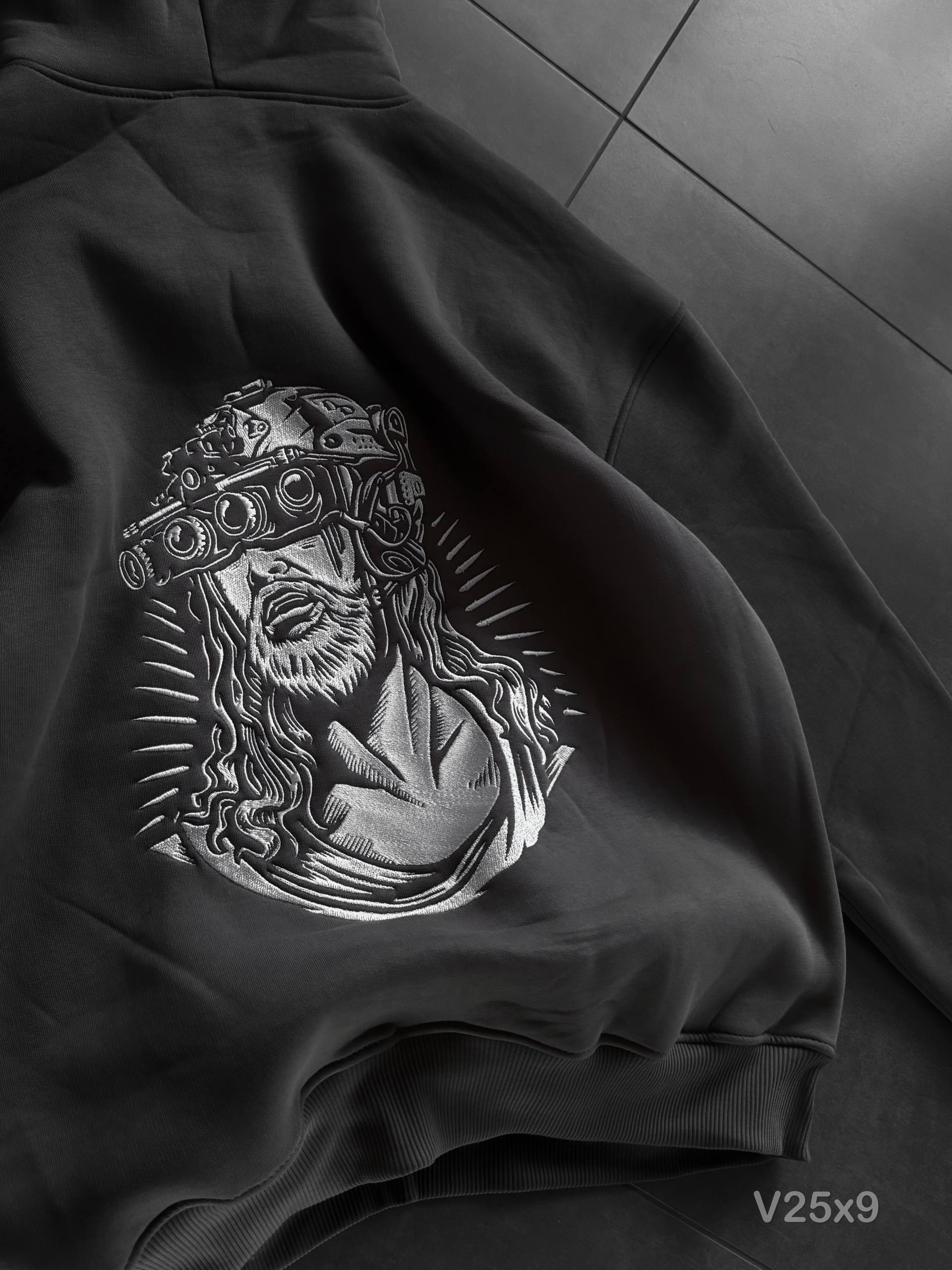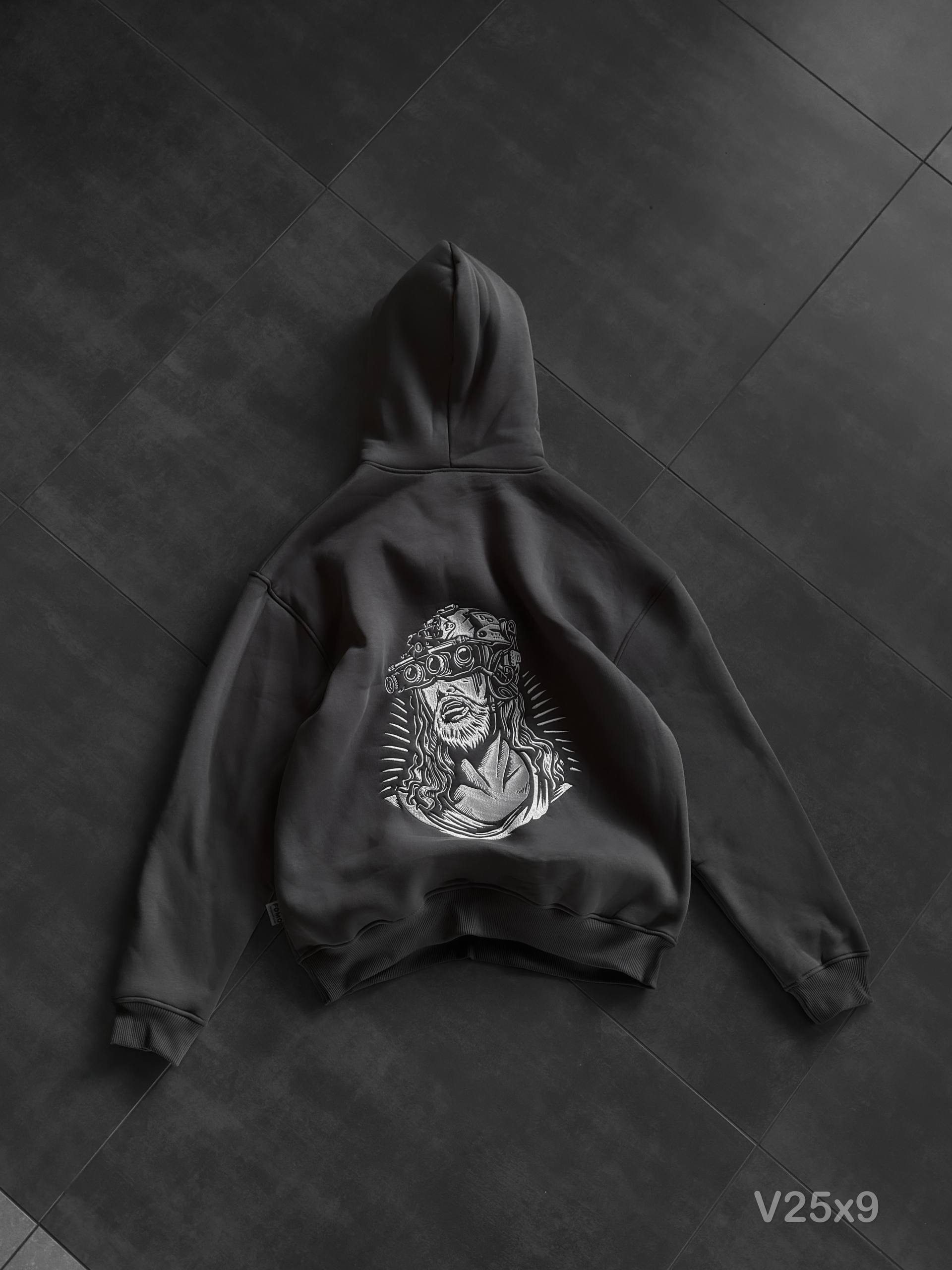 Чоловіче Темно-Сіре Худі з Вишивкою на Спині Оверсайз (На Флісі)