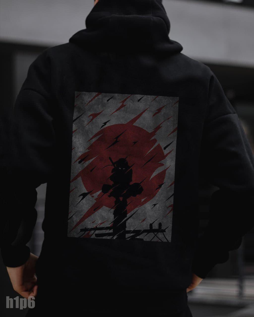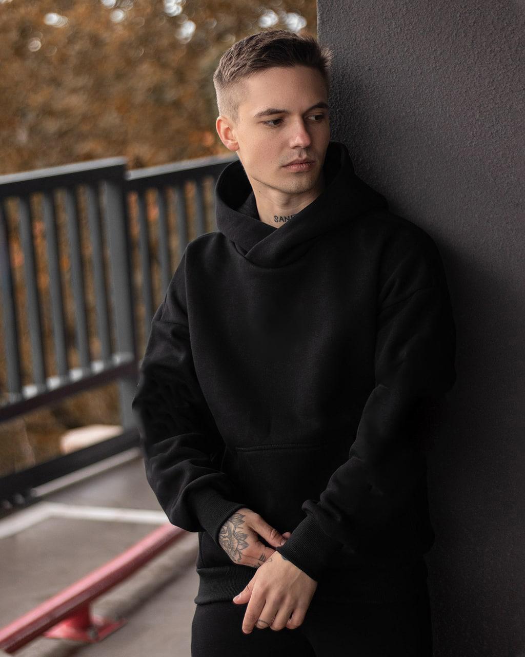 Чоловіче Тепле Чорне Худі Оверсайз з Принтом Червоне Сонце – Тринитка з Начосом.