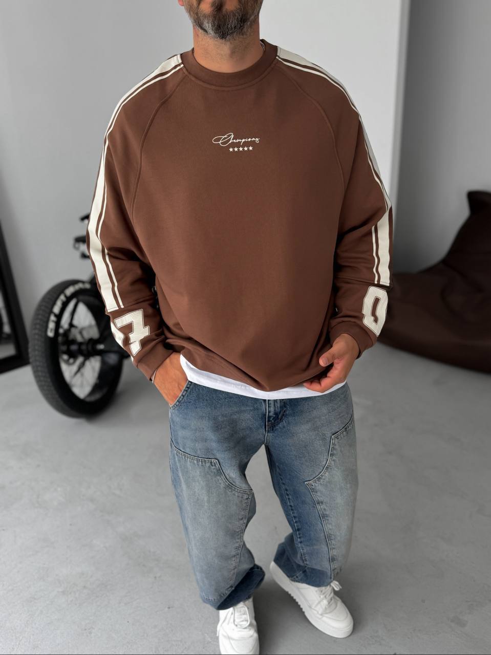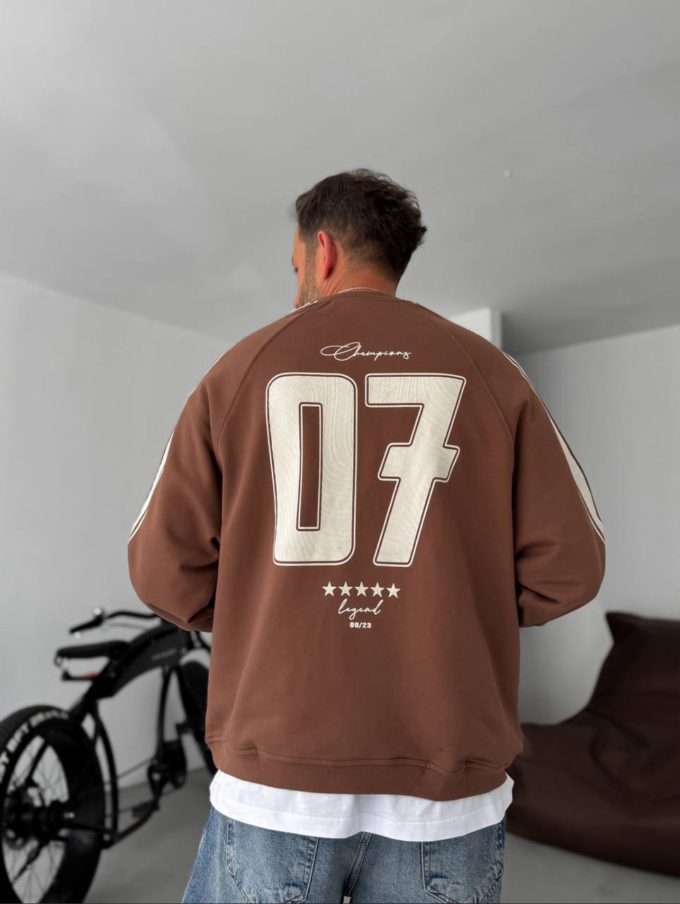 Чоловічий Коричневий Світшот Реглан Оверсайз з Лампасами та Принтом Номером на Спині
