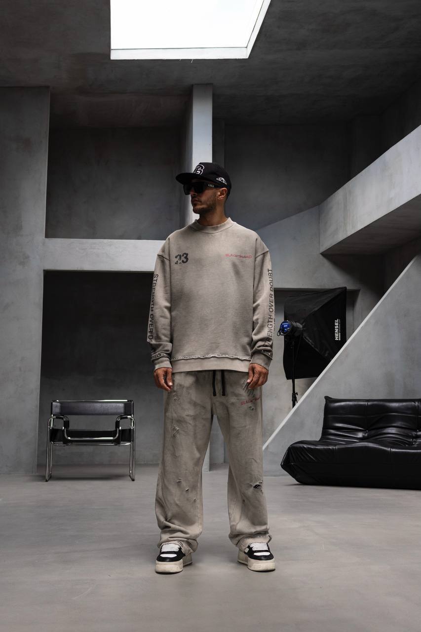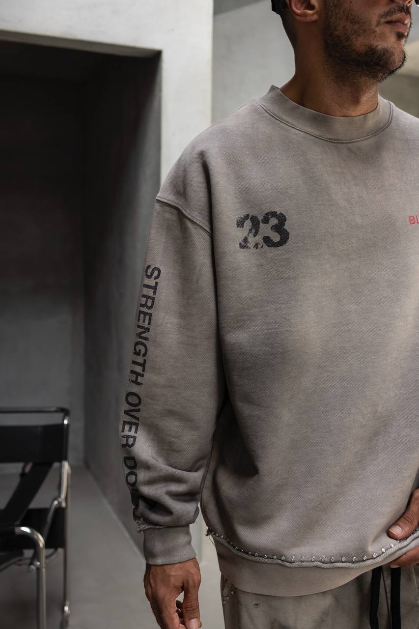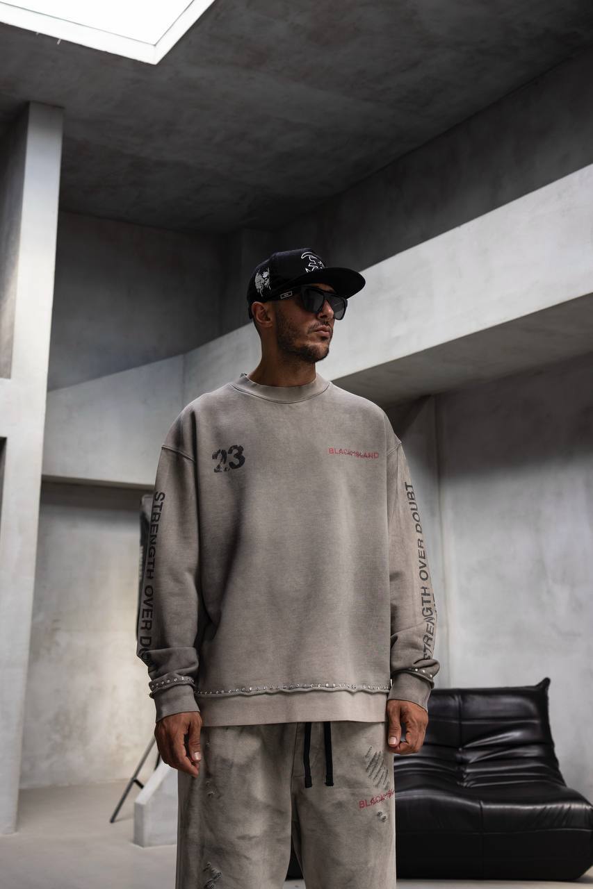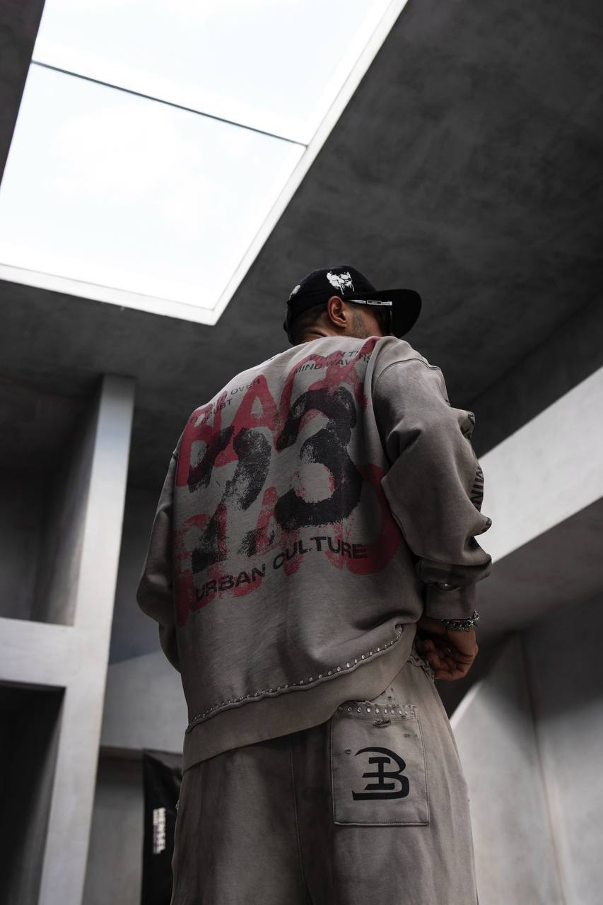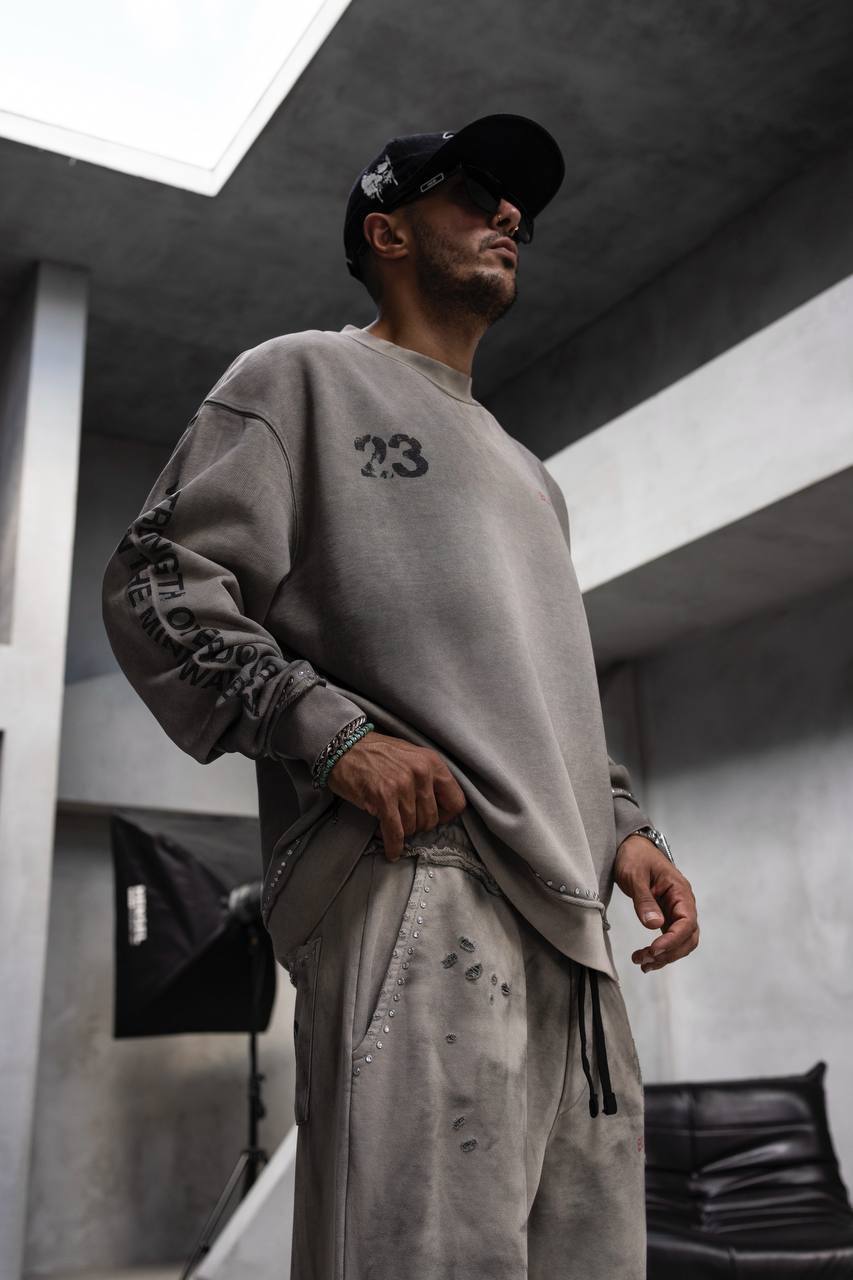 Чоловічий Сірий Варений Світшот Оверсайз з Принтом на Спині та Рукавах