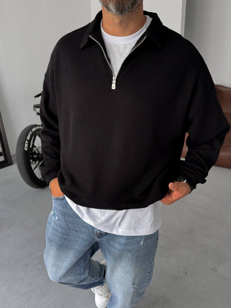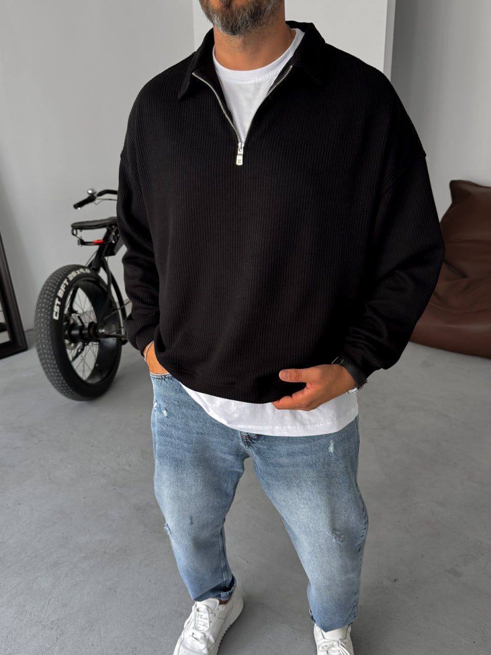 Чоловіча Чорна Кофта Оверсайз Рубчик з Коміром на Замку