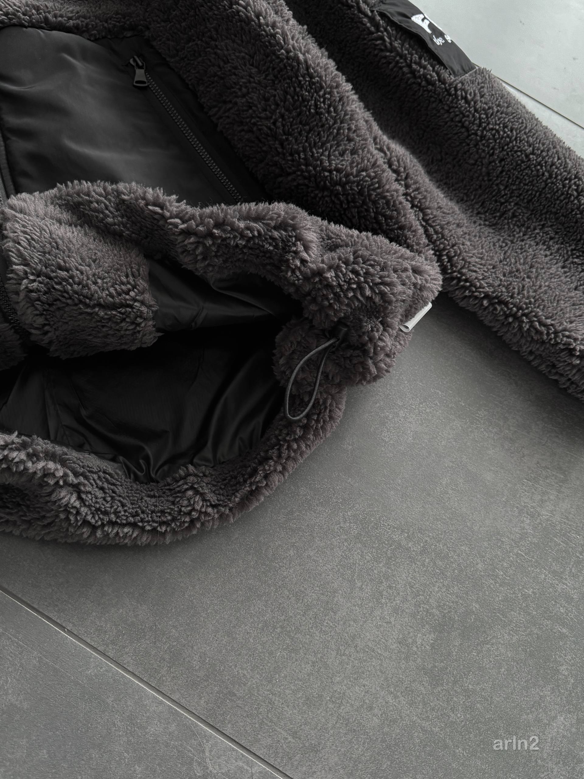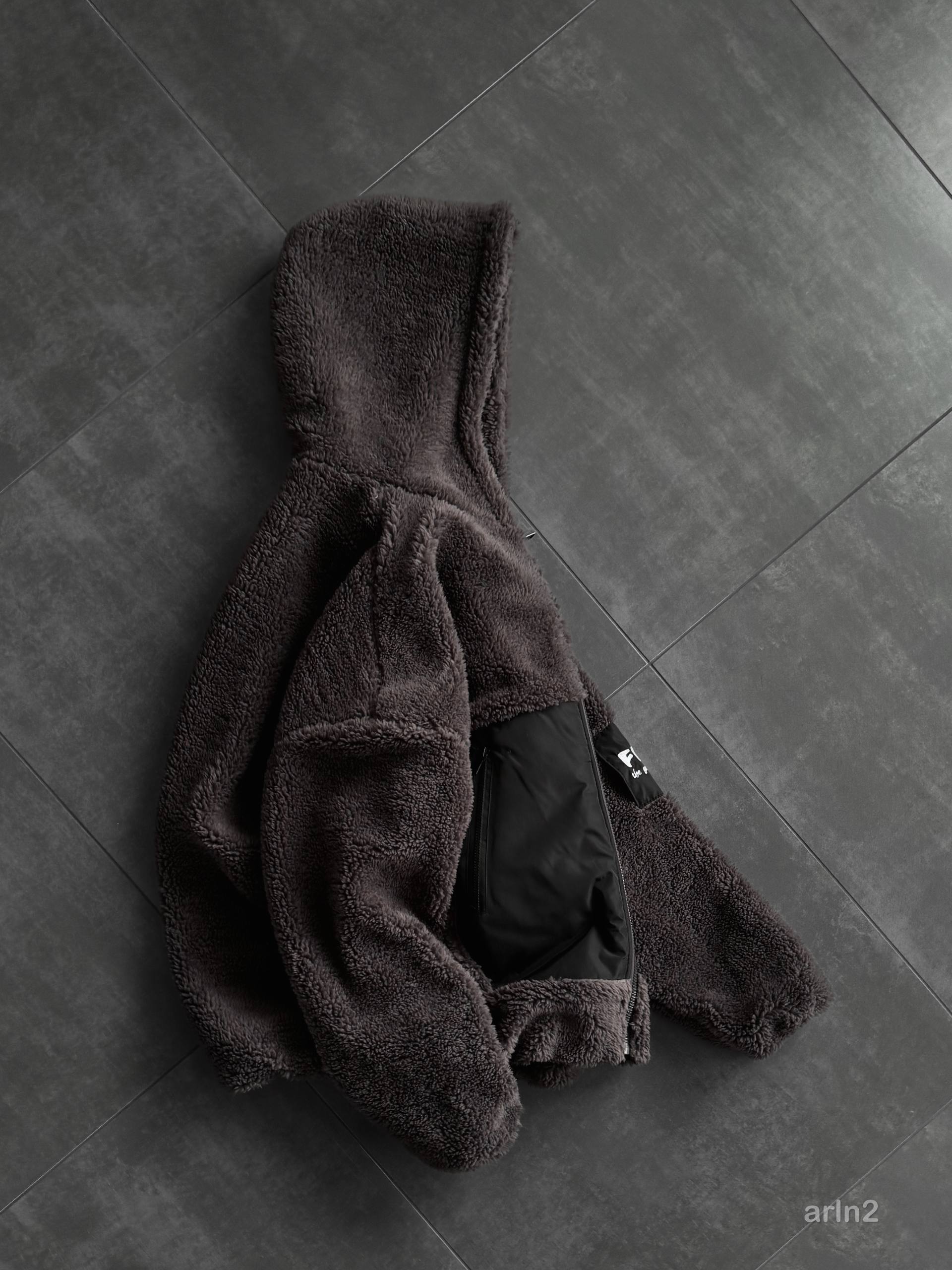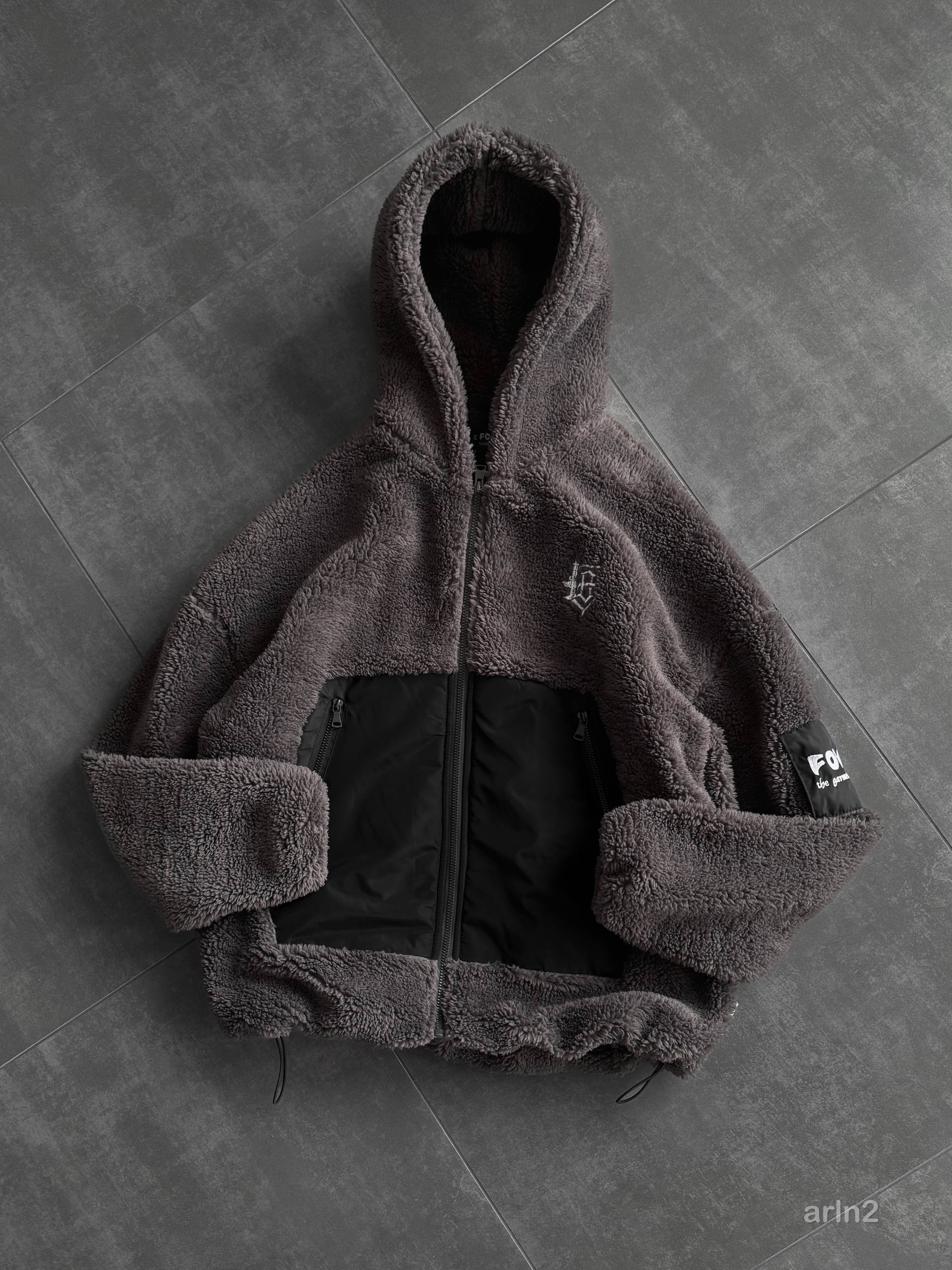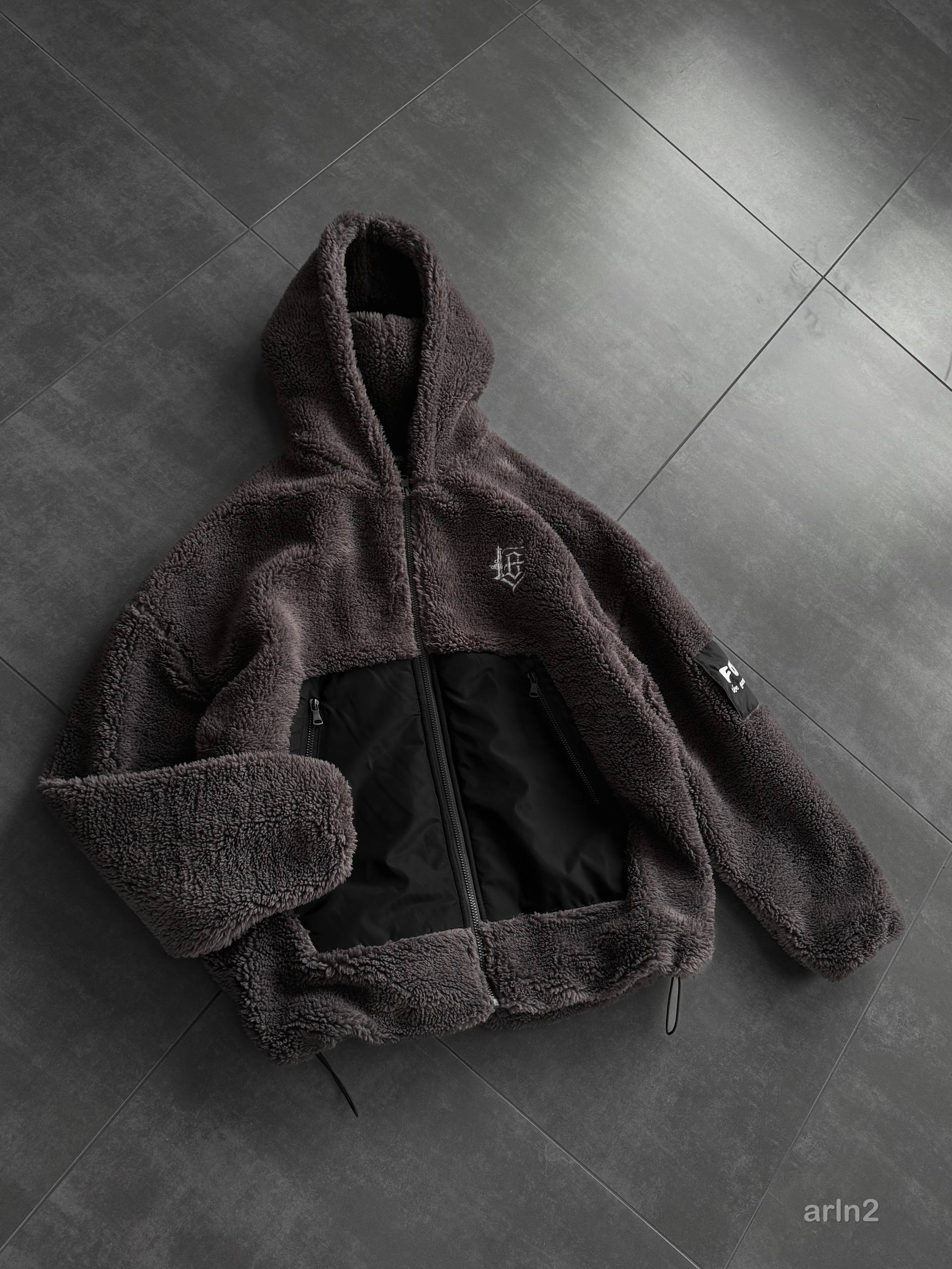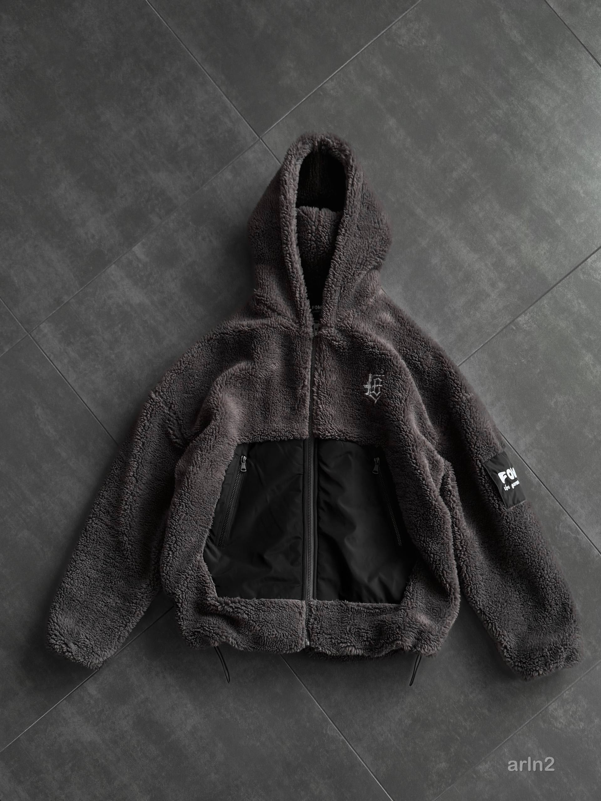 Чоловіча Плюшева Графітова Кофта Баранчик на Блискавці з Капюшоном та Вставкою з Плащівки