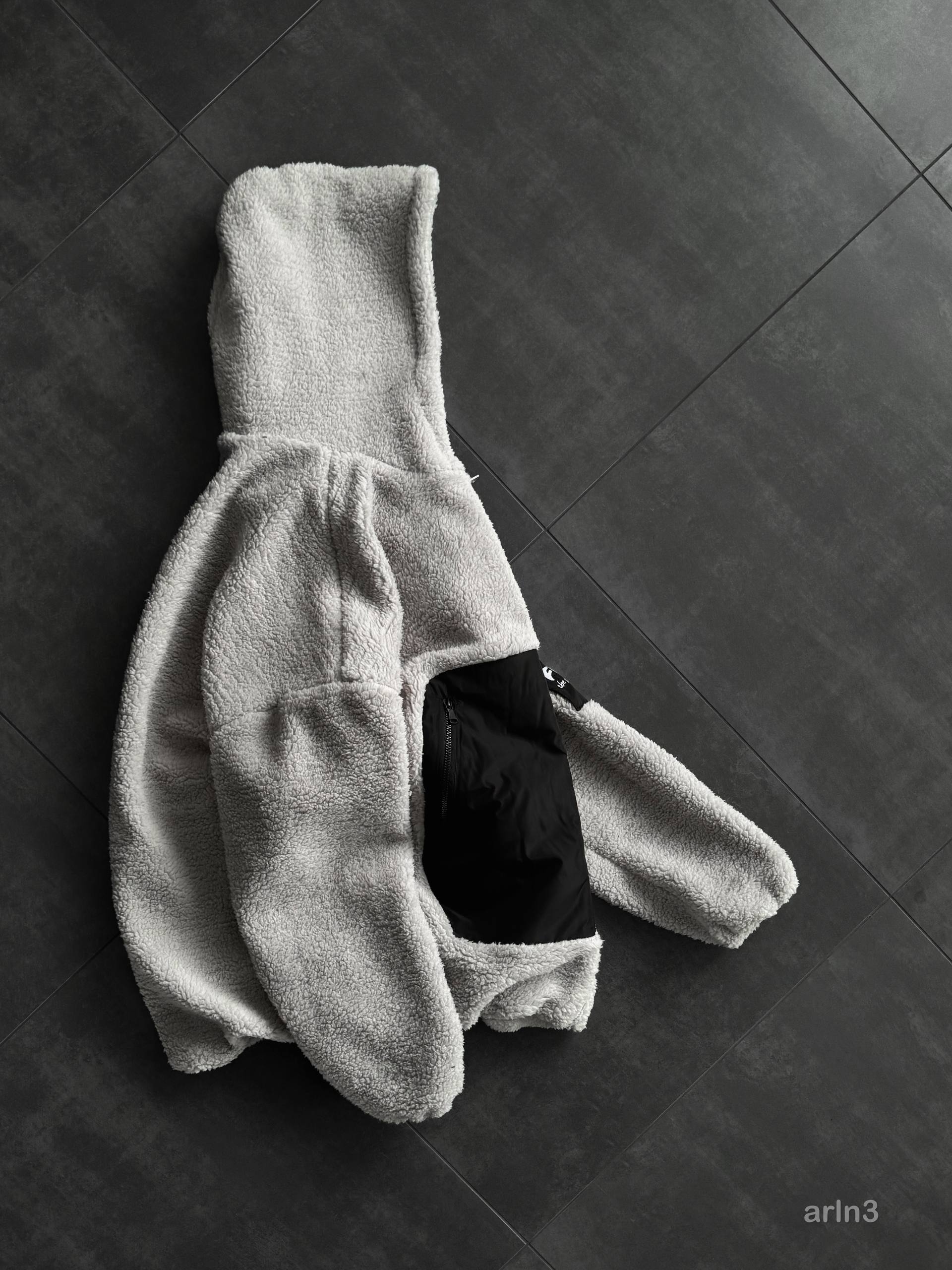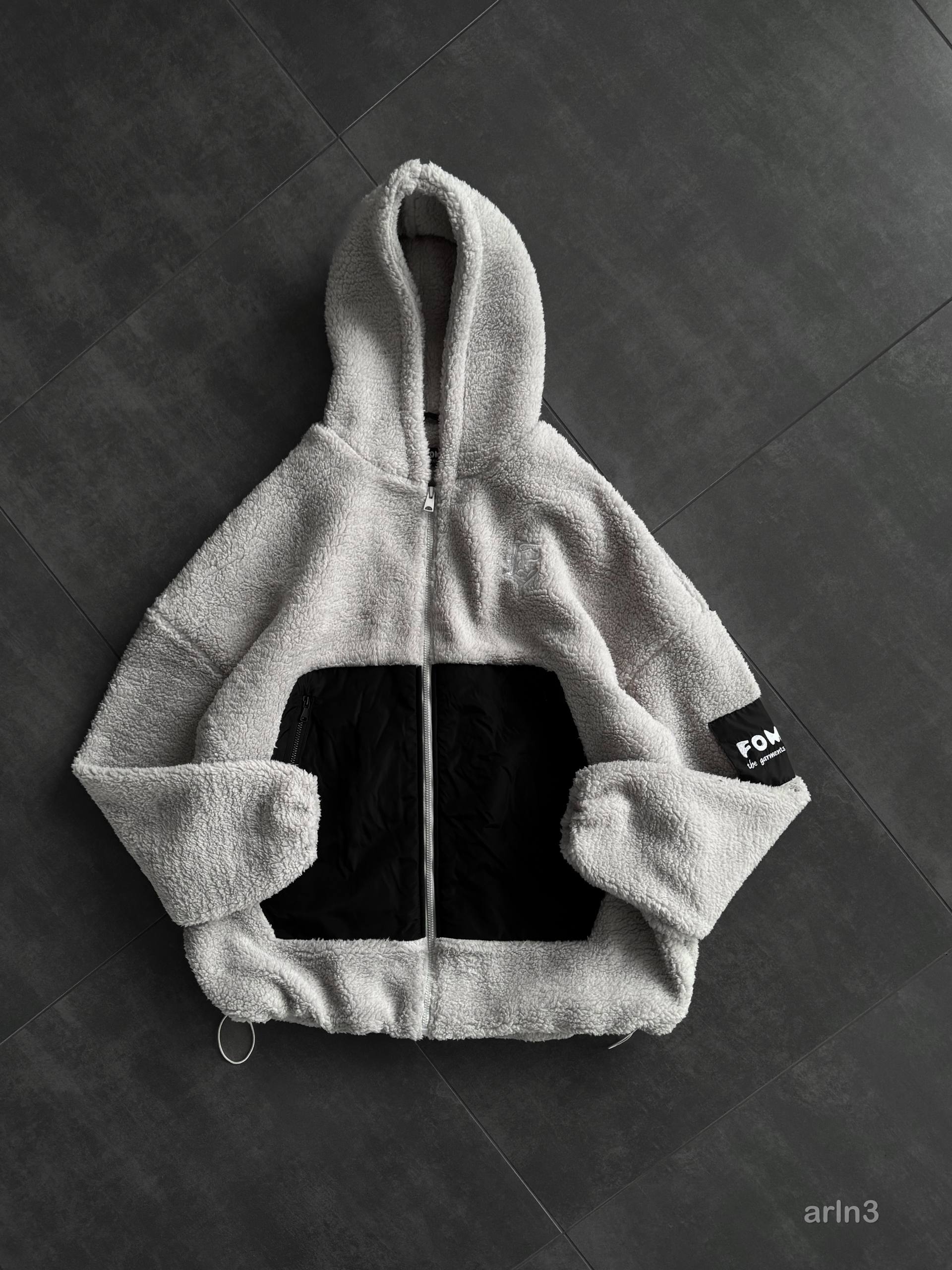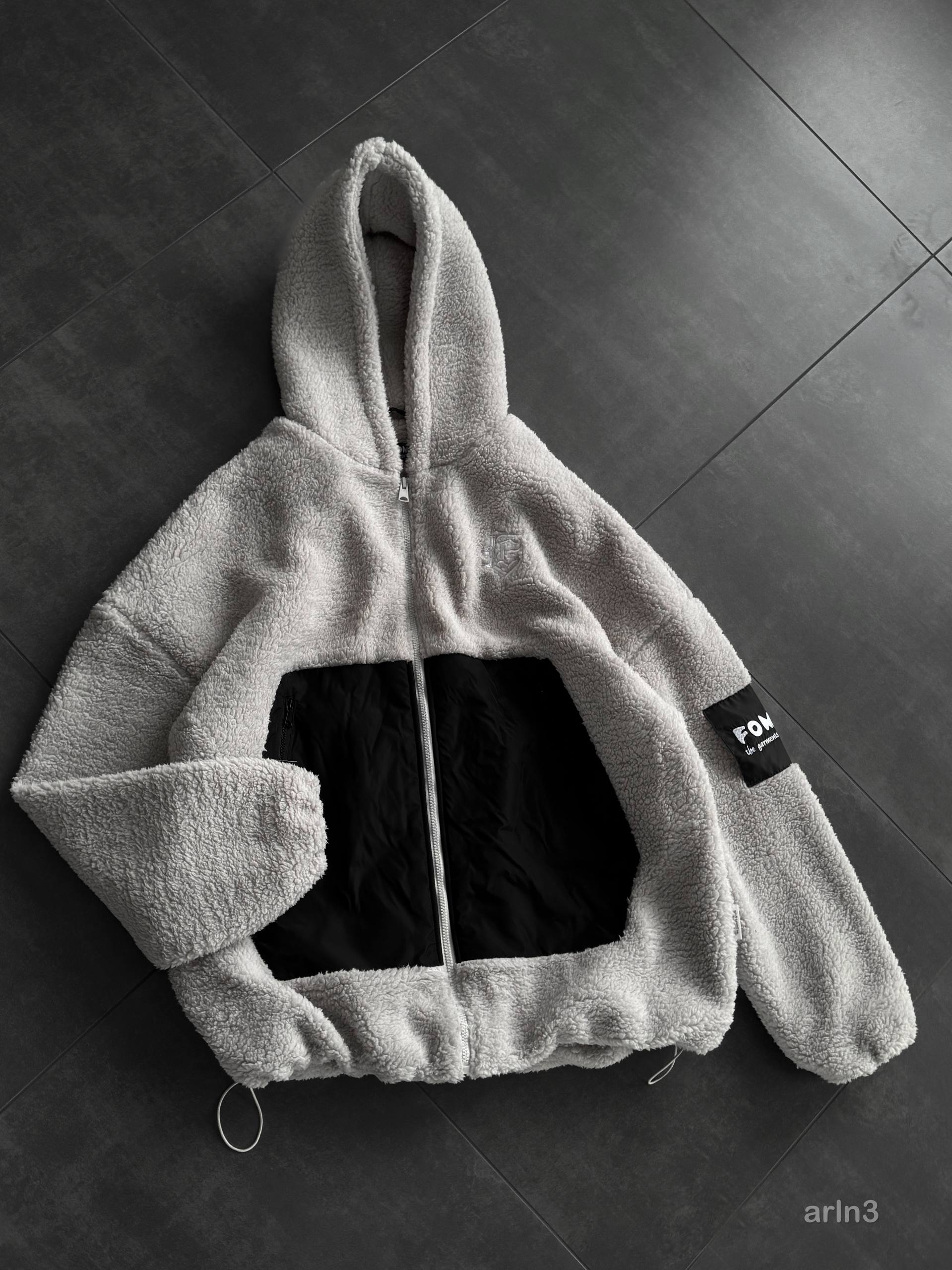 Чоловіча Плюшева Сіра Кофта Баранчик на Блискавці з Капюшоном та Вставкою з Плащівки
