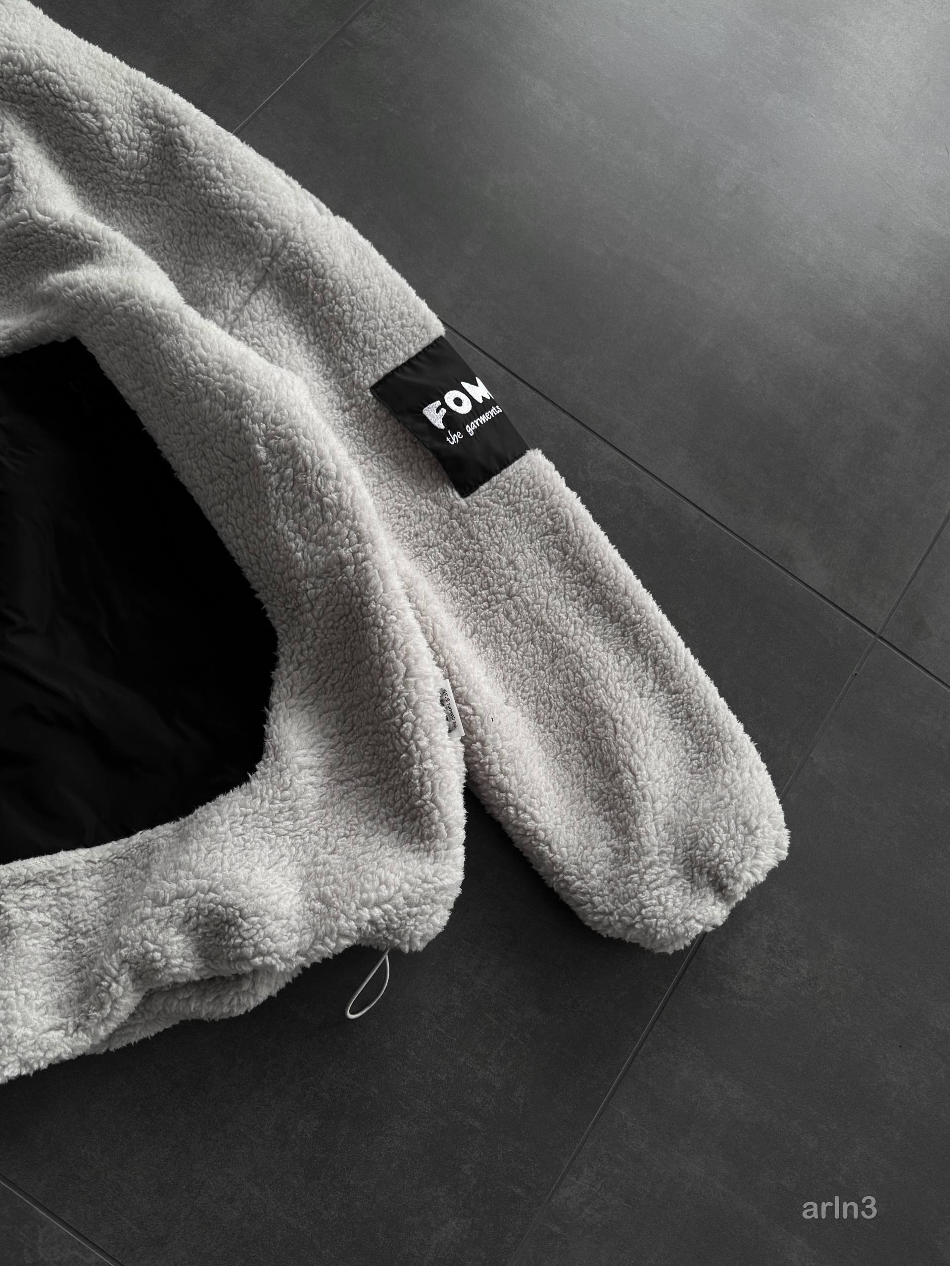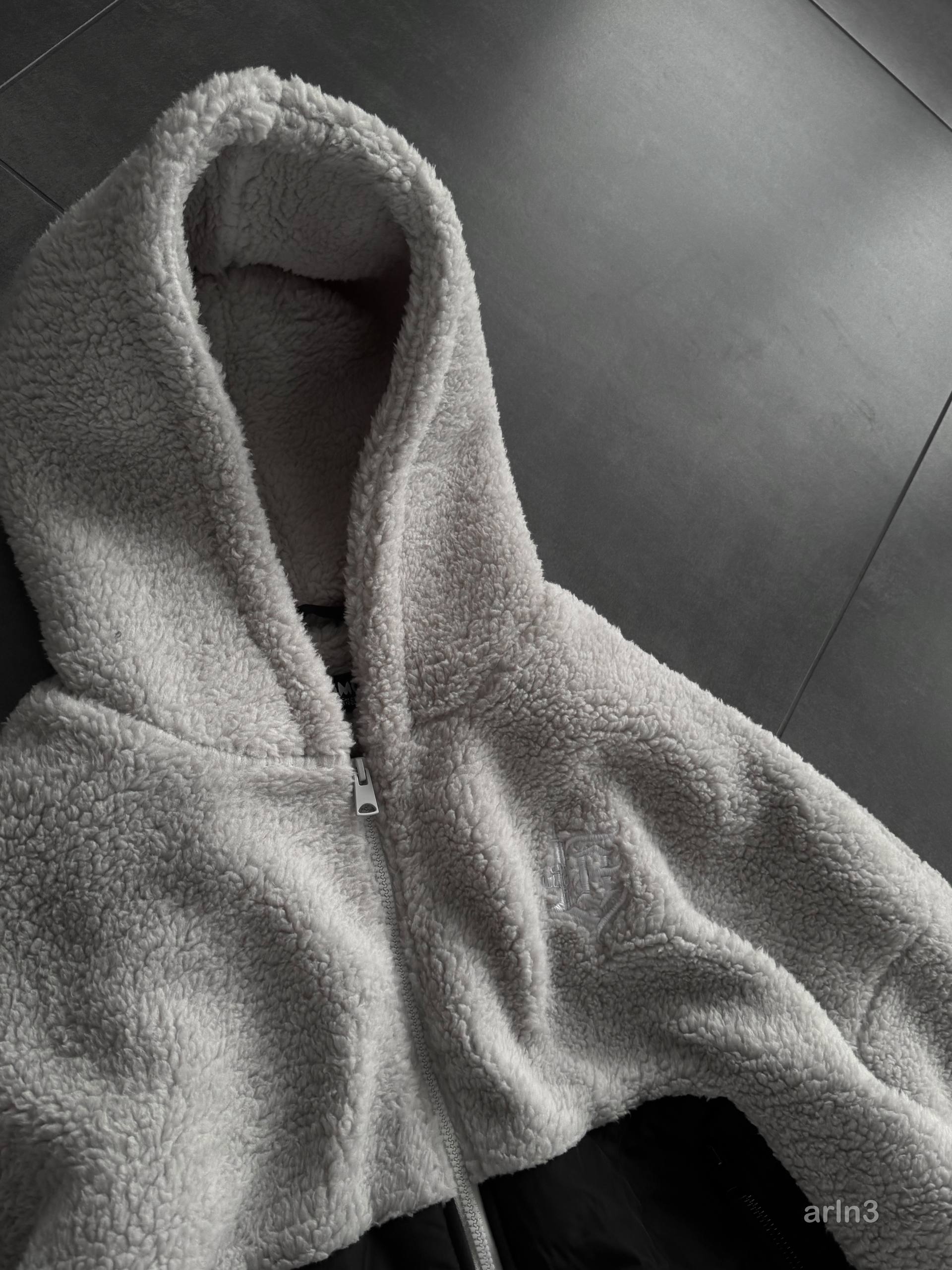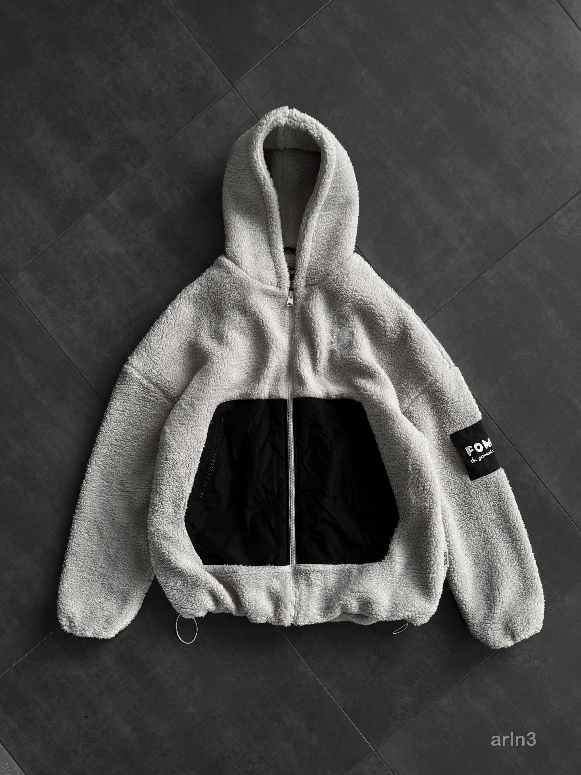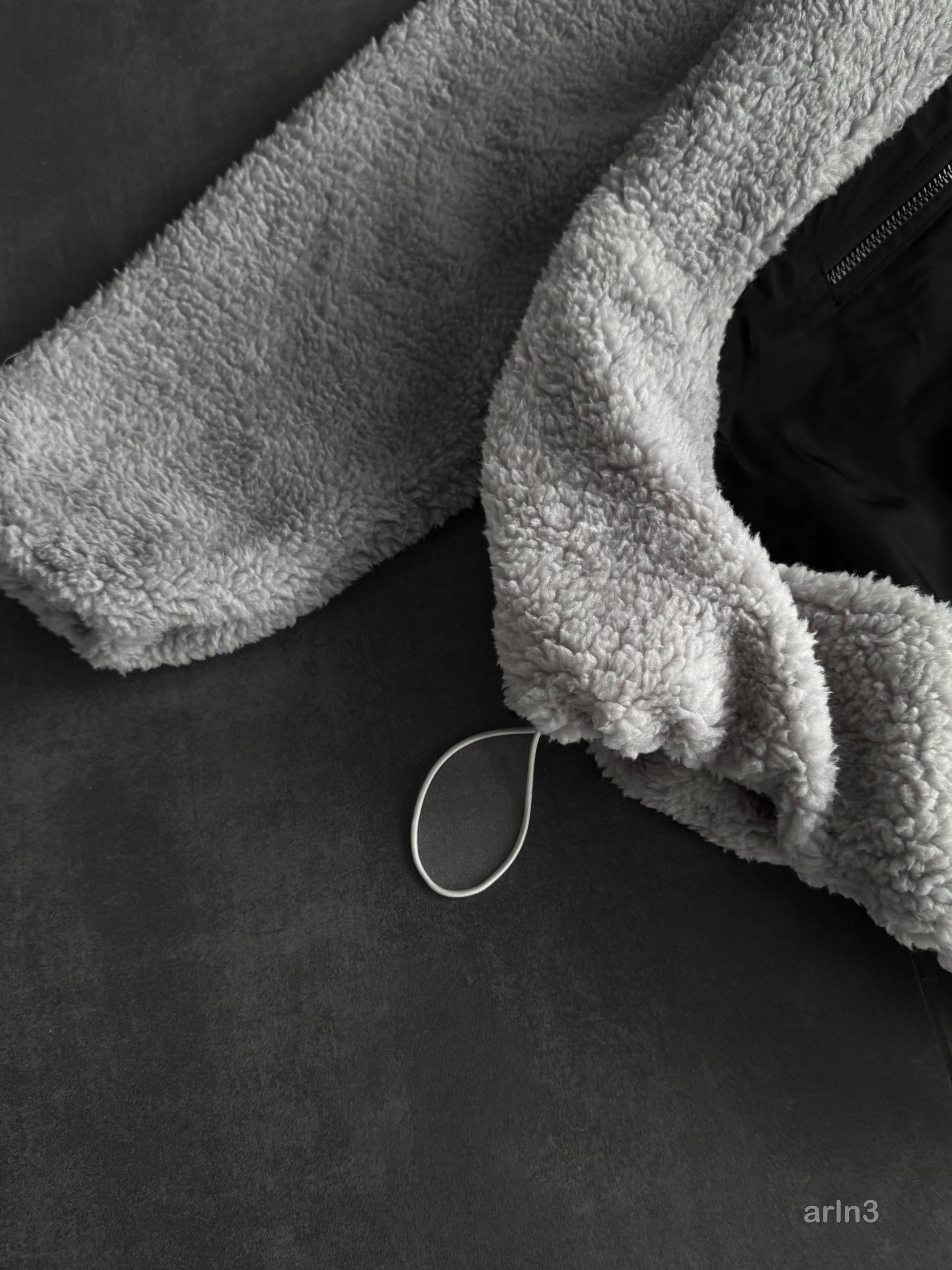 Чоловіча Плюшева Сіра Кофта Баранчик на Блискавці з Капюшоном та Вставкою з Плащівки