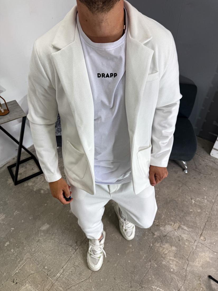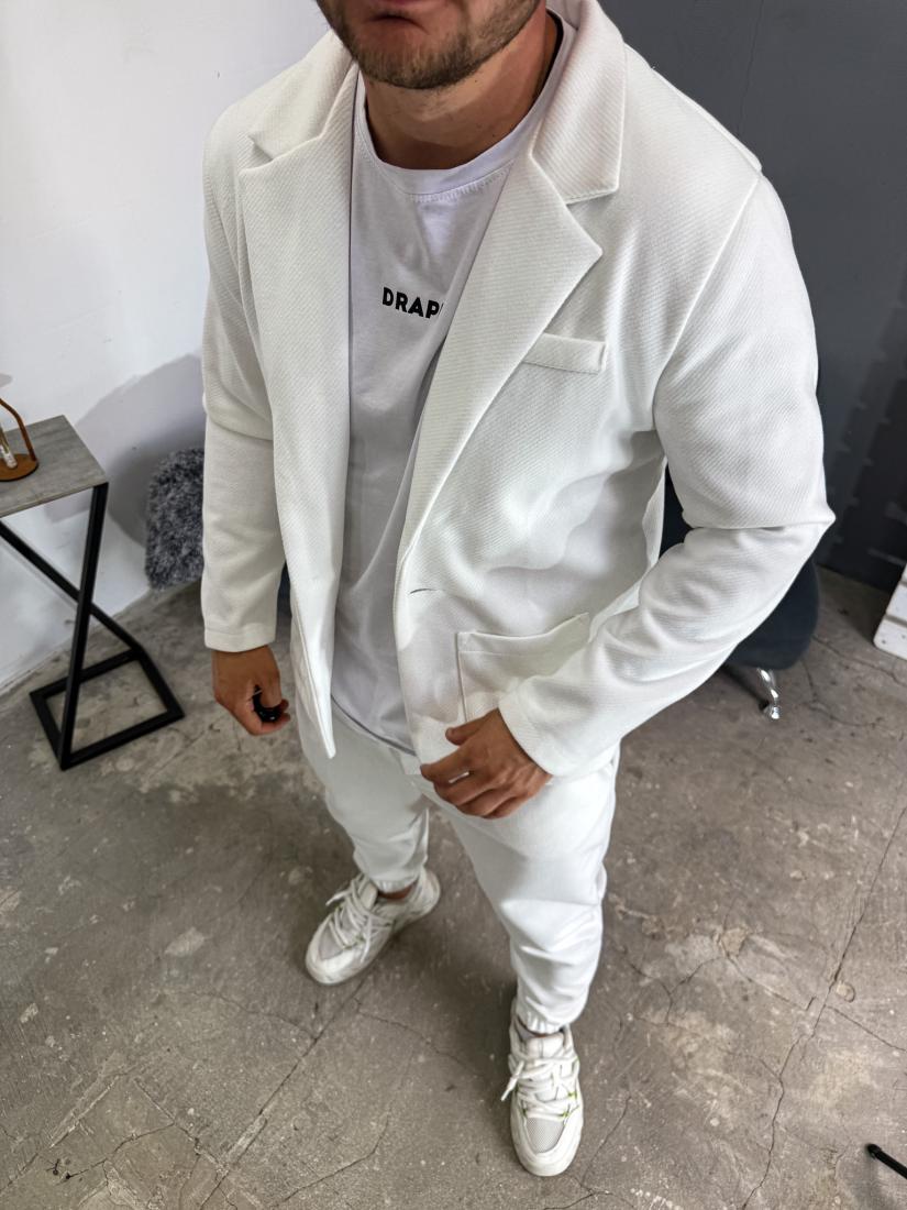 Чоловічий Базовий Білий Костюм – Жакет з Кишенями + Штани з Манжетами