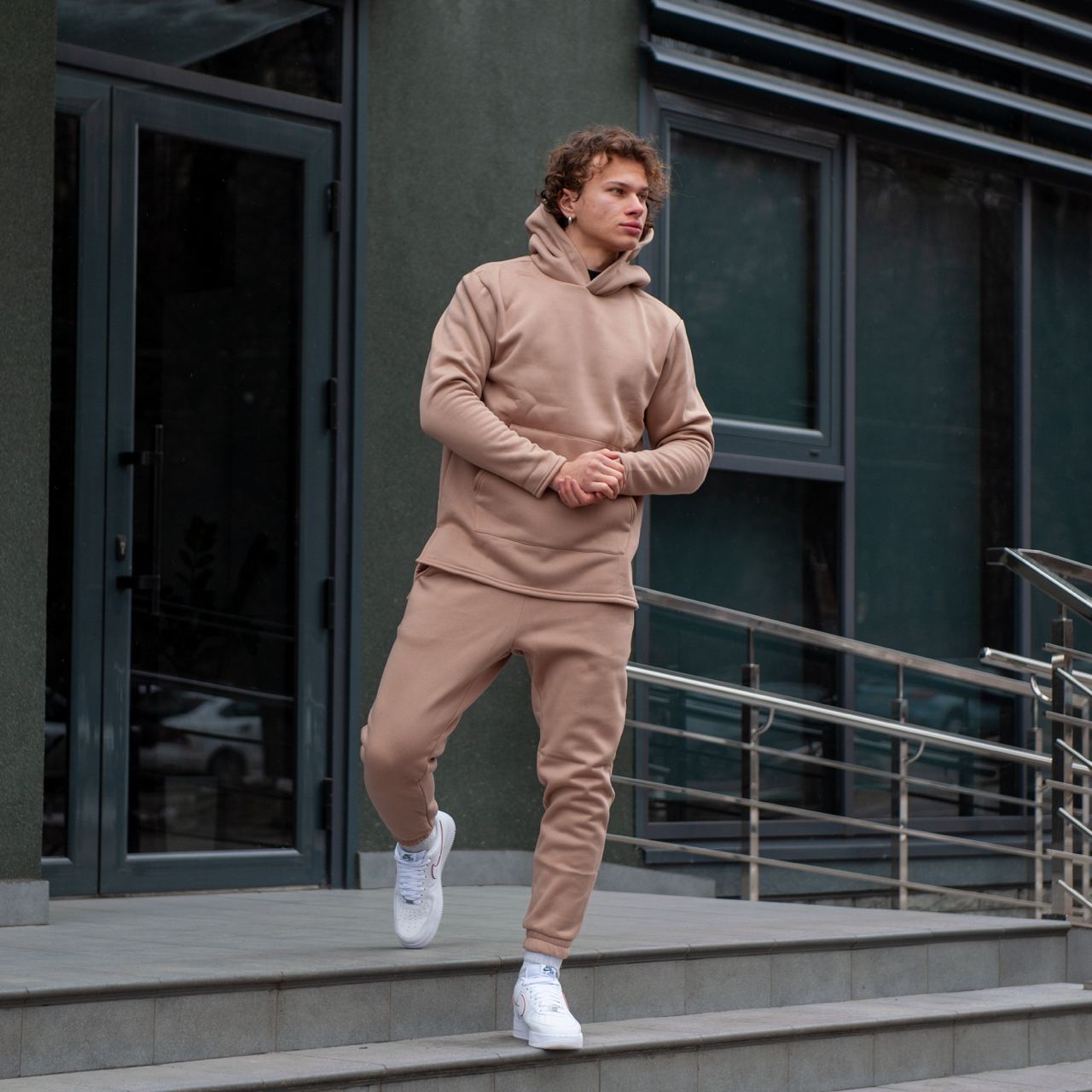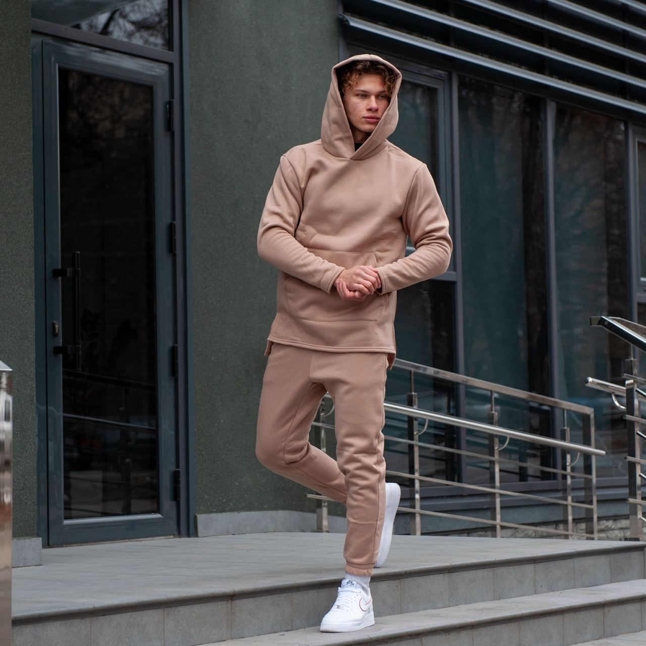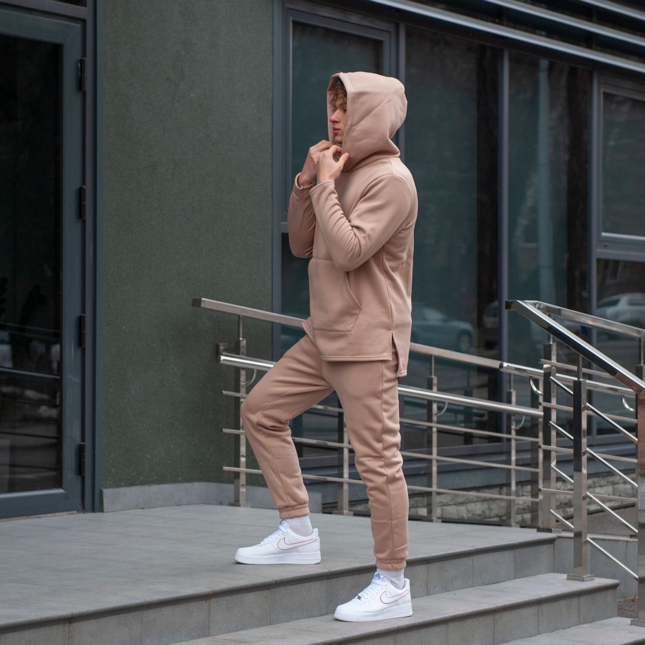 Чоловічий Базовий Костюм Бежевий Теплий на Флісі – Худі Подовжене Ззаду + Штани Джоггери