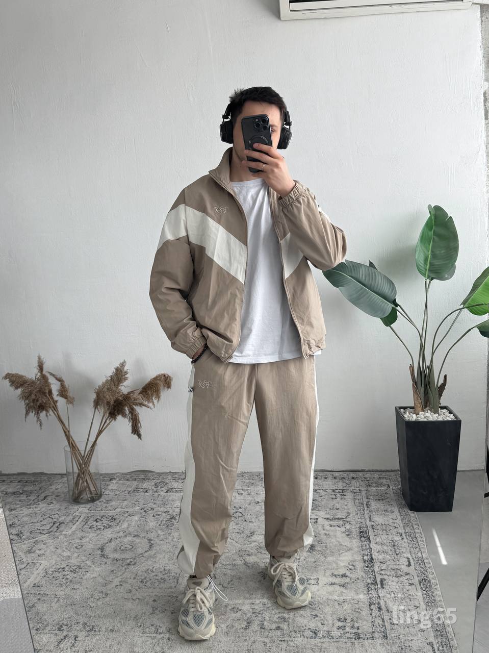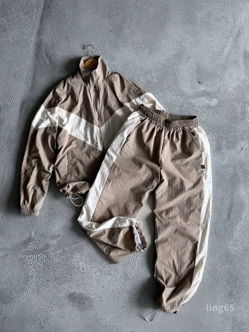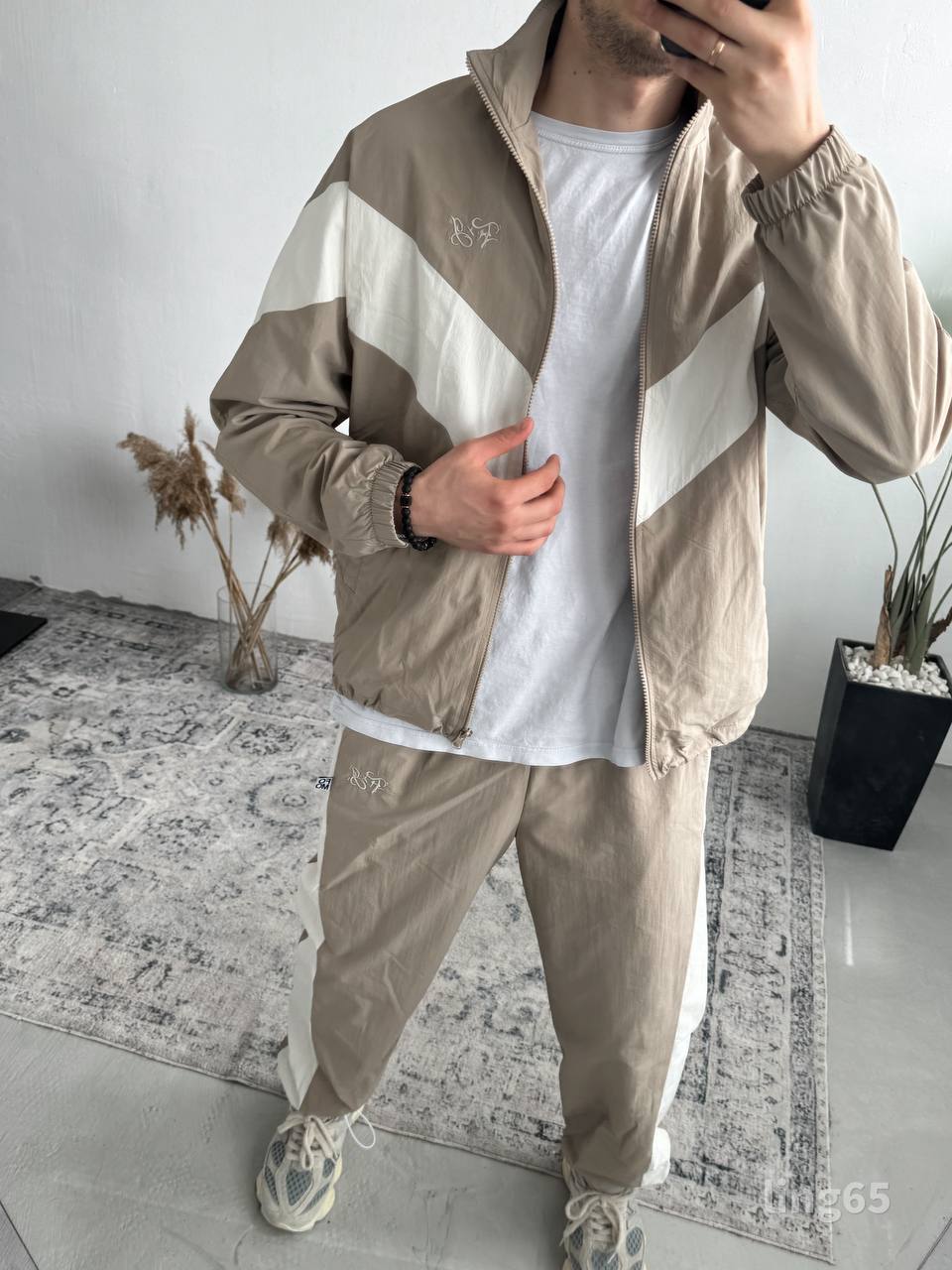 Чоловічий Бежевий Спортивний Костюм Плащівка на Блискавці та Затяжках – Вільного Крою з Білими Лампасами