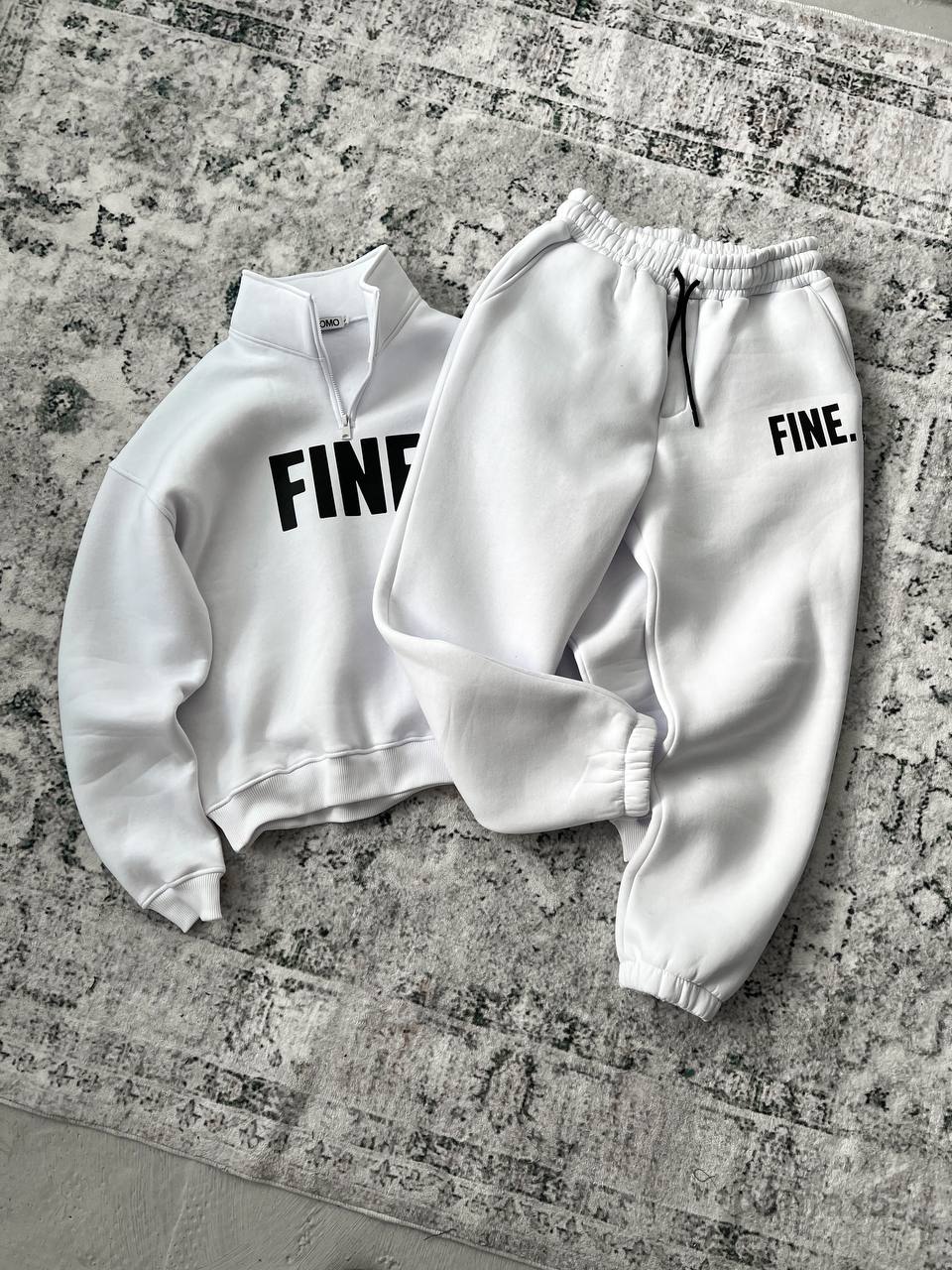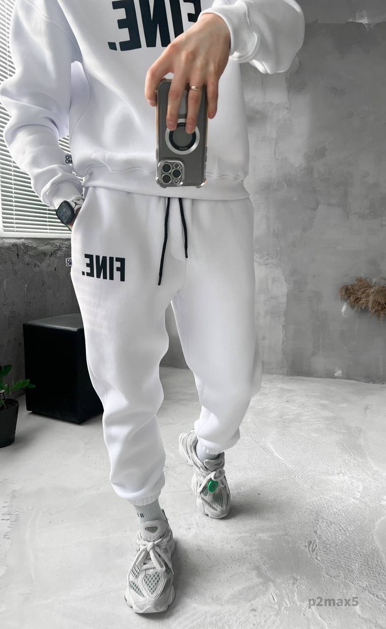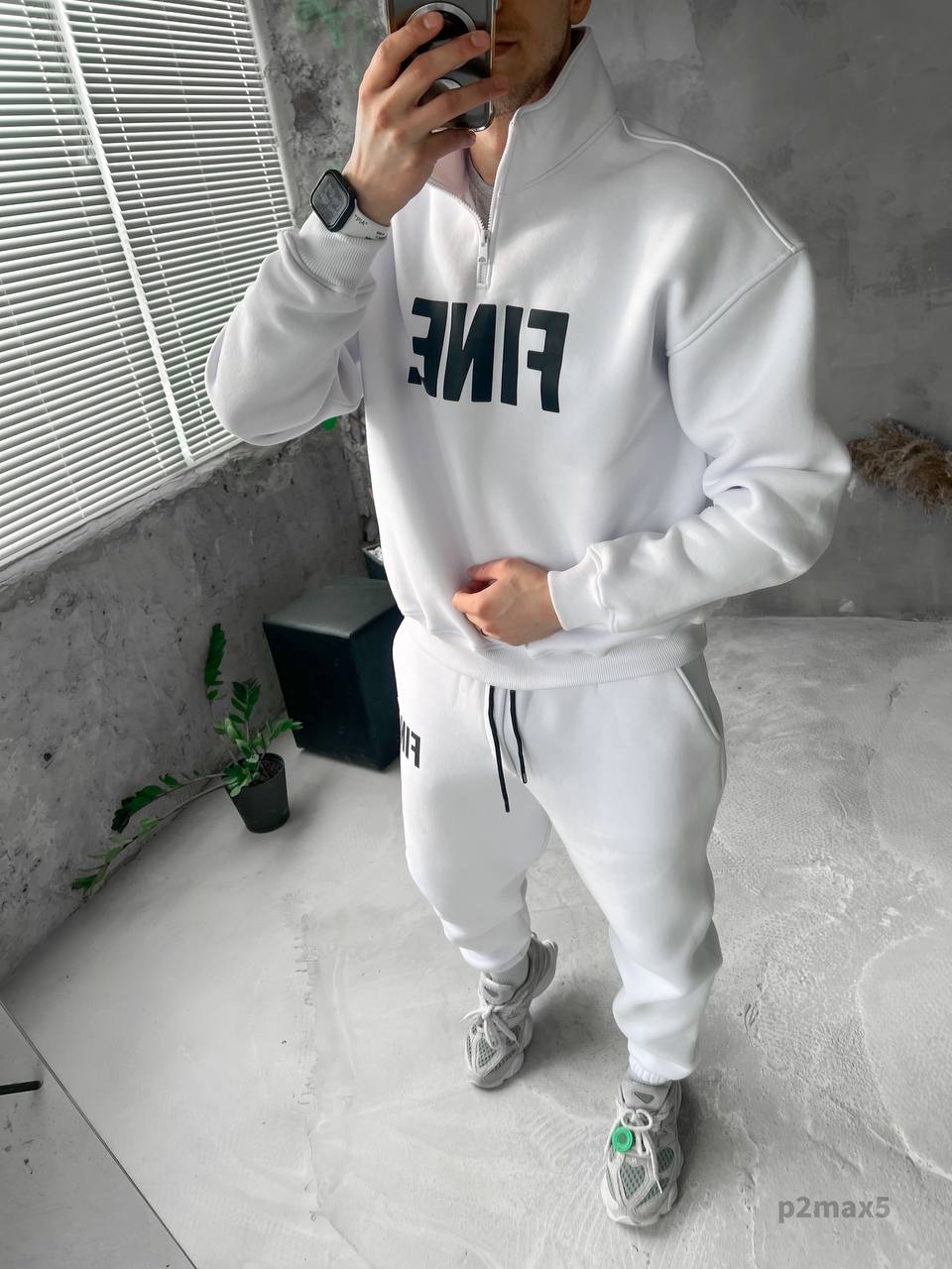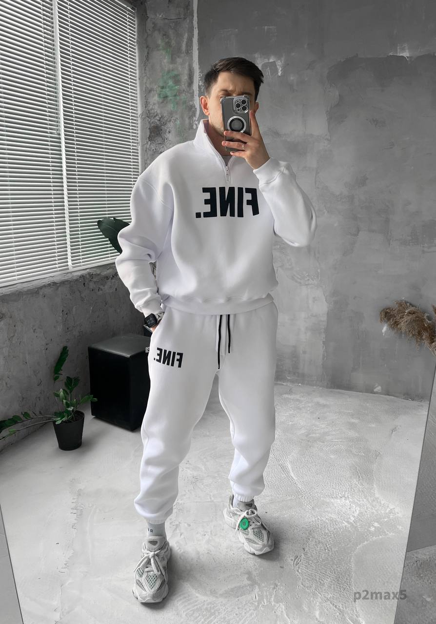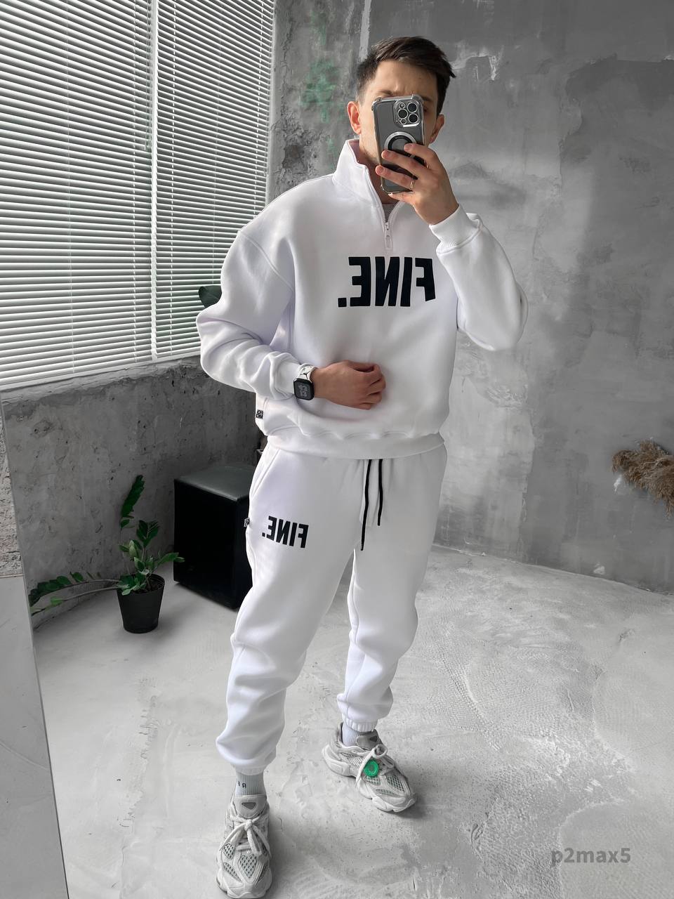 Чоловічий Білий Костюм з Написом “Fine” – Світшот під Горло + Штани Джогери