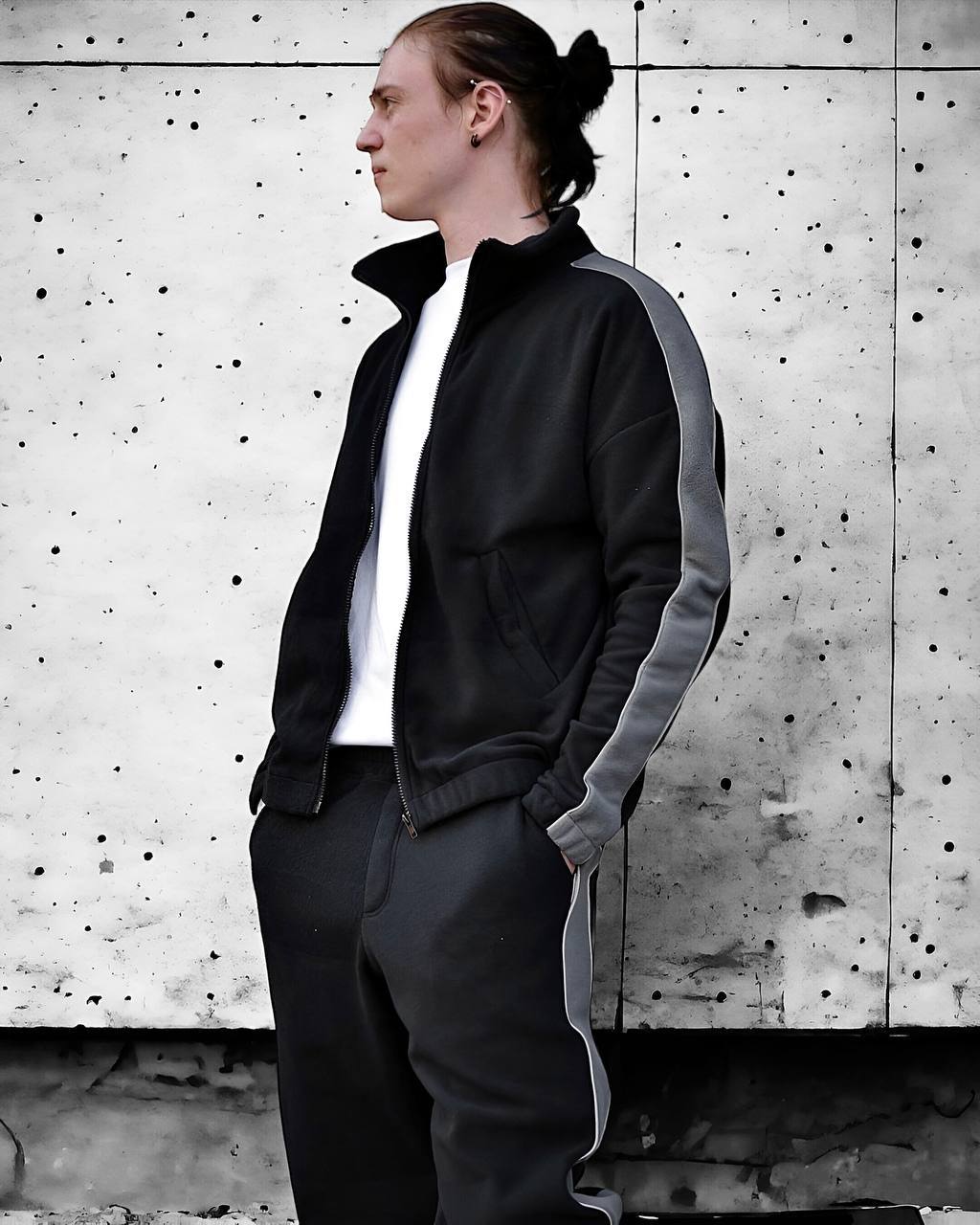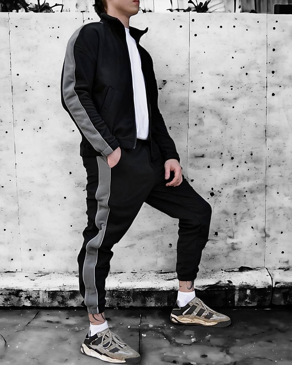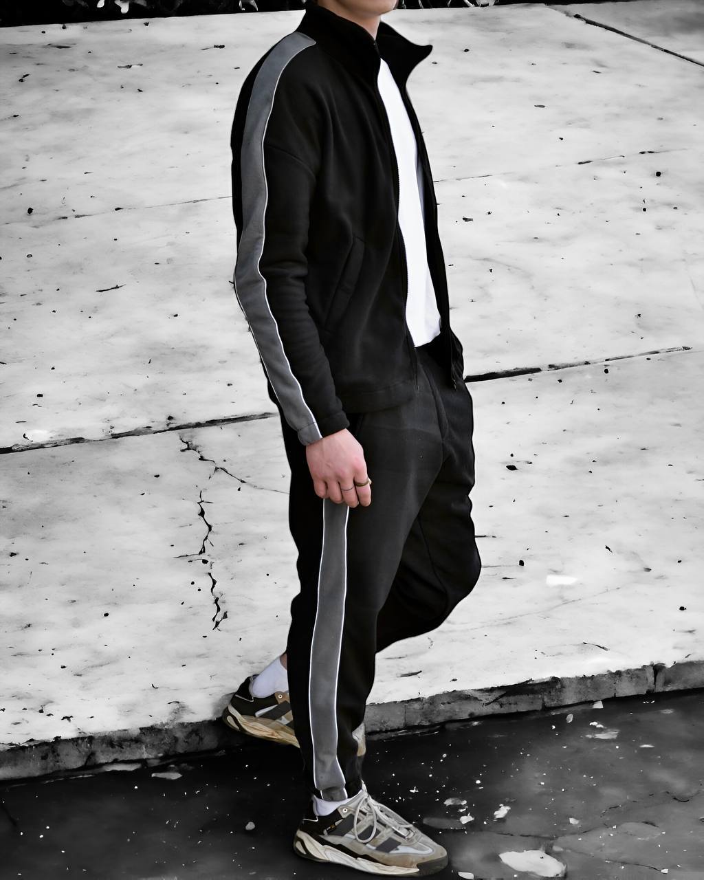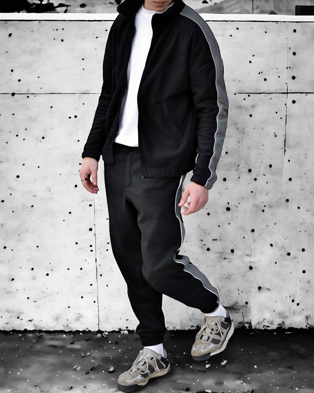 Чоловічий Чорний Костюм Флісовий з Лампасами – Кофта на Блискавці + Брюки Джогери