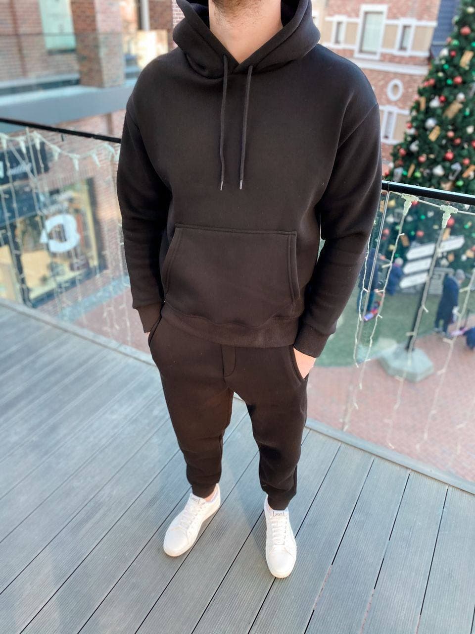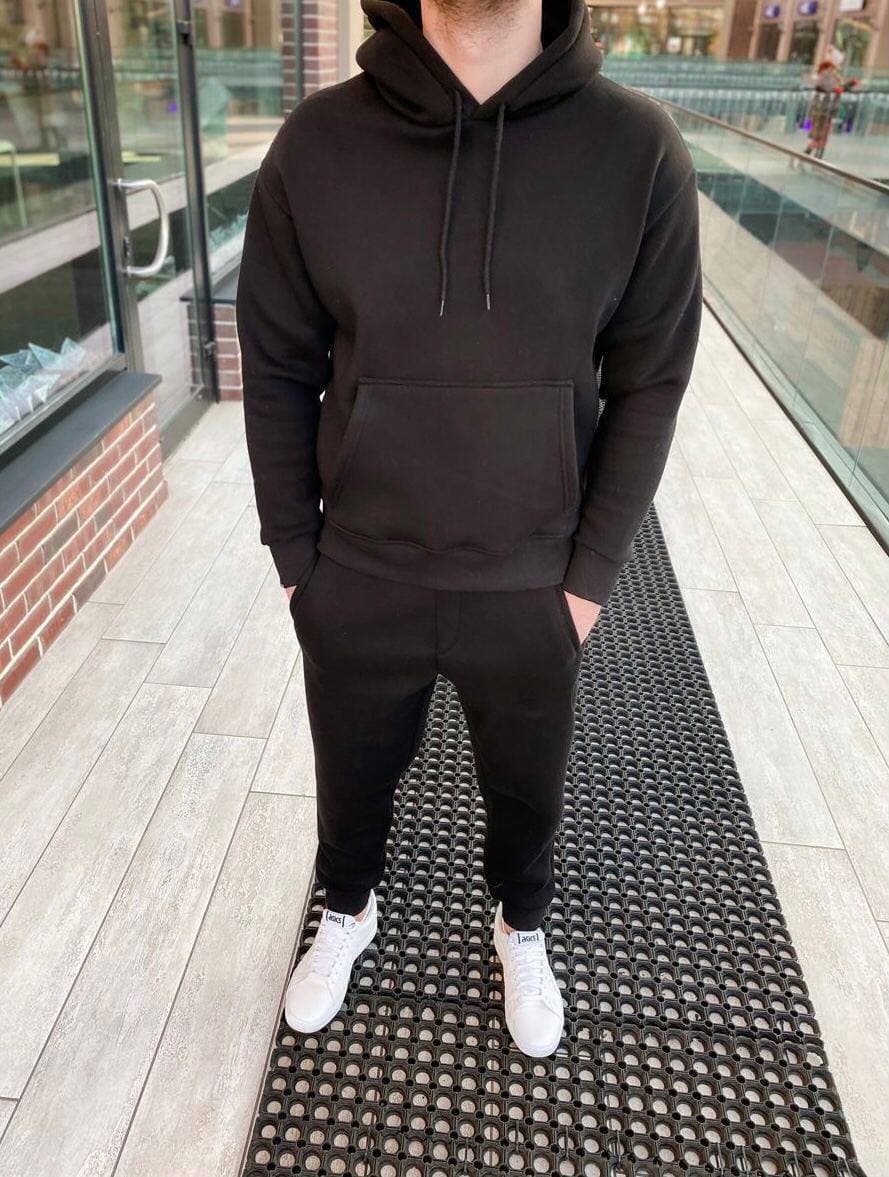 Чоловічий Чорний Костюм Оверсайз на флісі – Утеплений (Худі + Штани)