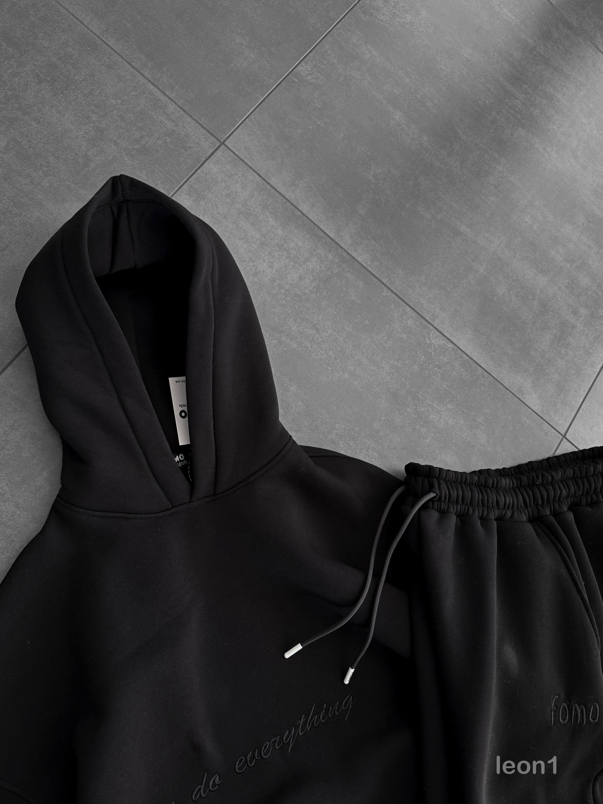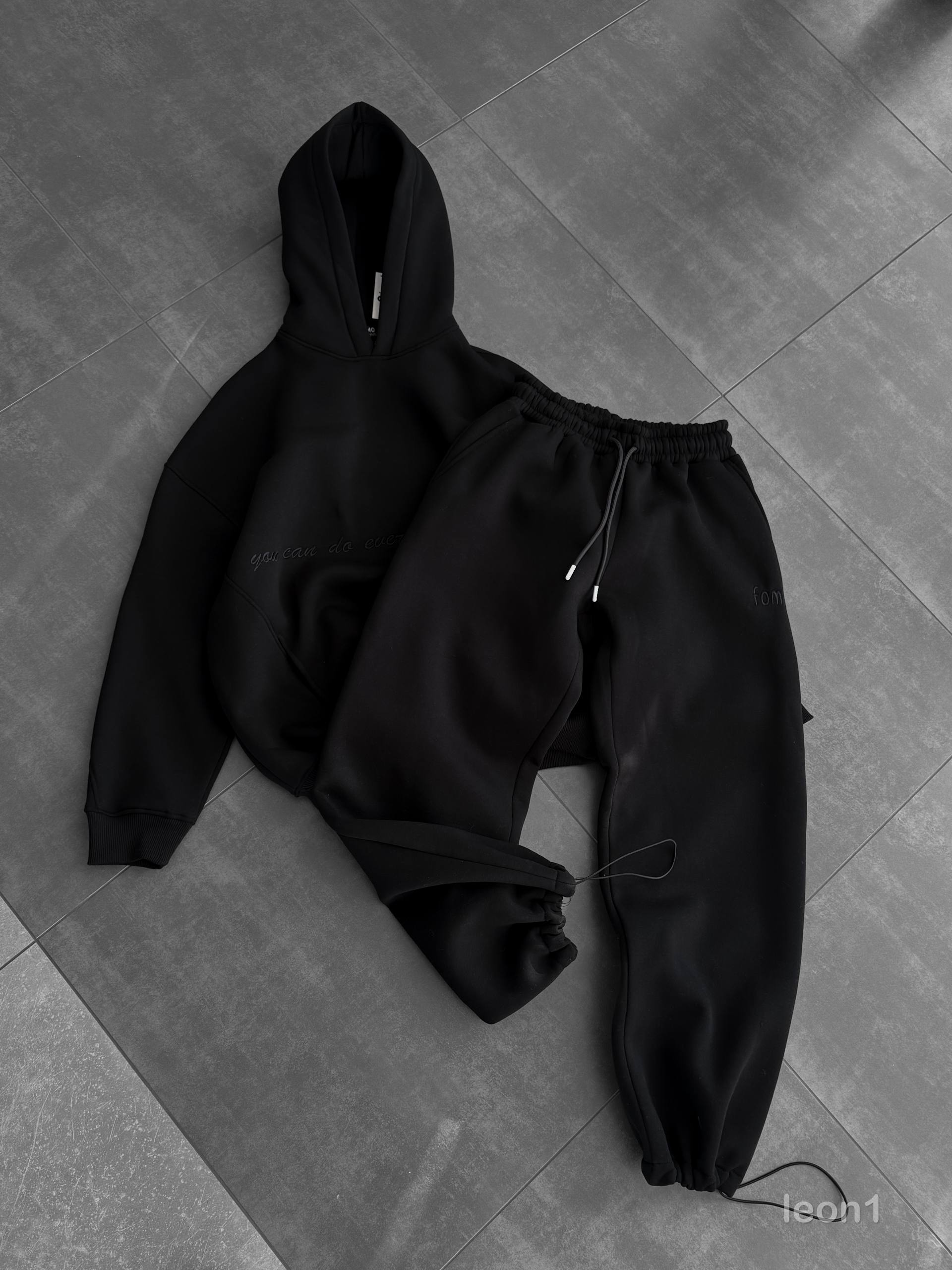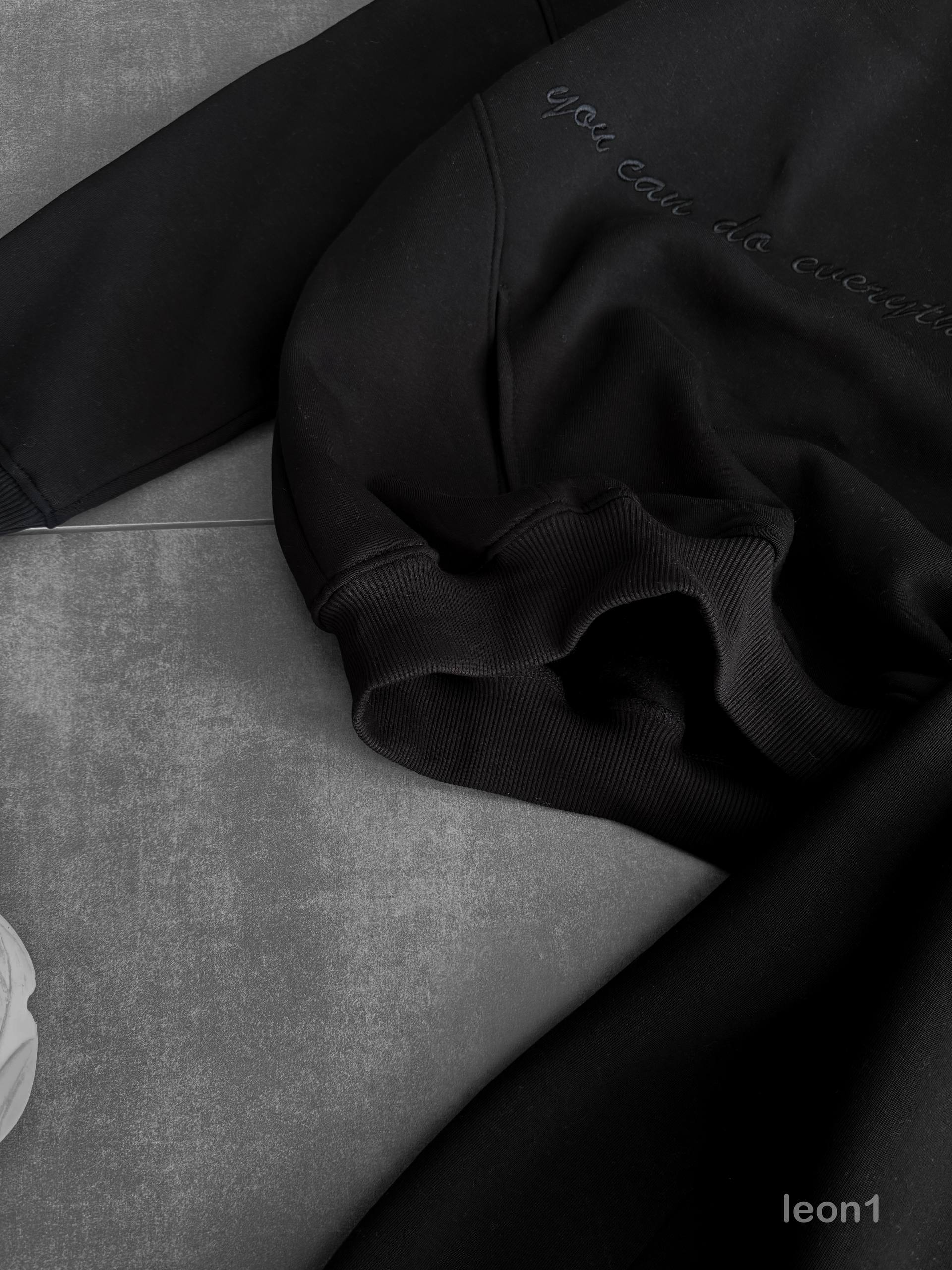 Чоловічий Чорний Спортивний Костюм Худі Штани з Вишитим Написом – Утеплений на Флісі