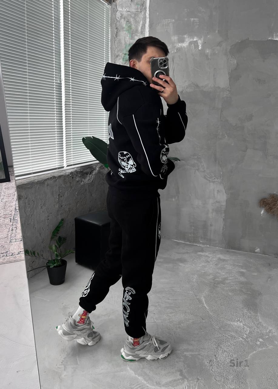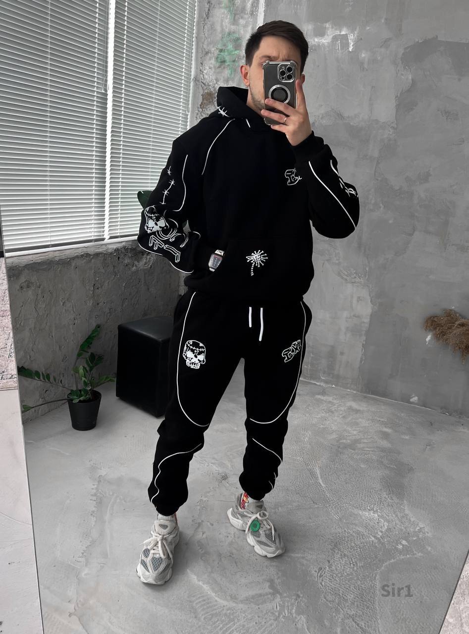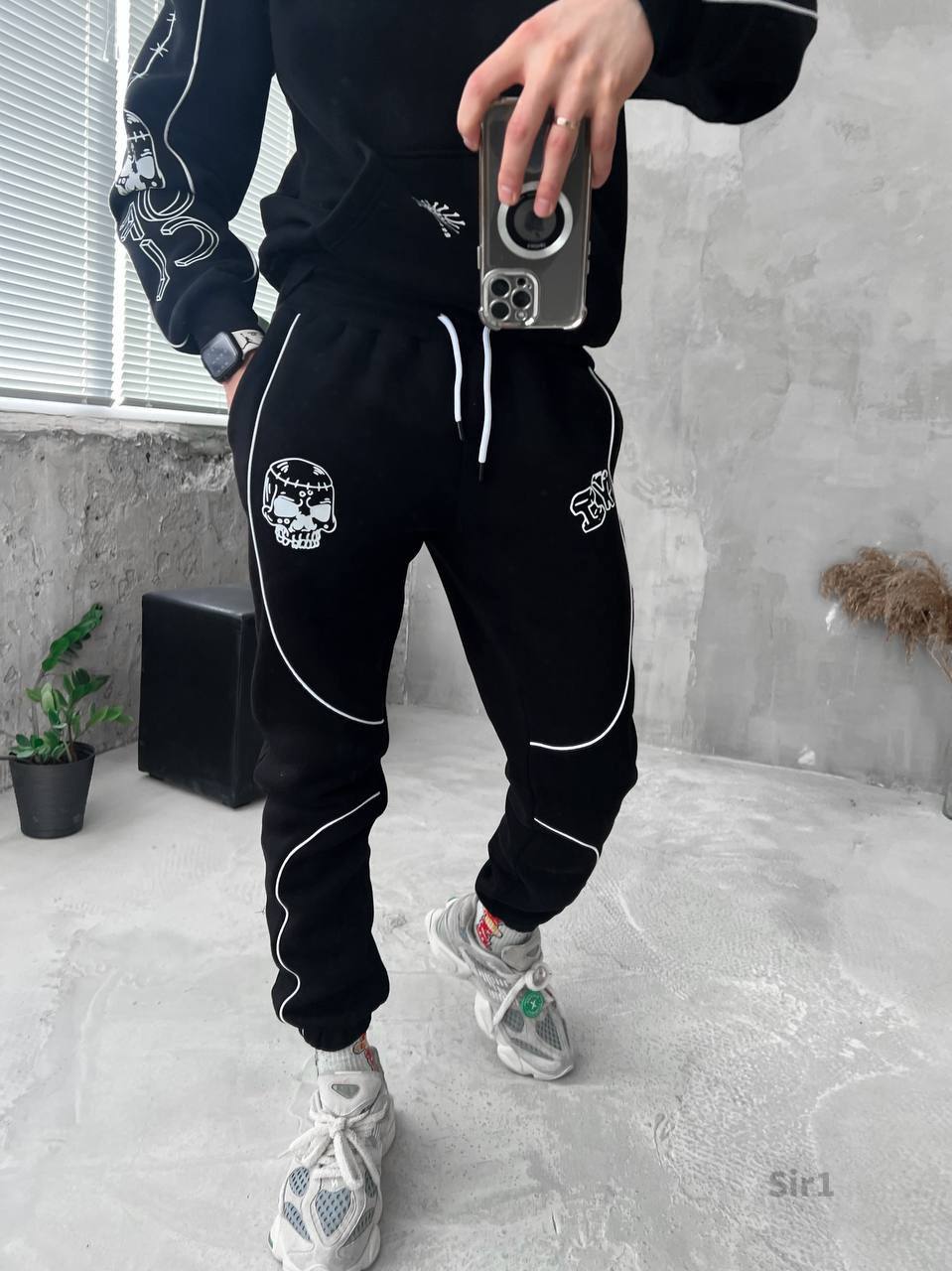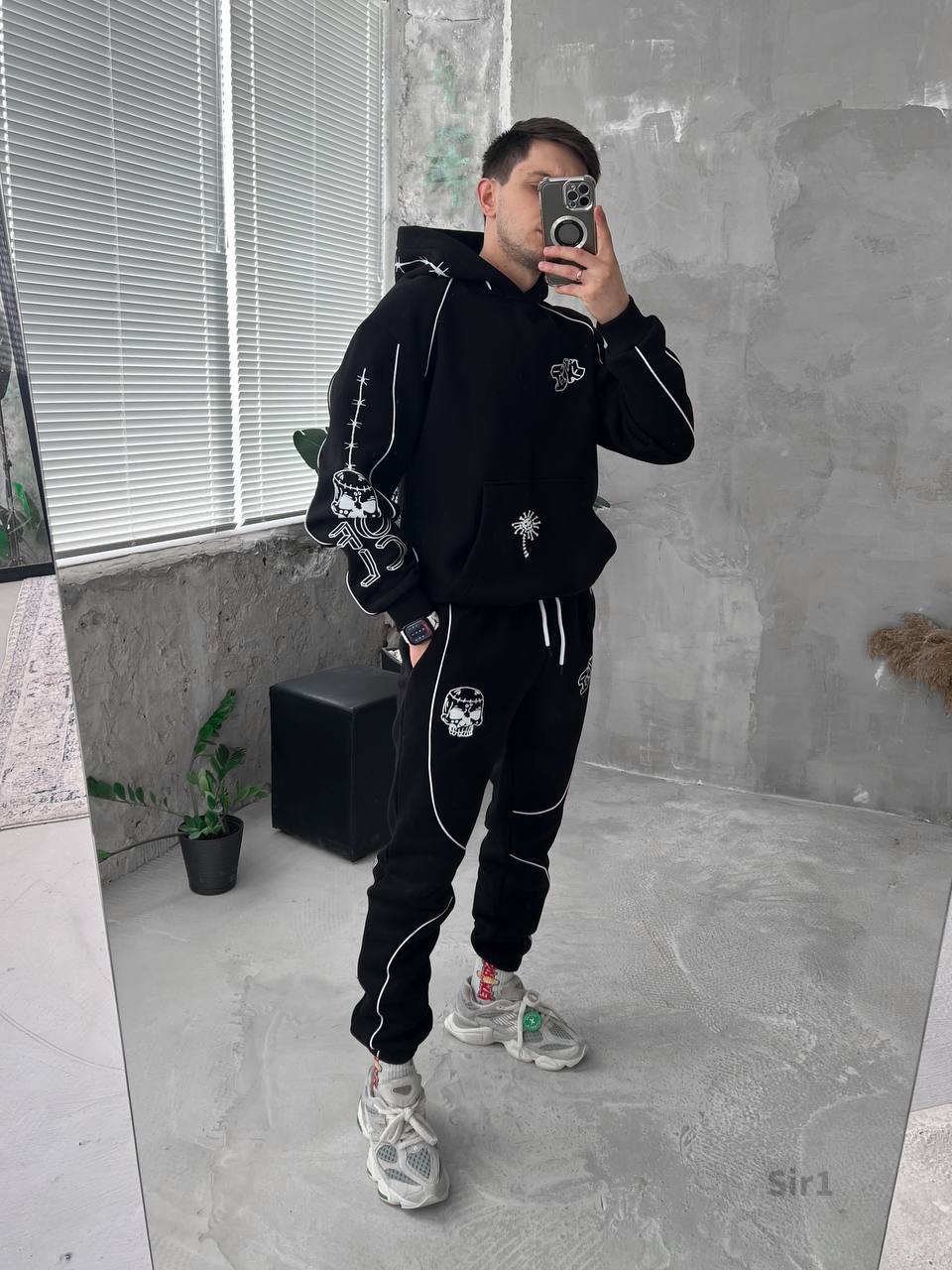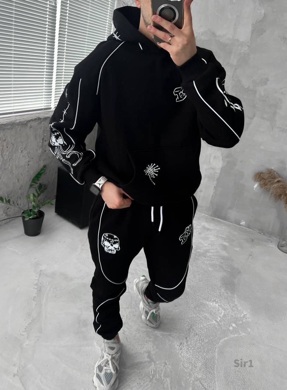 Чоловічий Чорний Спортивний Костюм Оверсайз з Принтами та Кантом – Утеплений на Флісі