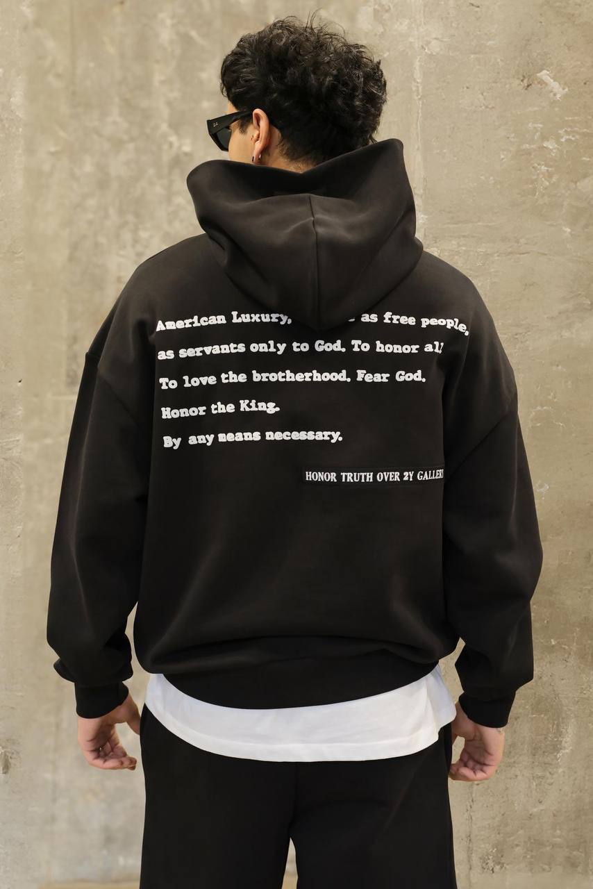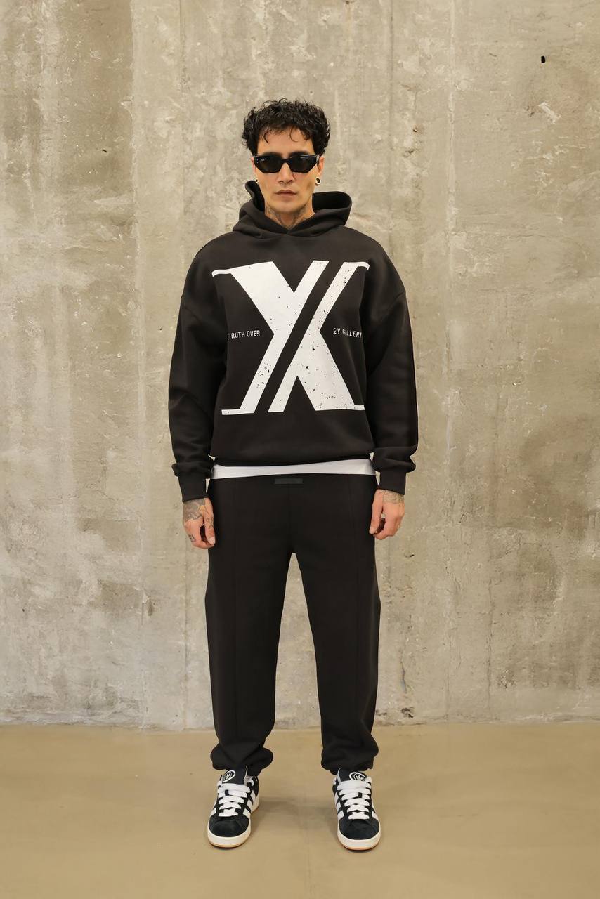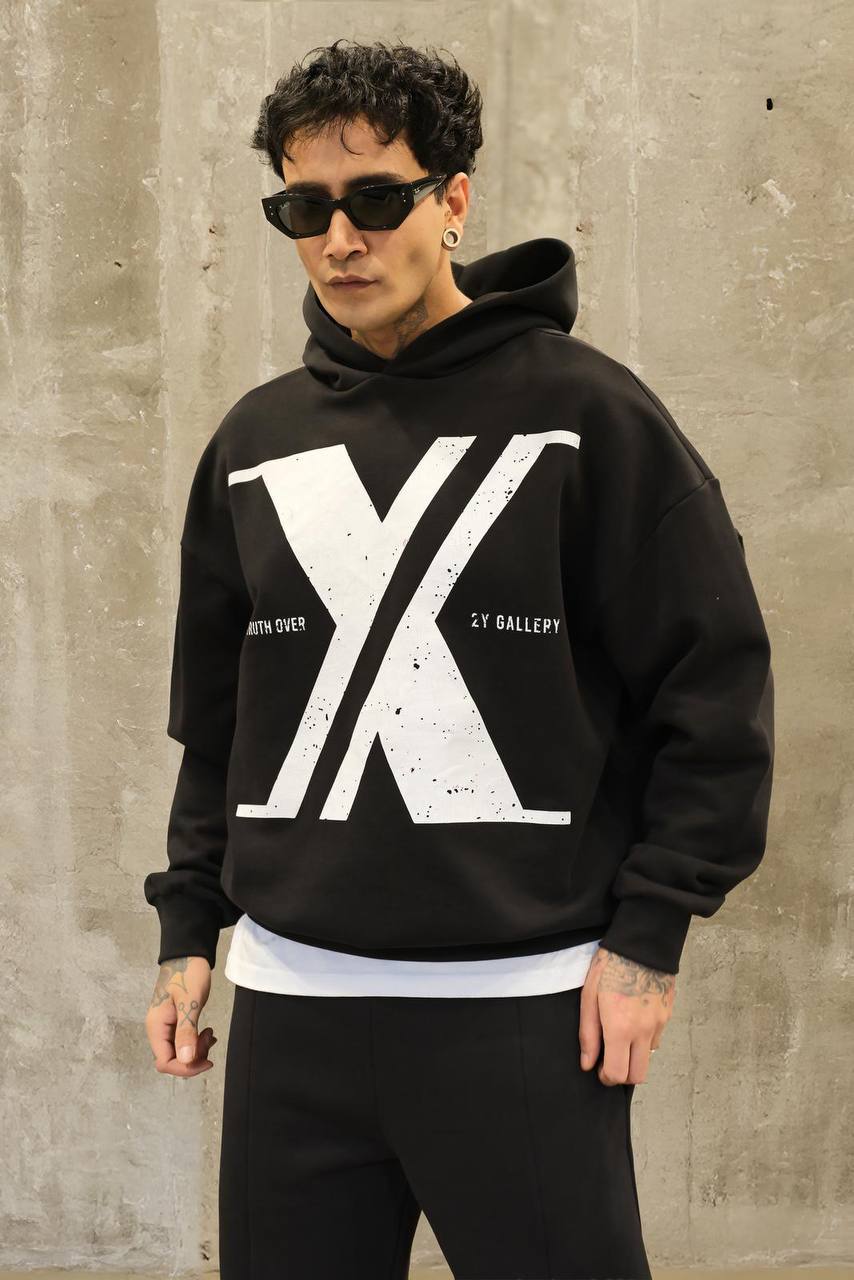 Чоловічий Чорний Спортивний Костюм Оверсайз з Прінтом на Флісі (Толстовка + Штани)