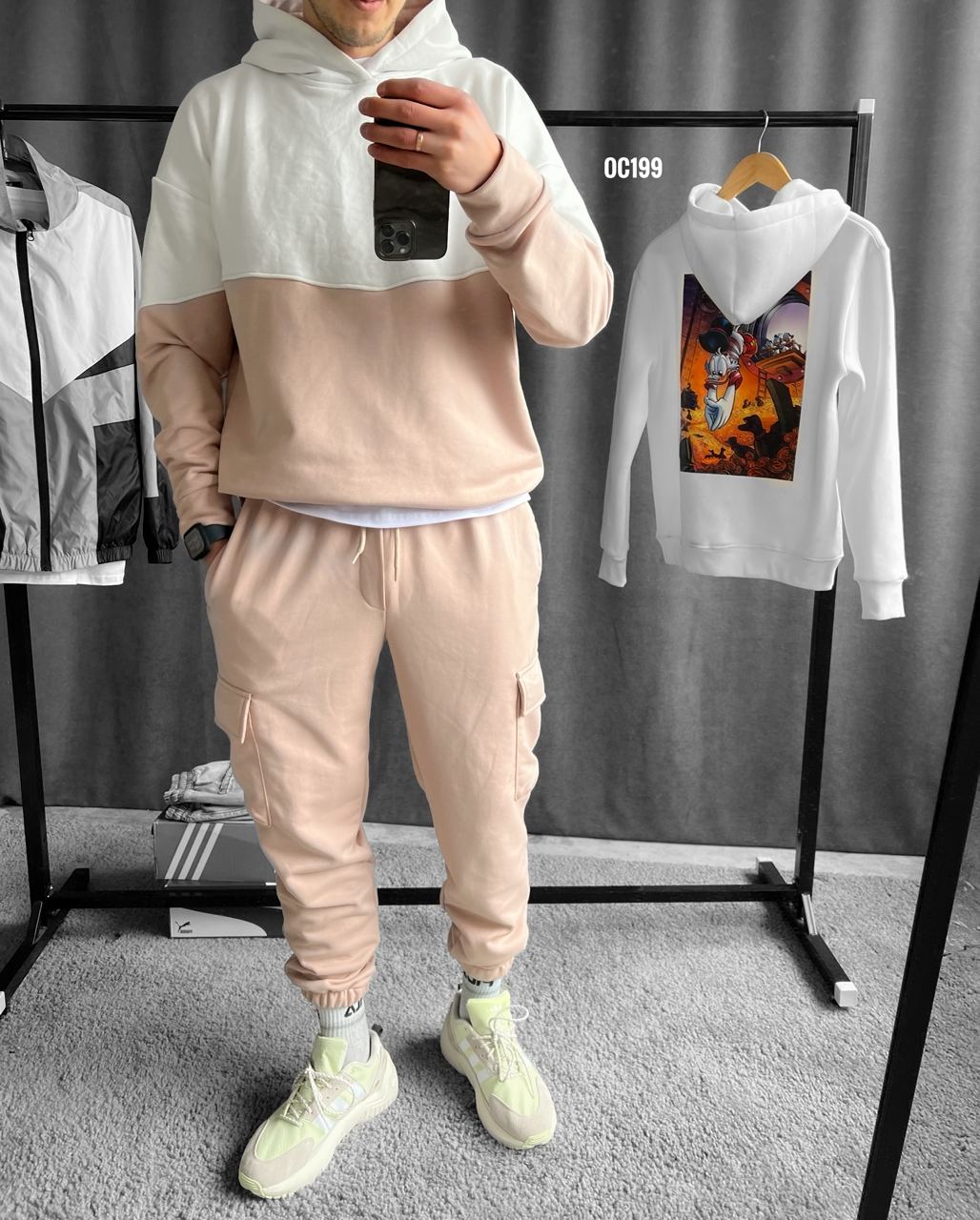 Чоловічий Двоколірний Бежевий з Білим Костюм Вільного Крою – Худі Оверсайз + Штани Карго