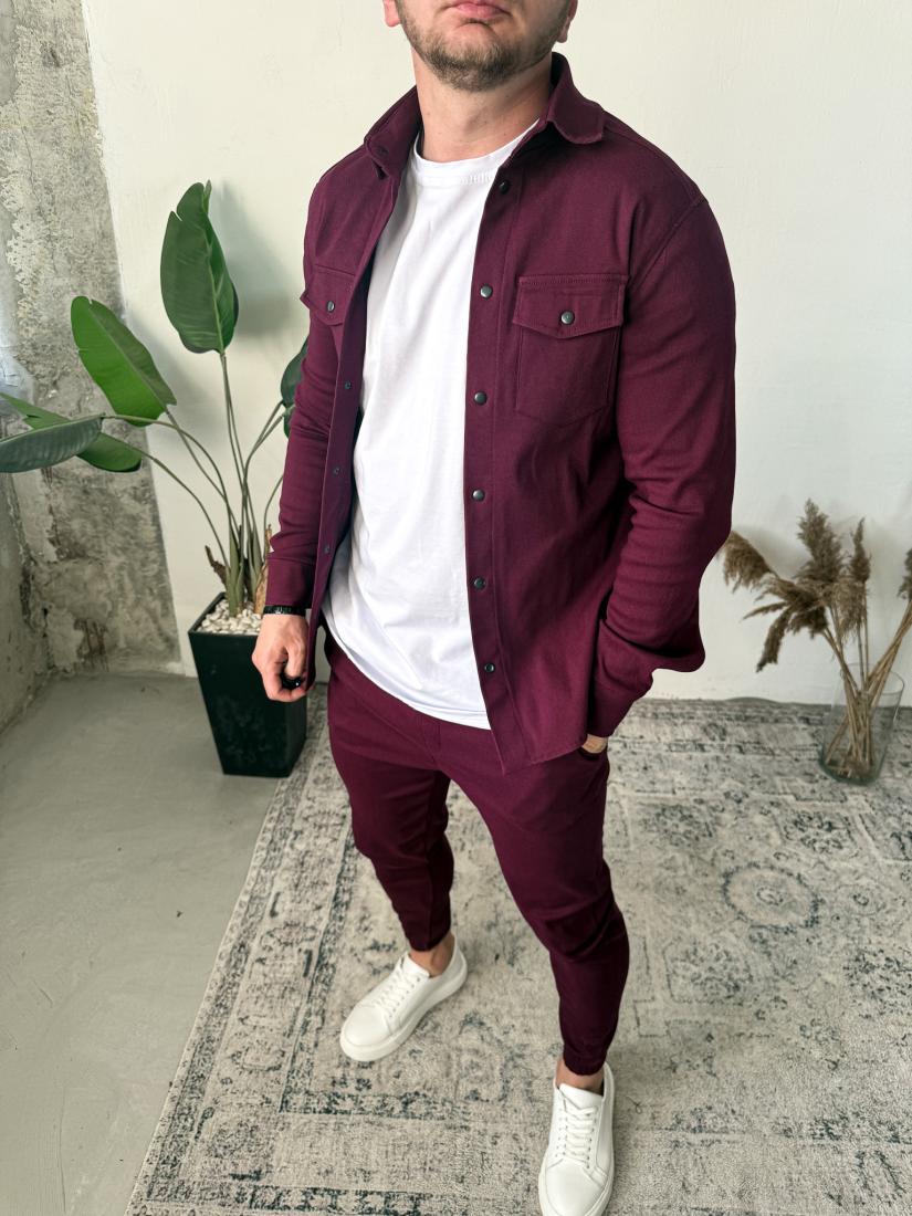 Чоловічий Котоновий Бордовий Костюм – Сорочка з Кишенями + Штани з Манжетами