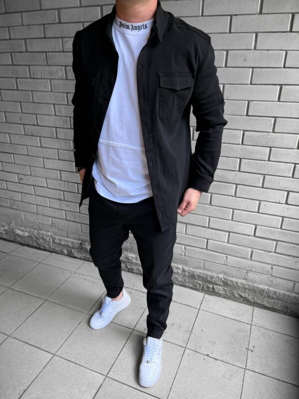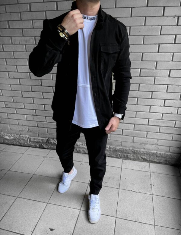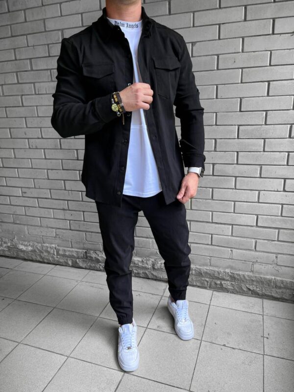 Чоловічий Коттоновий Чорний Костюм – Сорочка з Кишенями + Штани з Манжетами