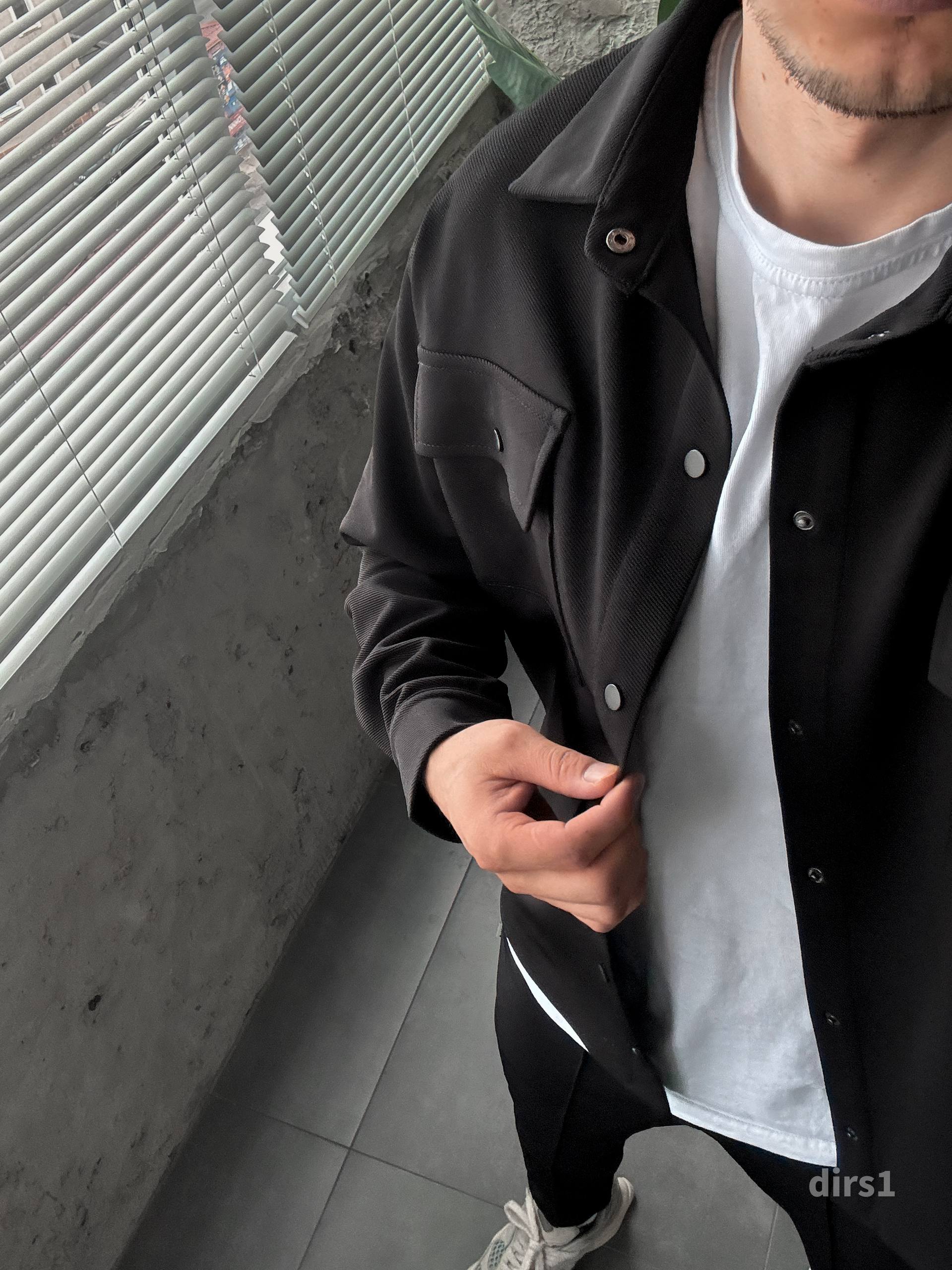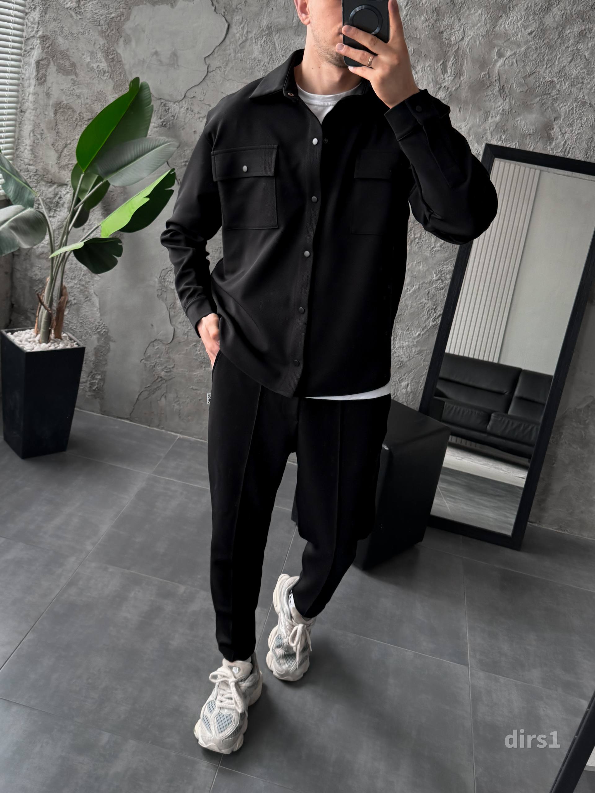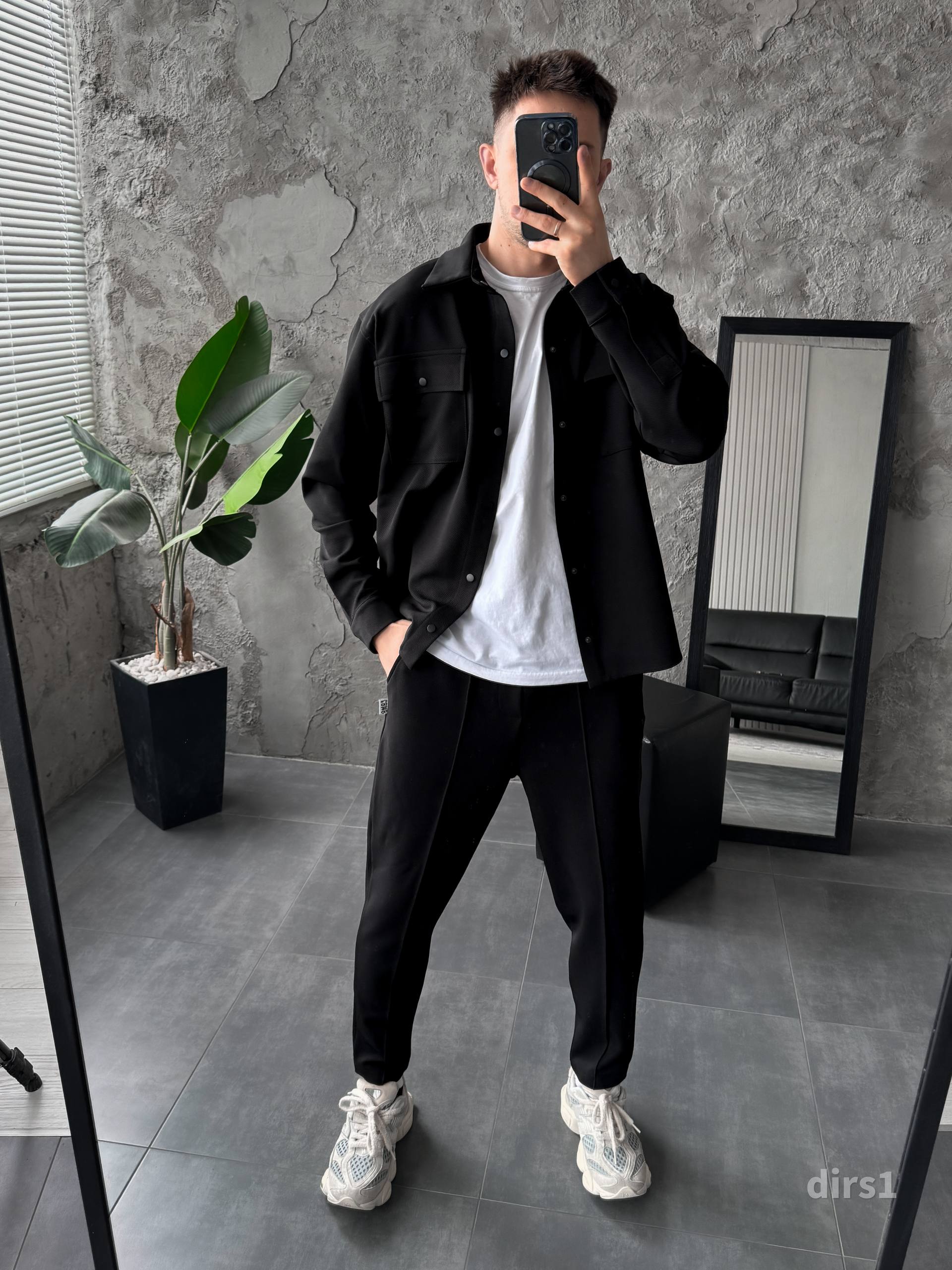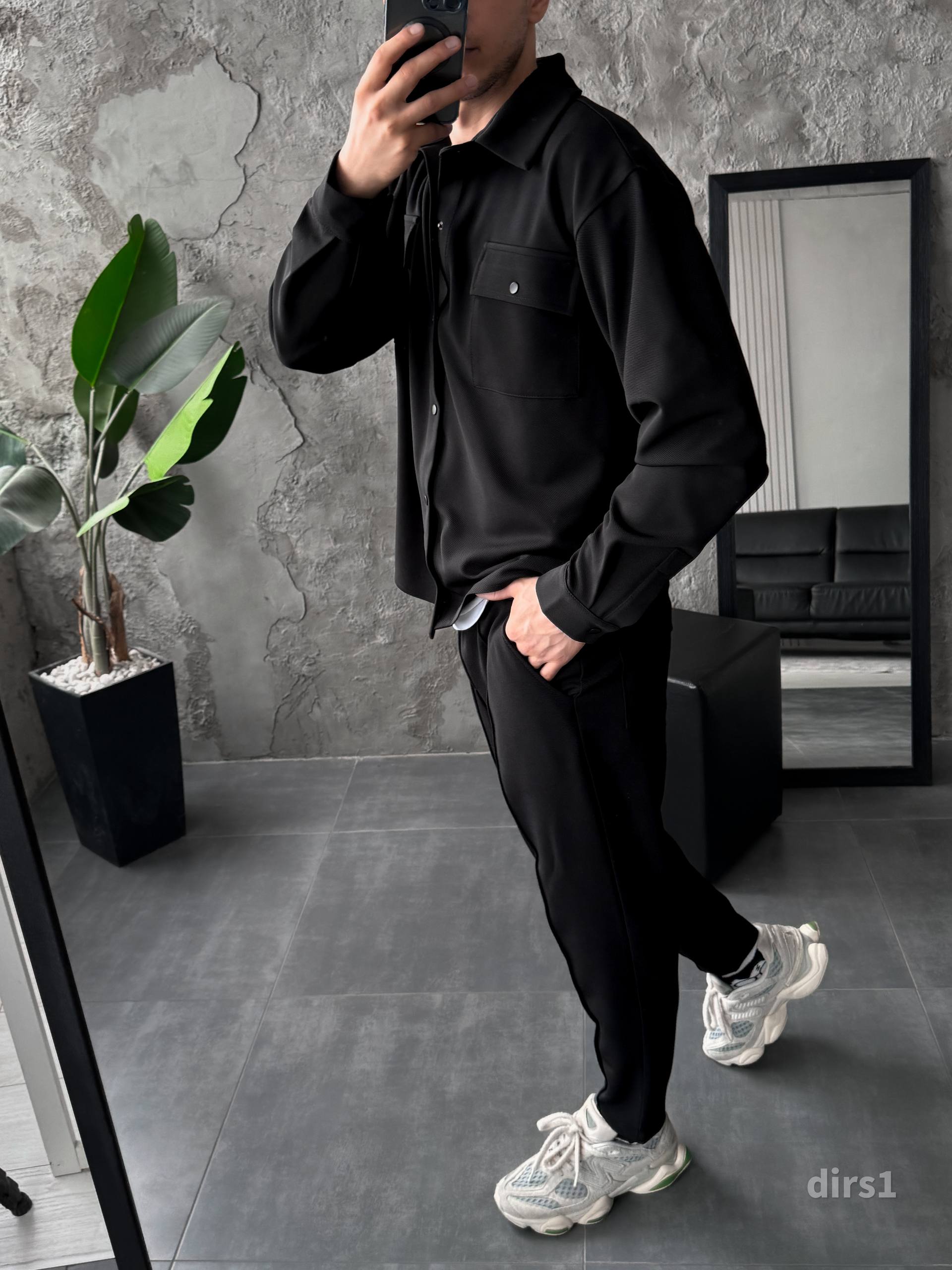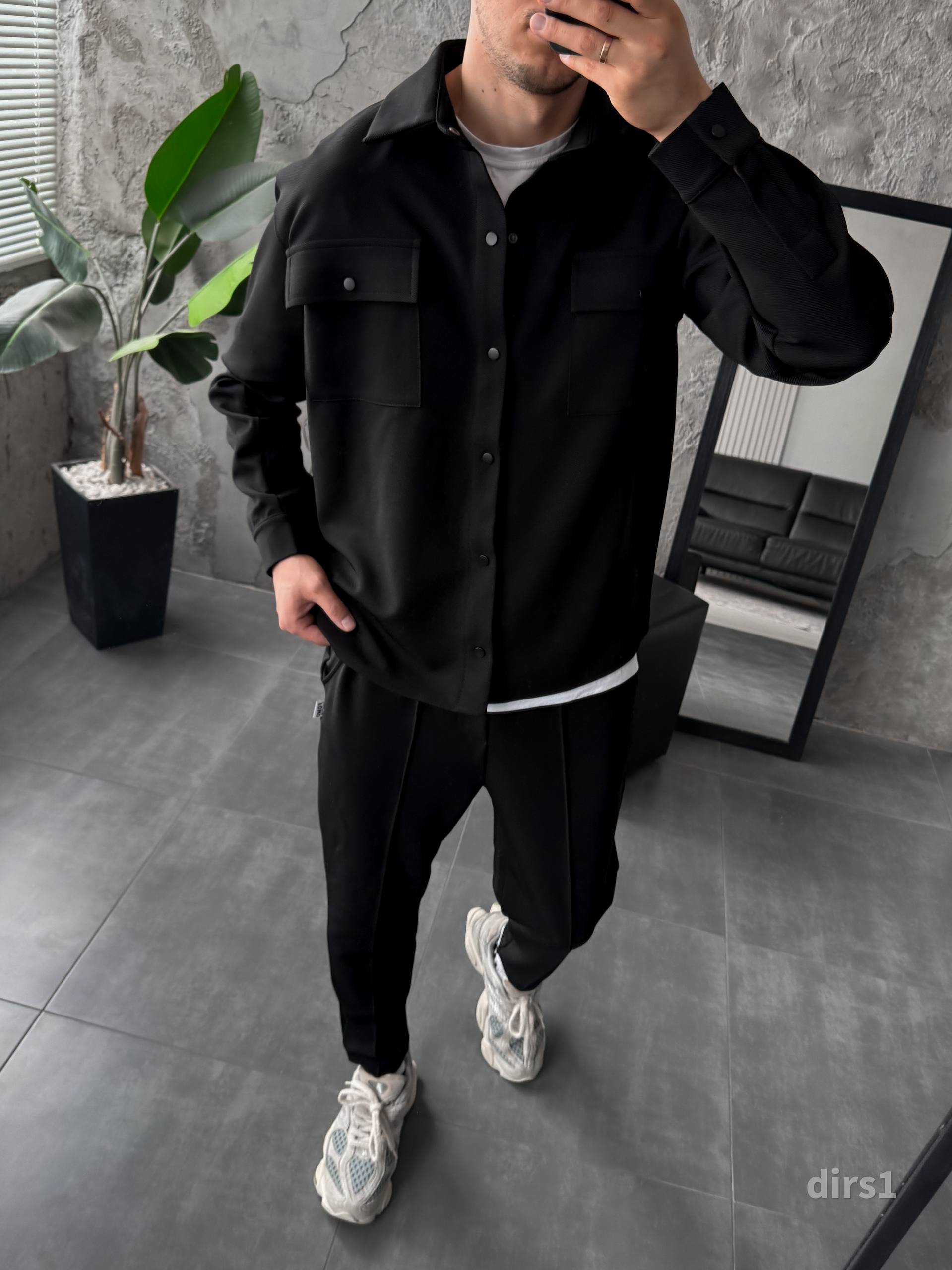 Чоловічий Щільний Вільний Чорний Костюм з Накладними Кишенями – Сорочка на Кнопках + Штани зі Стрілками