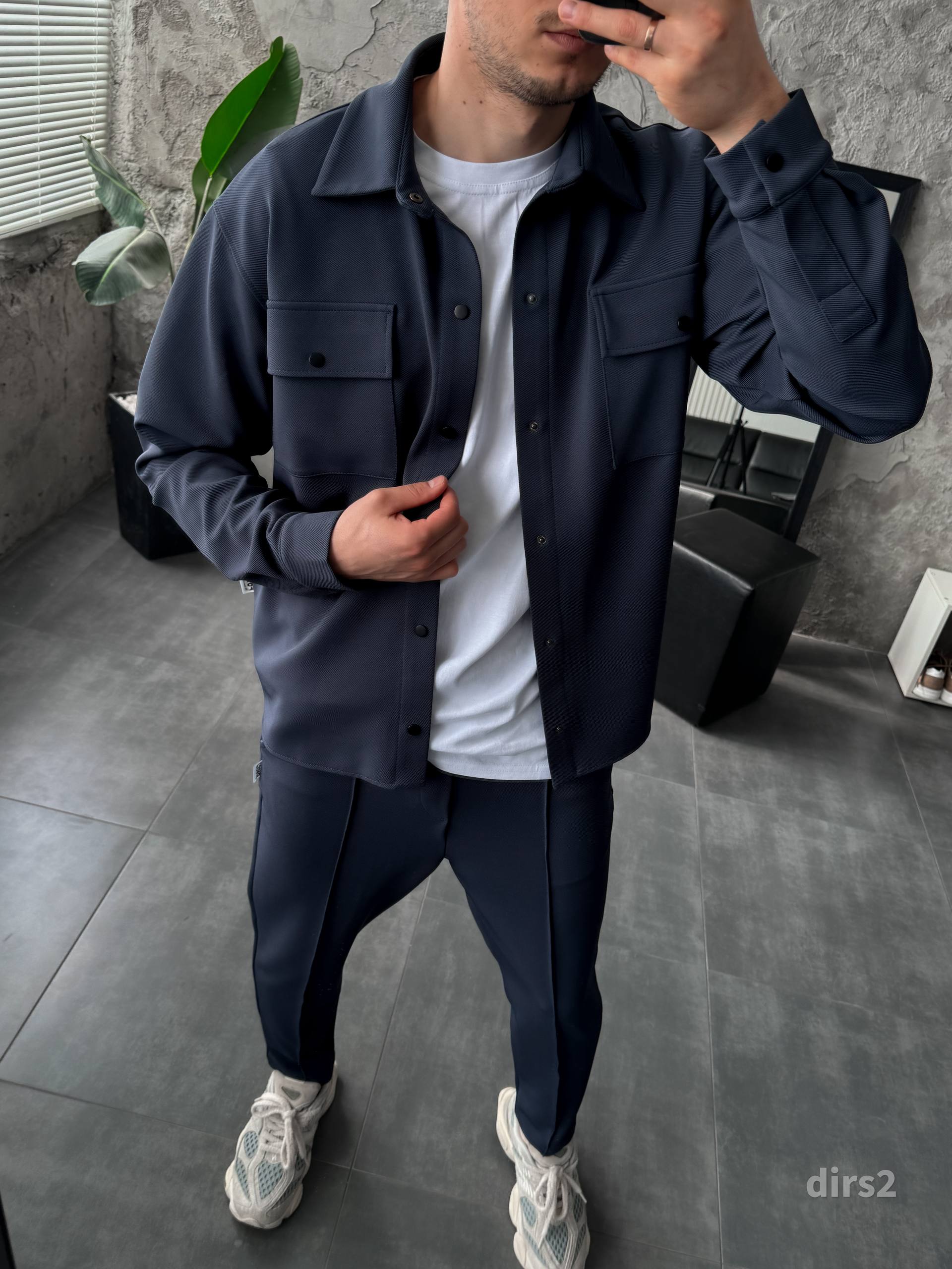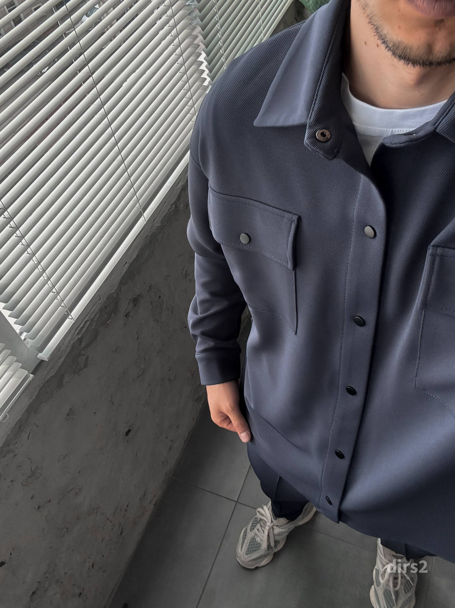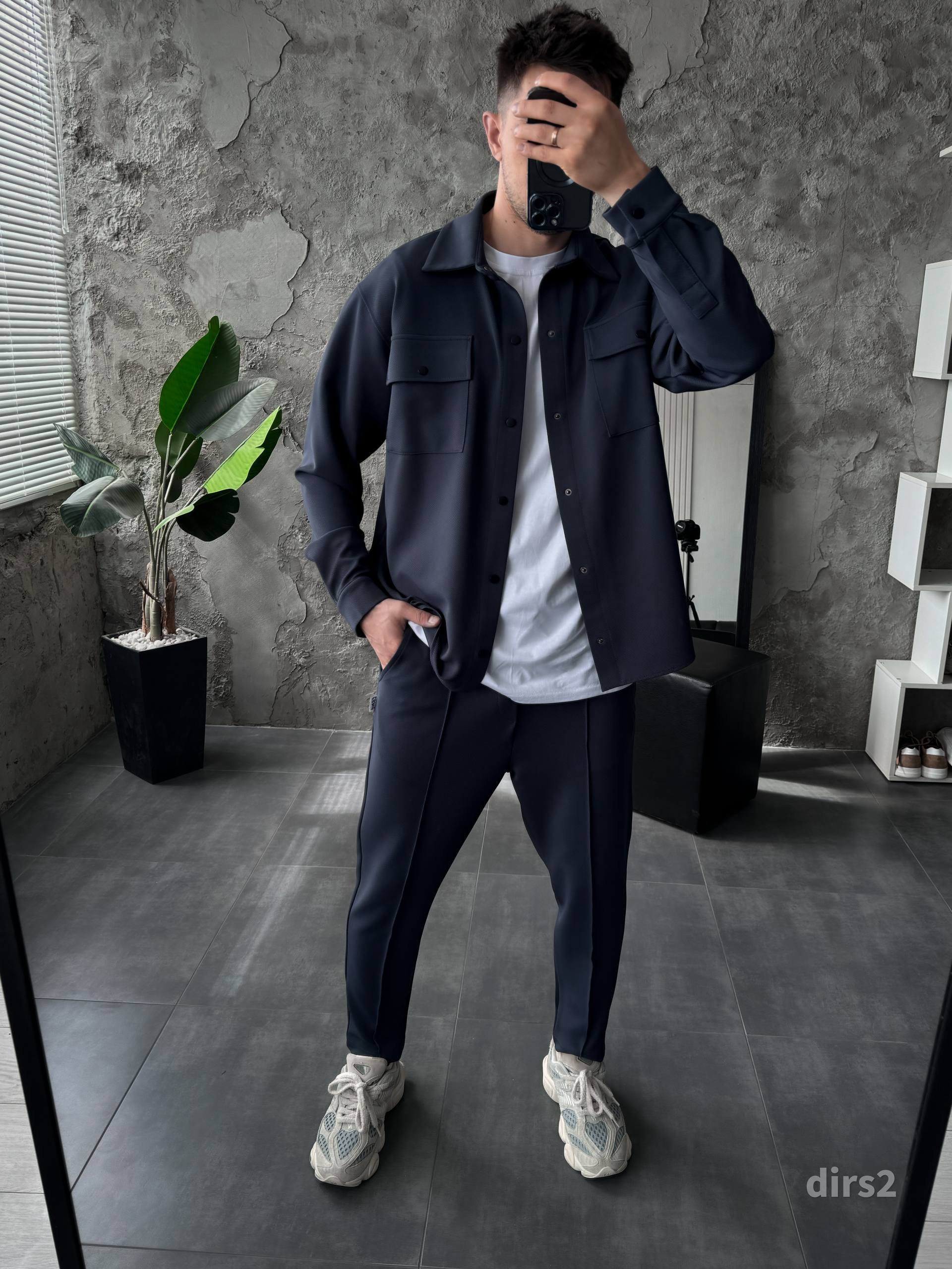 Чоловічий Щільний Вільний Графітовий Костюм з Накладними Кишенями – Сорочка на Кнопках + Штани зі Стрілками