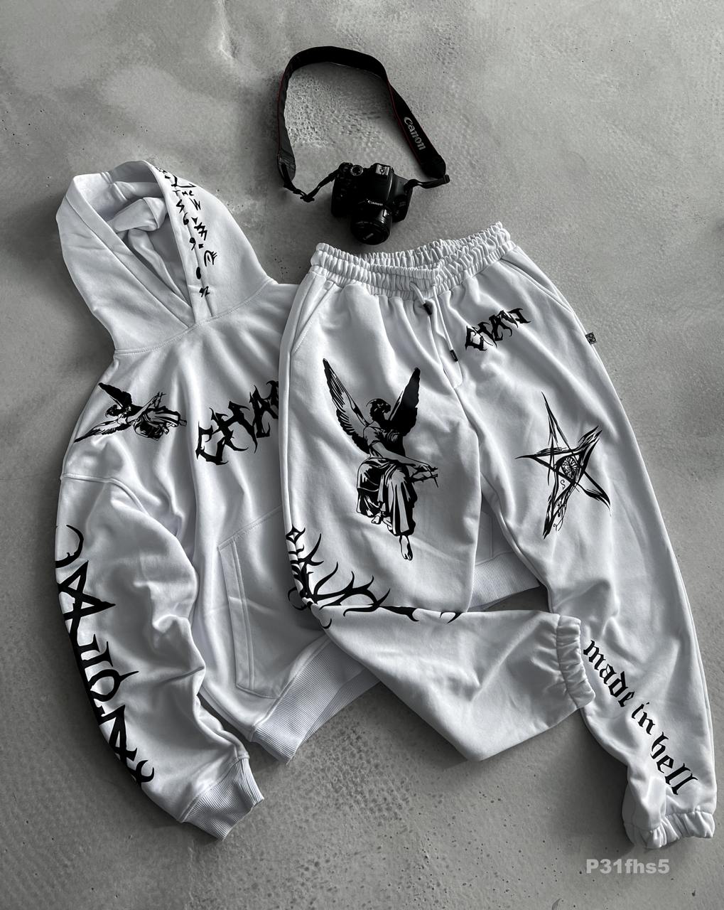 Чоловічий Теплий Білий Костюм Худі Джогери в Принтах