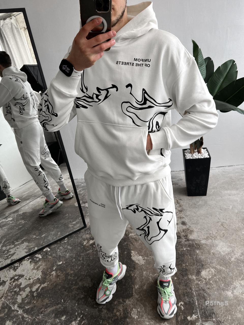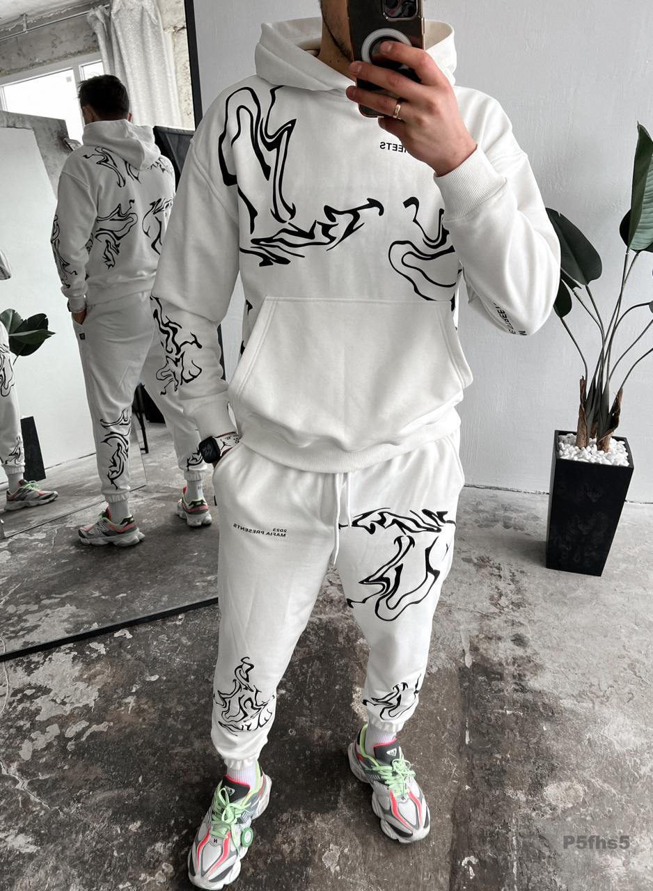 Чоловічий Теплий Білий Костюм з Принтом – Тринитка на Флісі