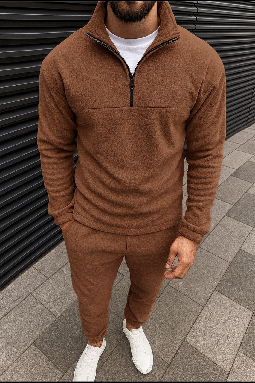 Чоловічий Теплий Коричневий Флісовий Костюм – Кофта з Коміром на Замку + Штани з Манжетами