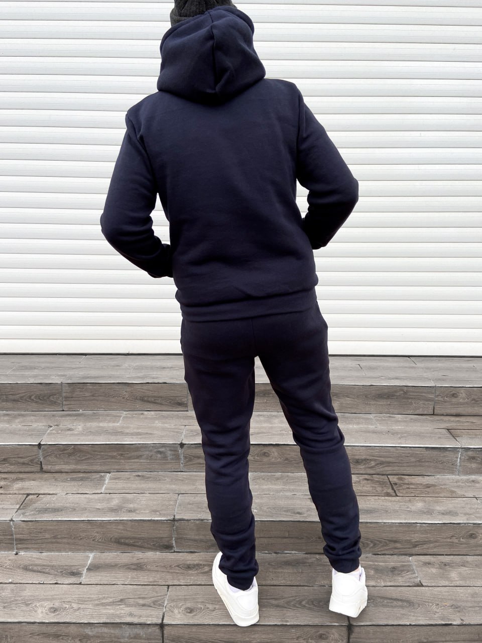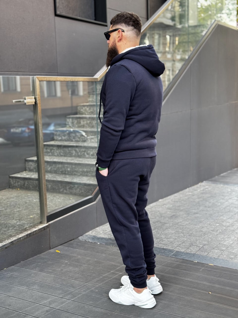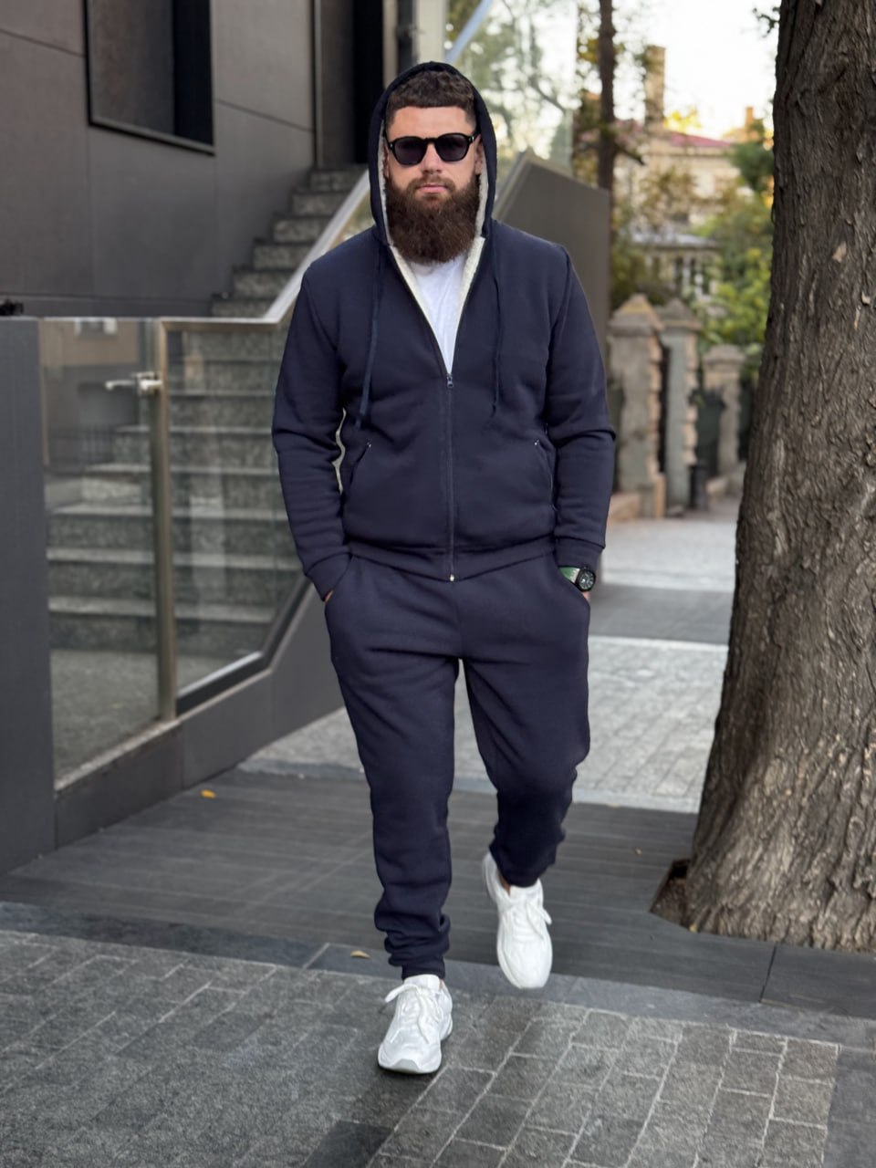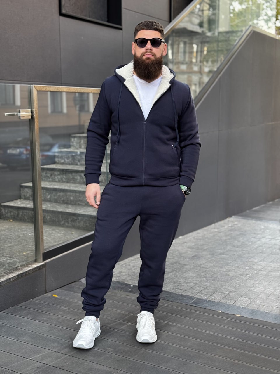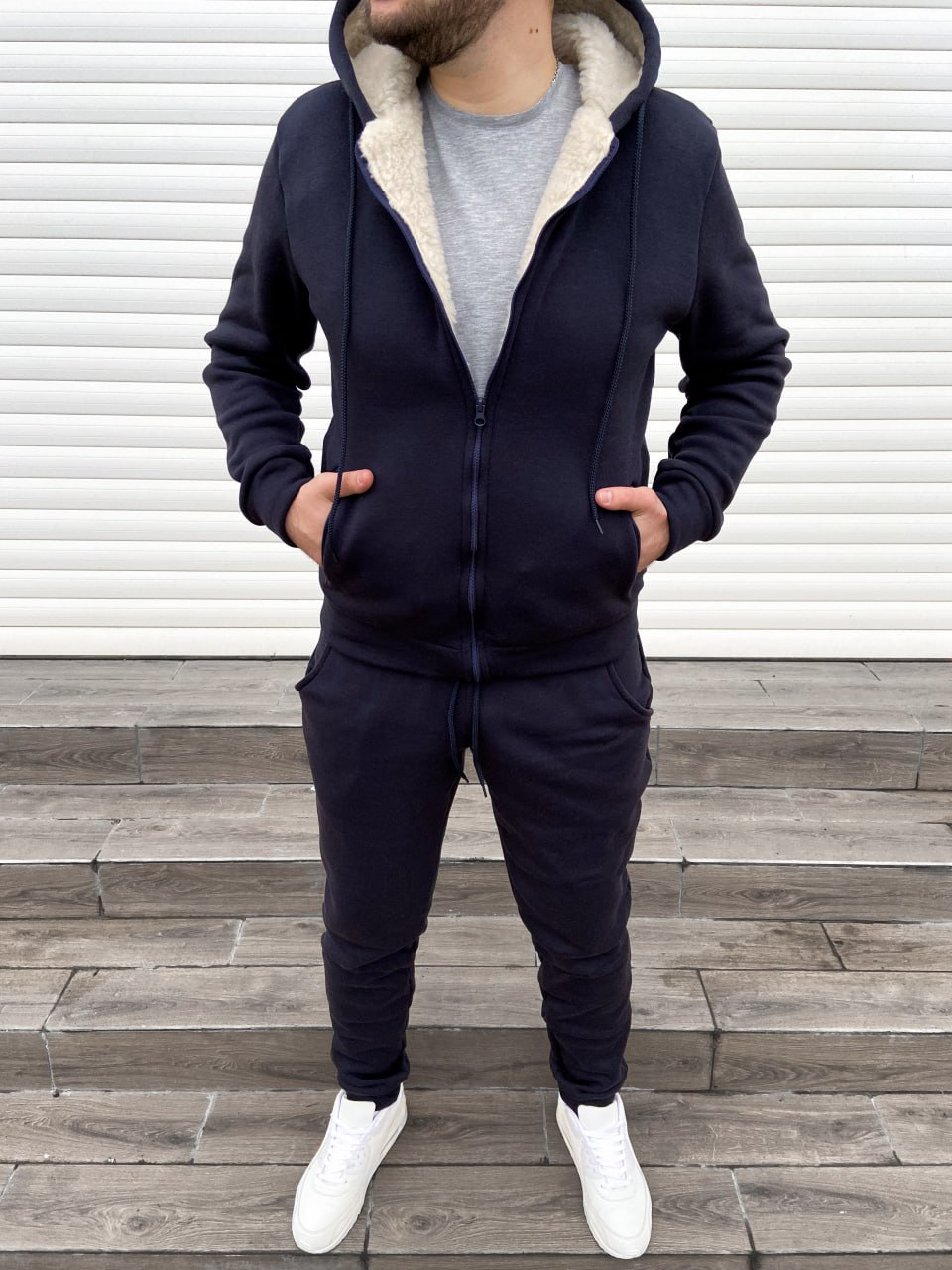 Чоловічий Теплий Темно-Синій Костюм на Хутрі та Флісі – Зіп Худі + Штани Джогери