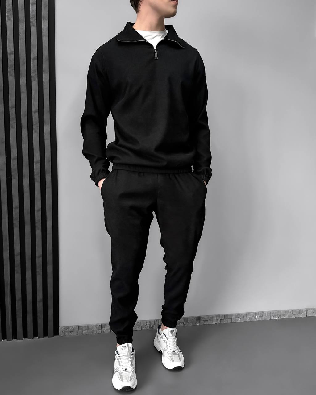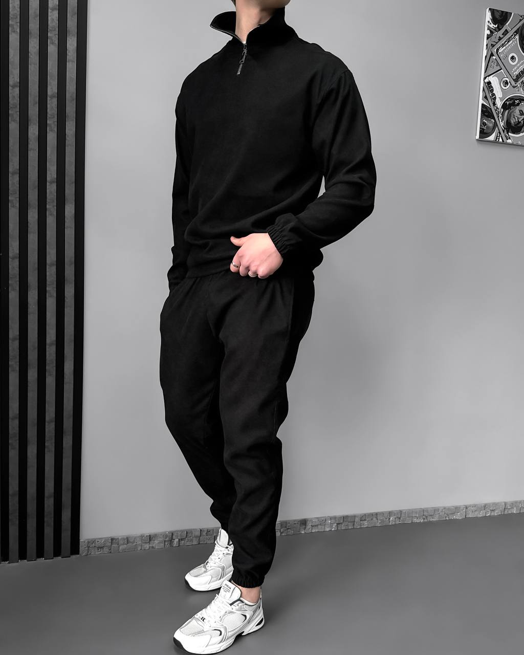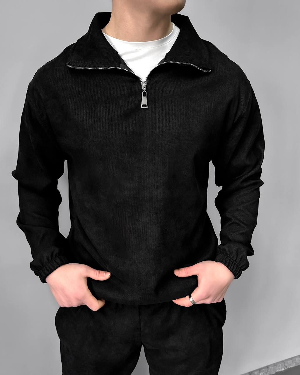 Чоловічий Вельветовий Чорний Костюм – Кофта із Зіп Коміром + Штани Джогери