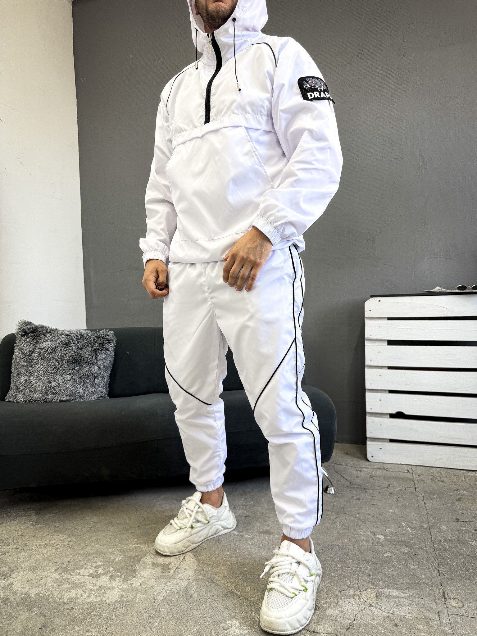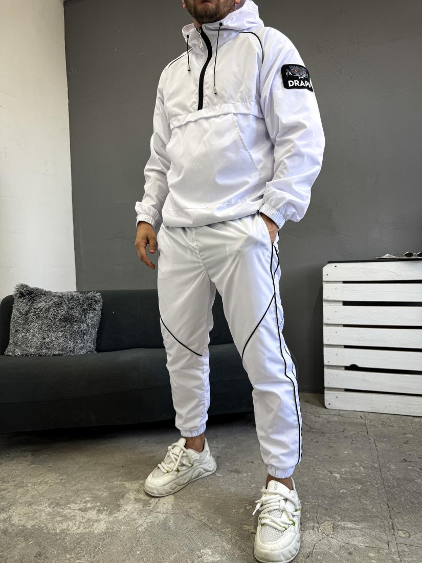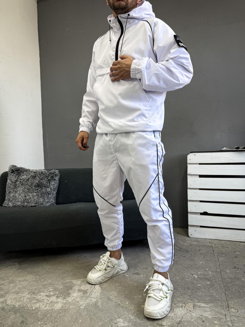 Чоловічий Вітрозахисний Білий Спортивний Костюм з Кантом та Нашивкою на Рукаві (Анорак + Джогери)