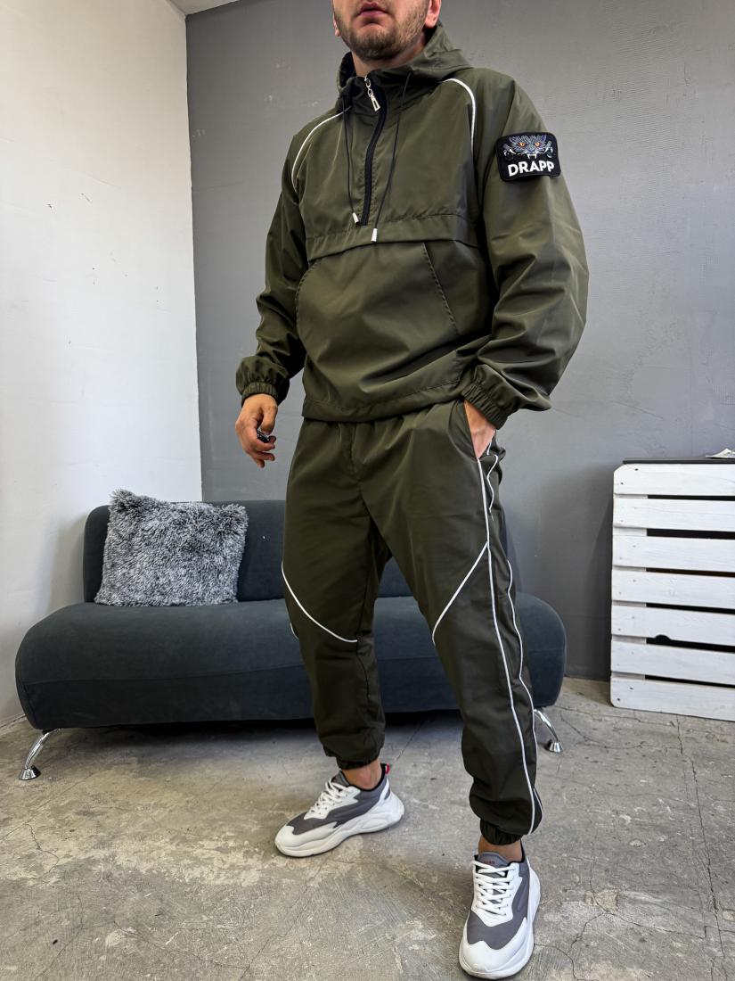 Чоловічий Вітрозахисний Спортивний Костюм Хакі з Кантом та Нашивкою на Рукаві (Анорак + Джогери)