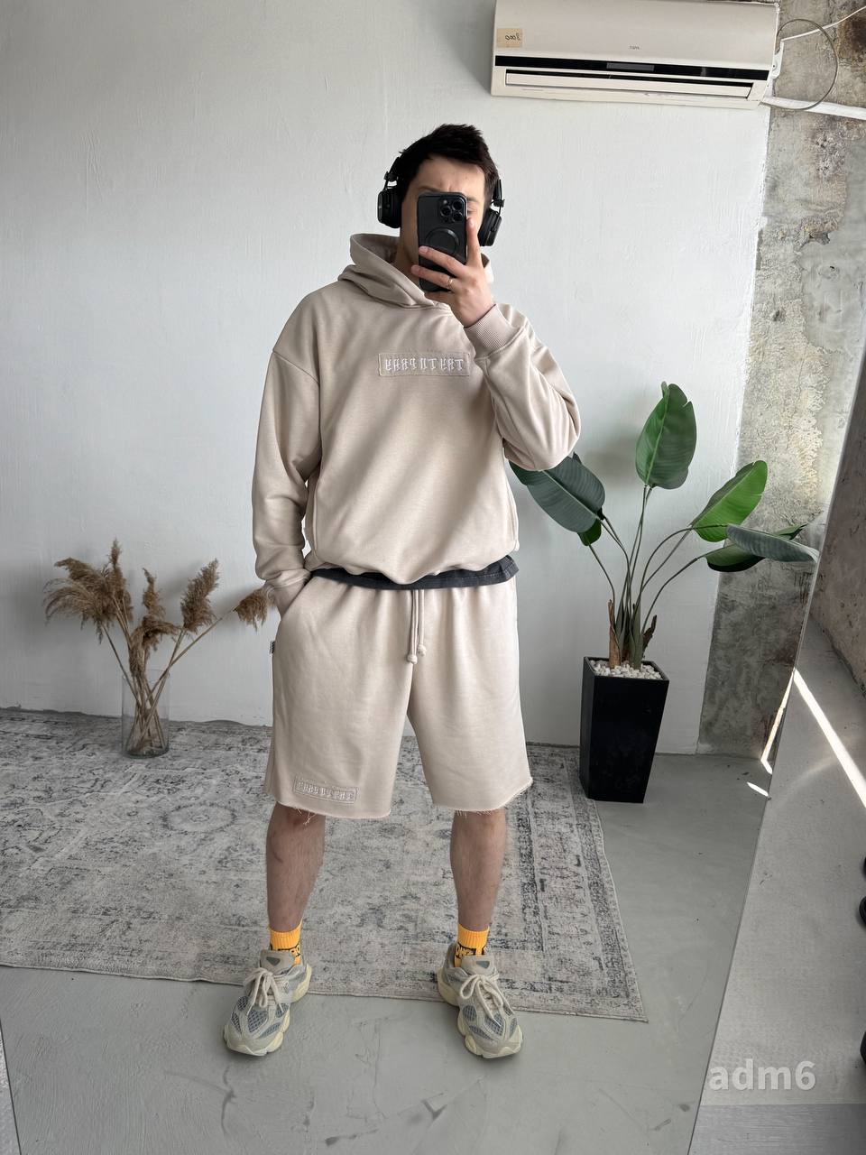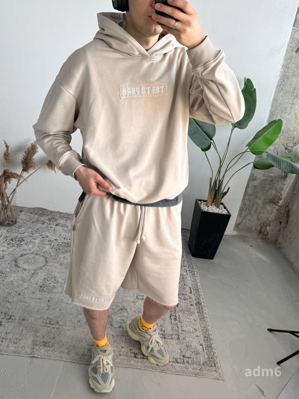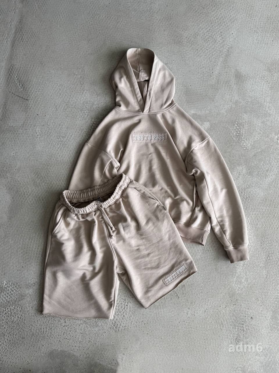 Чоловічий Бежевий Костюм Комплект Худі Шорти Оверсайз із Вишивкою на Спині