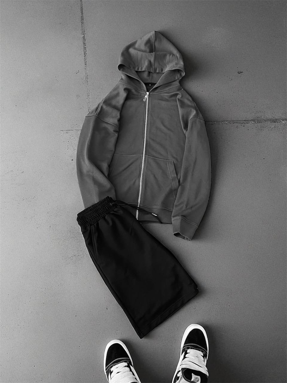Чоловічий Костюм на Блискавці з Капюшоном – Графітова Зіпка та Чорні Шорти