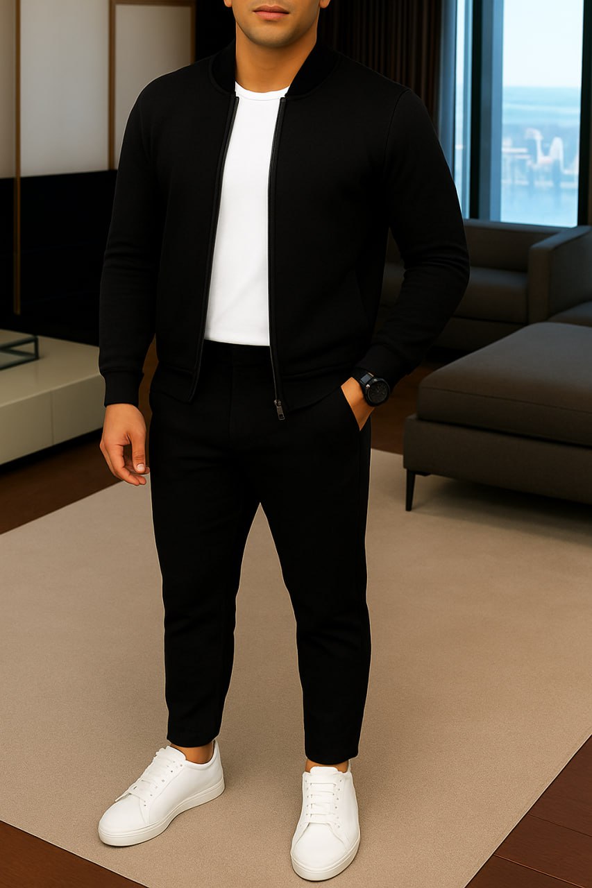 Чоловічий Замшевий Чорний Костюм на Блискавці (Бомбер + Брюки)