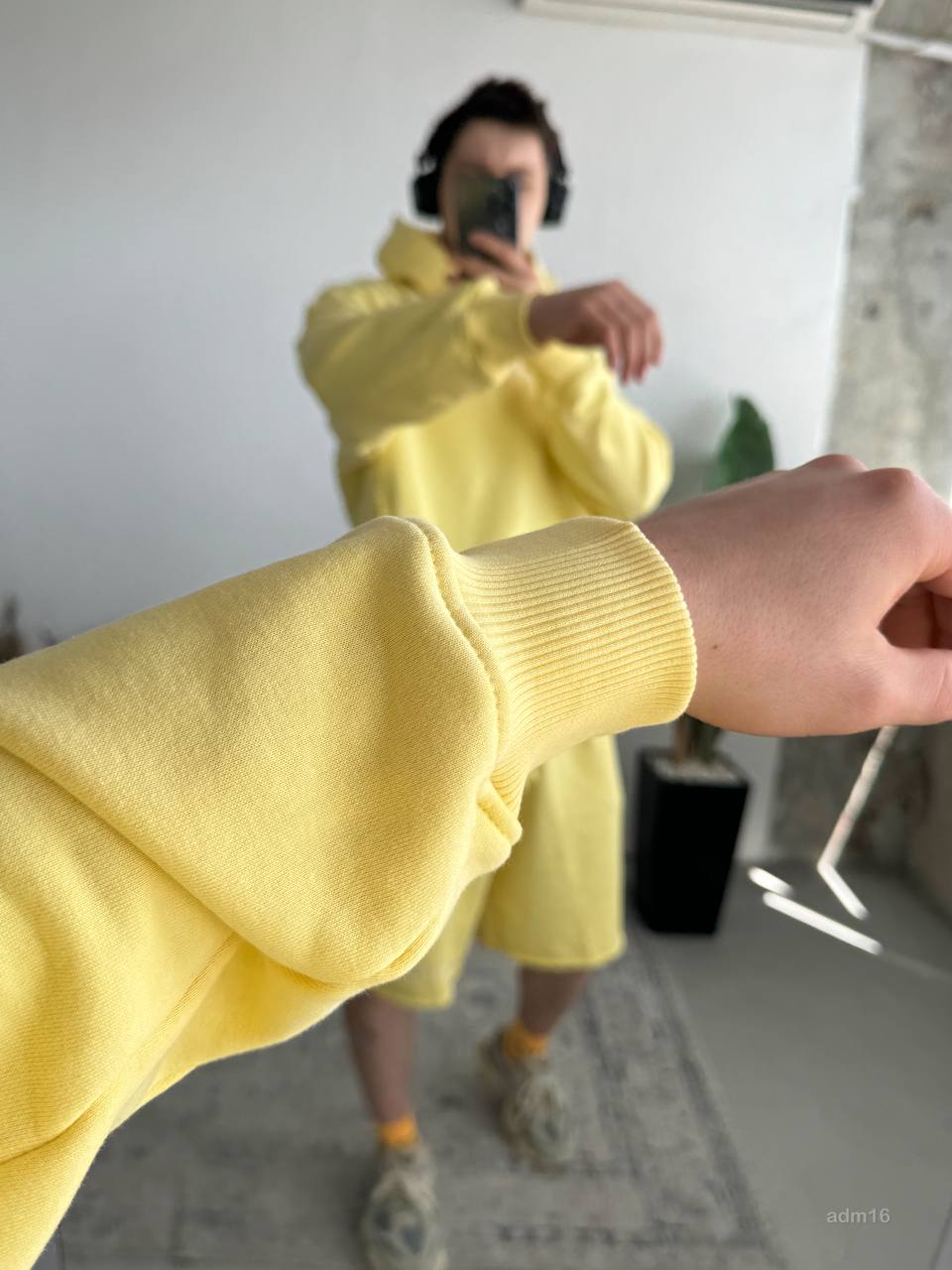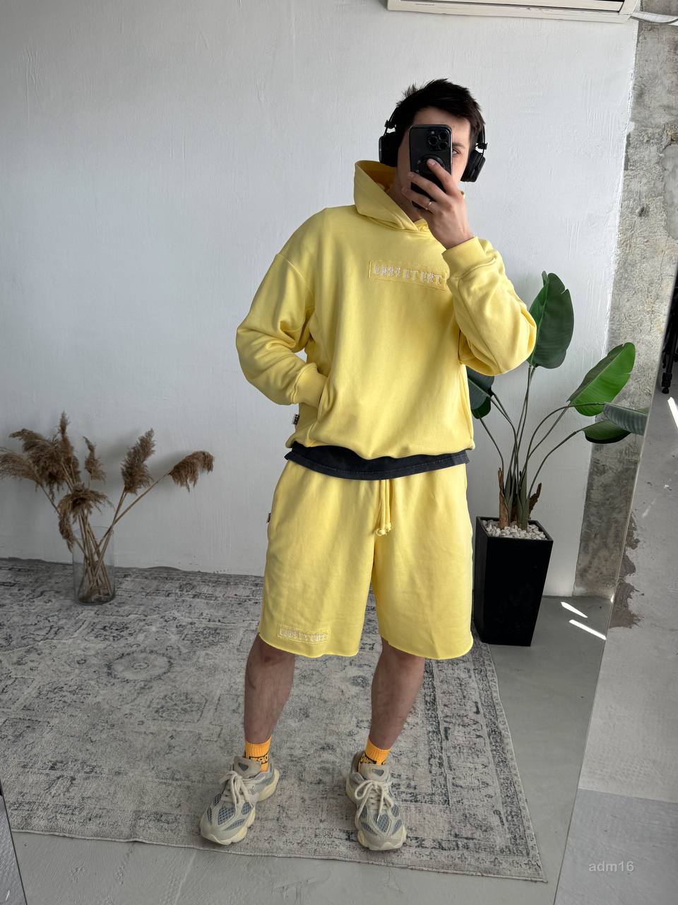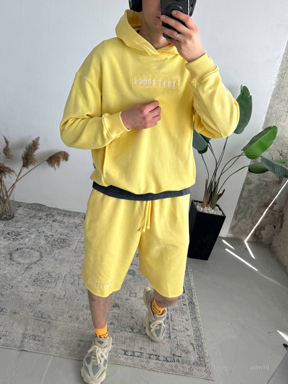 Чоловічий Жовтий Костюм Комплект Худі Шорти Оверсайз із Вишивкою на Спині