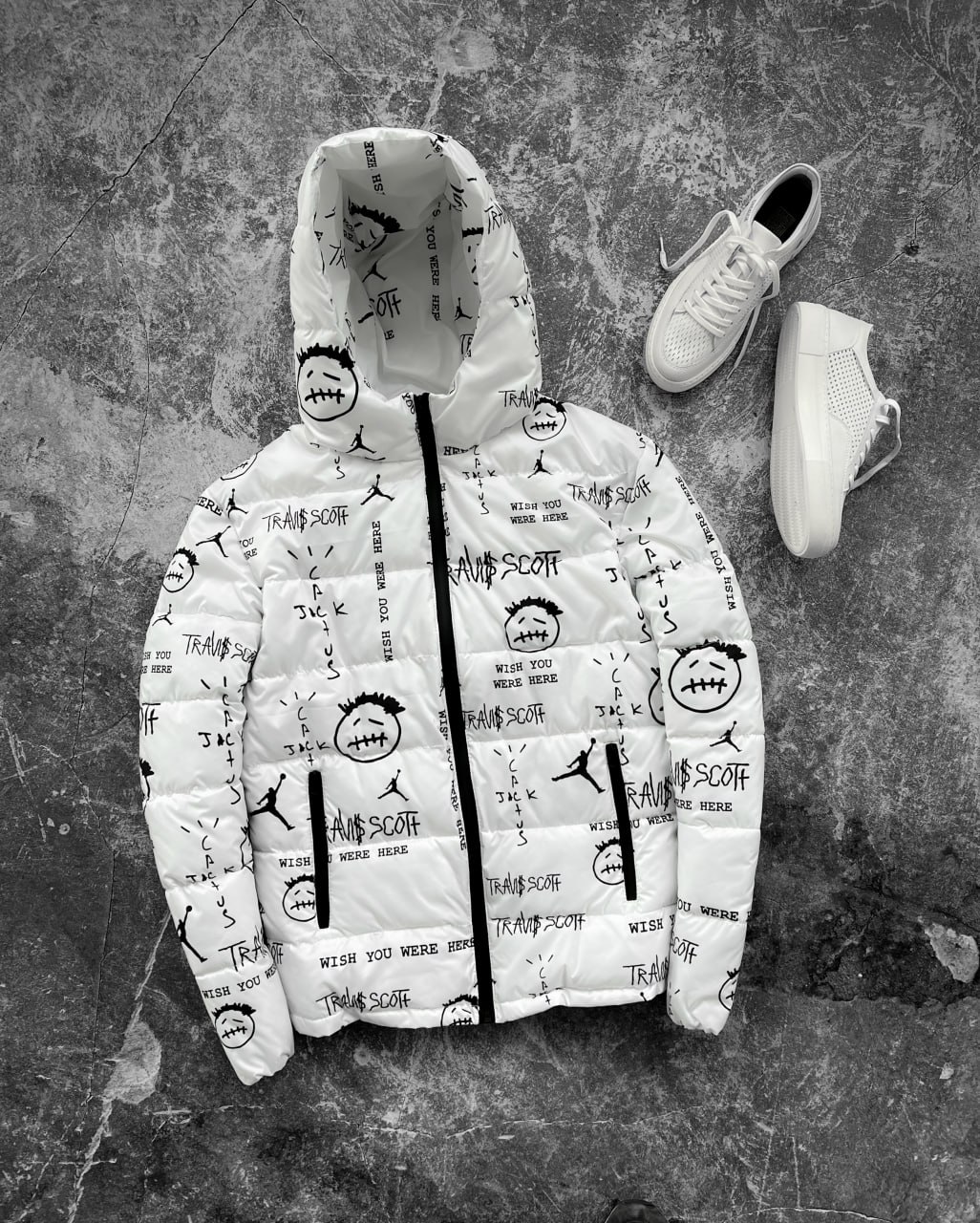 Чоловіча Демісезонна Біла Куртка – Стьобана в Модний Принт з Капюшоном та Манжетами на Резинках